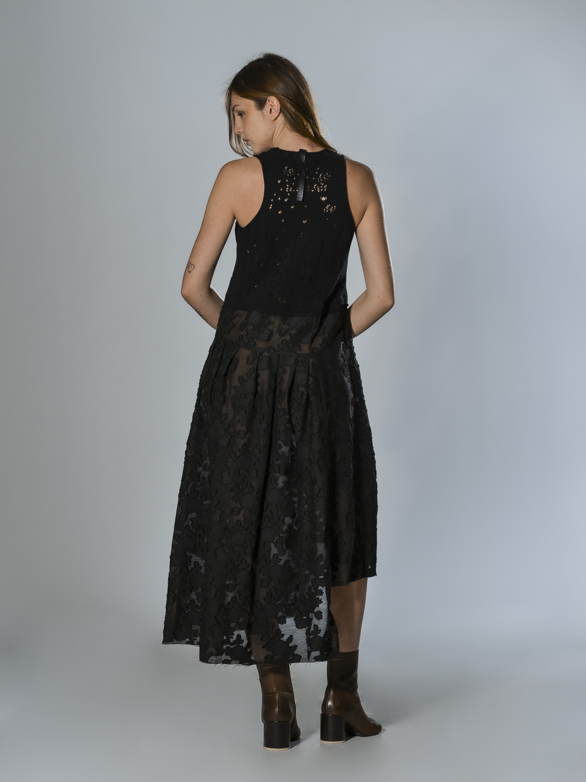 Long, sleeveless flared dress with a lace-knit bodice embellished with small hand-applied tassels. The lower half features a full, burnt-out cotton skirt with a tone-on-tone floral design. The asymmetrical hem features a raw-cut finish, adding movement and lightness to the silhouette.