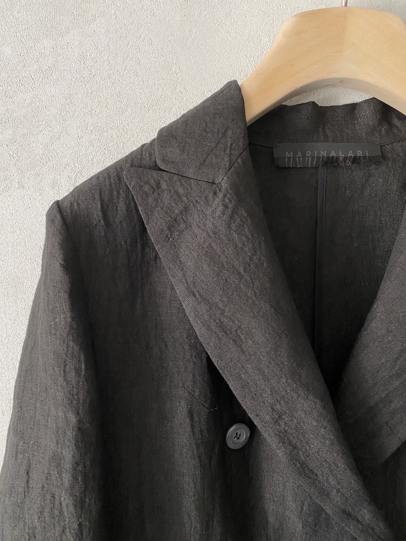 Double-breasted jacket made of herringbone wool and cashmere fabric, lined shoulders and sleeves, spear collar, closed with 6 buttons + 1 mother-of-pearl inside, 2 welt side pockets with flap, sleeve at wrist with slit, high slit at center back. Size 38 measurements: length 65 cm, chest circumference 90 cm. The measurements of subsequent sizes will increase by 1 cm in length and 4 cm in circumference.