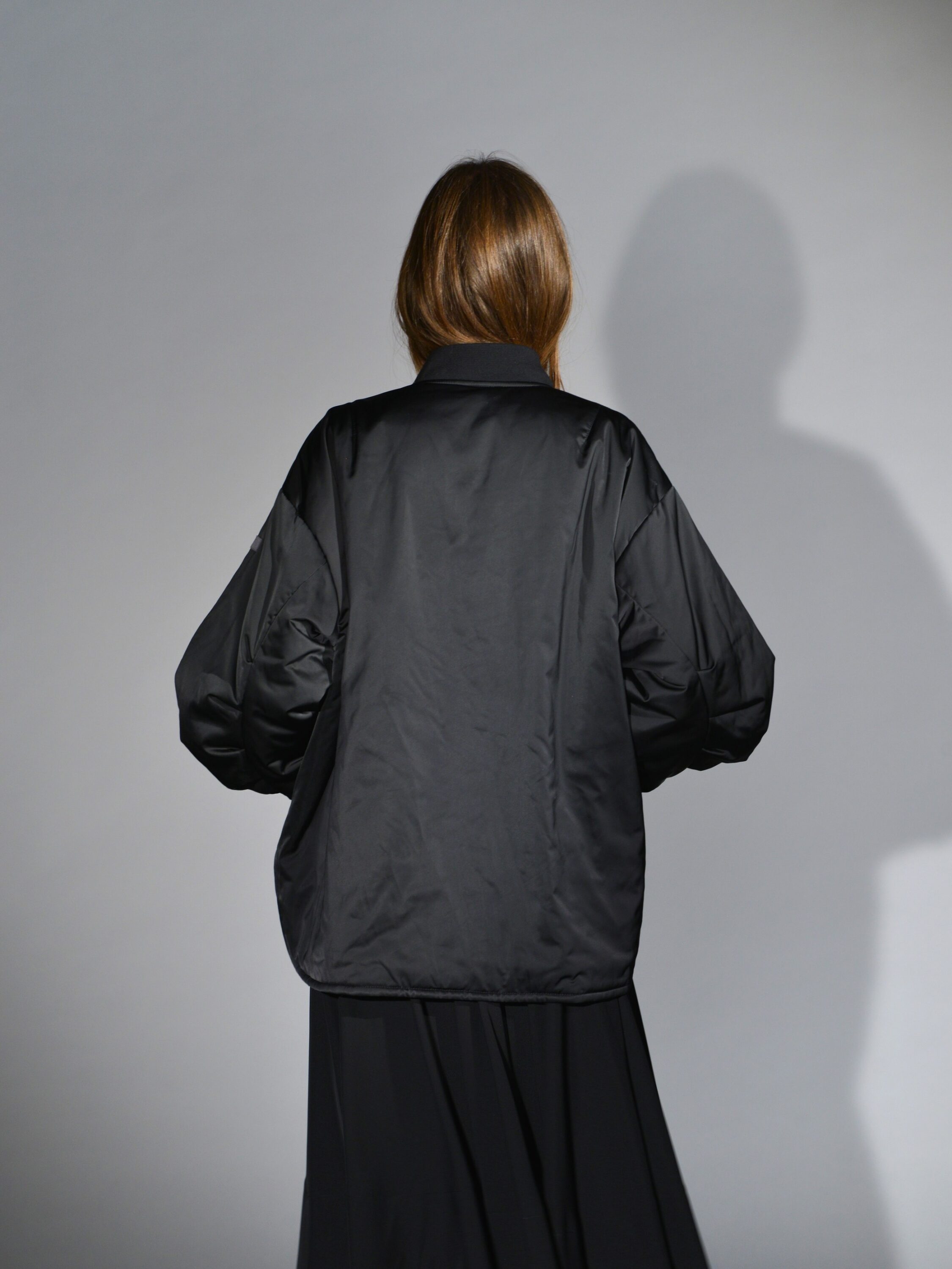Lightweight oversized padded bomber jacket constructed internally with thermal material, fully lined, closed at center front with double-slider zipper, two slanted welt pockets closed with flap and snap, wide sleeve with pleated pattern and narrow knit cuff, rounded hem at sides, dropped shoulder. Size XS/S measurements: length 72 cm, width 68 cm. Next size measurements will increase by 2 cm in length and 6 cm in circumference.