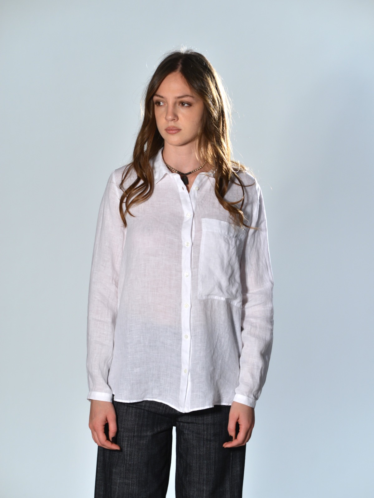 Oversize unlined jacket in cotton, wool and linen herringbone fabric, center front closure with 5 buttonholes and buttons, two large front pockets with double side pocket and flap, dropped shoulder. Length 65 cm, width 62 cm. The next size measurements will increase by 3 cm in length and 6 cm in circumference.