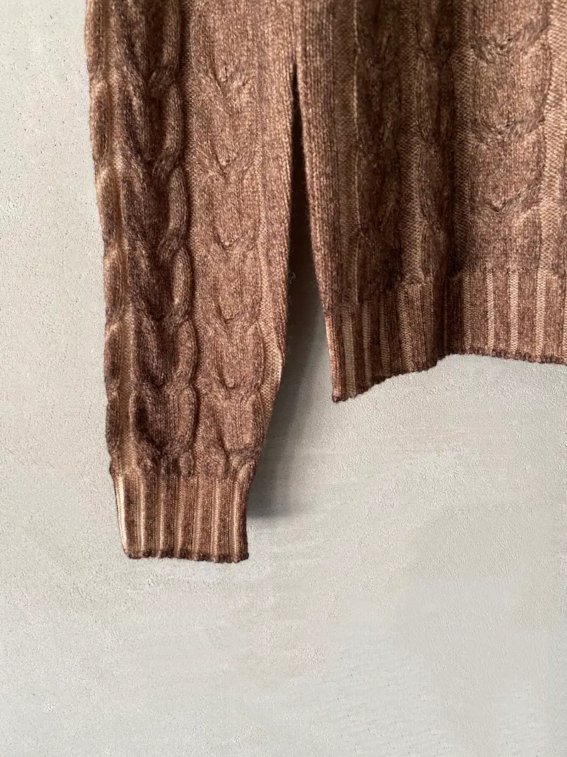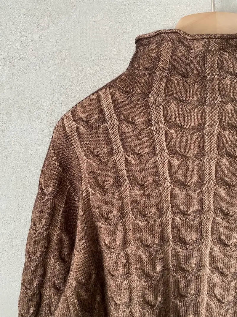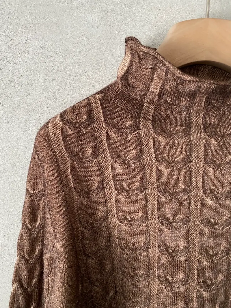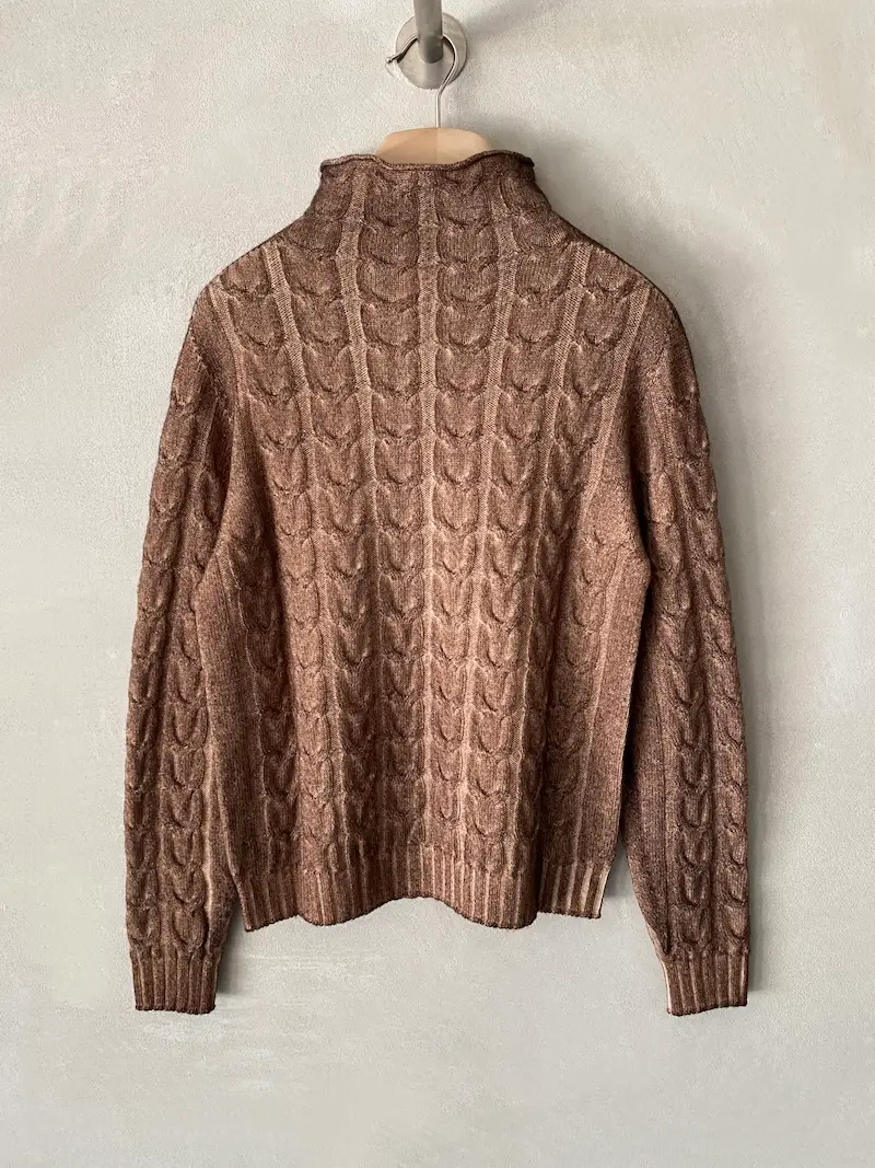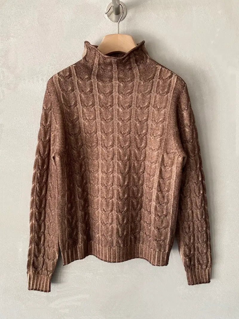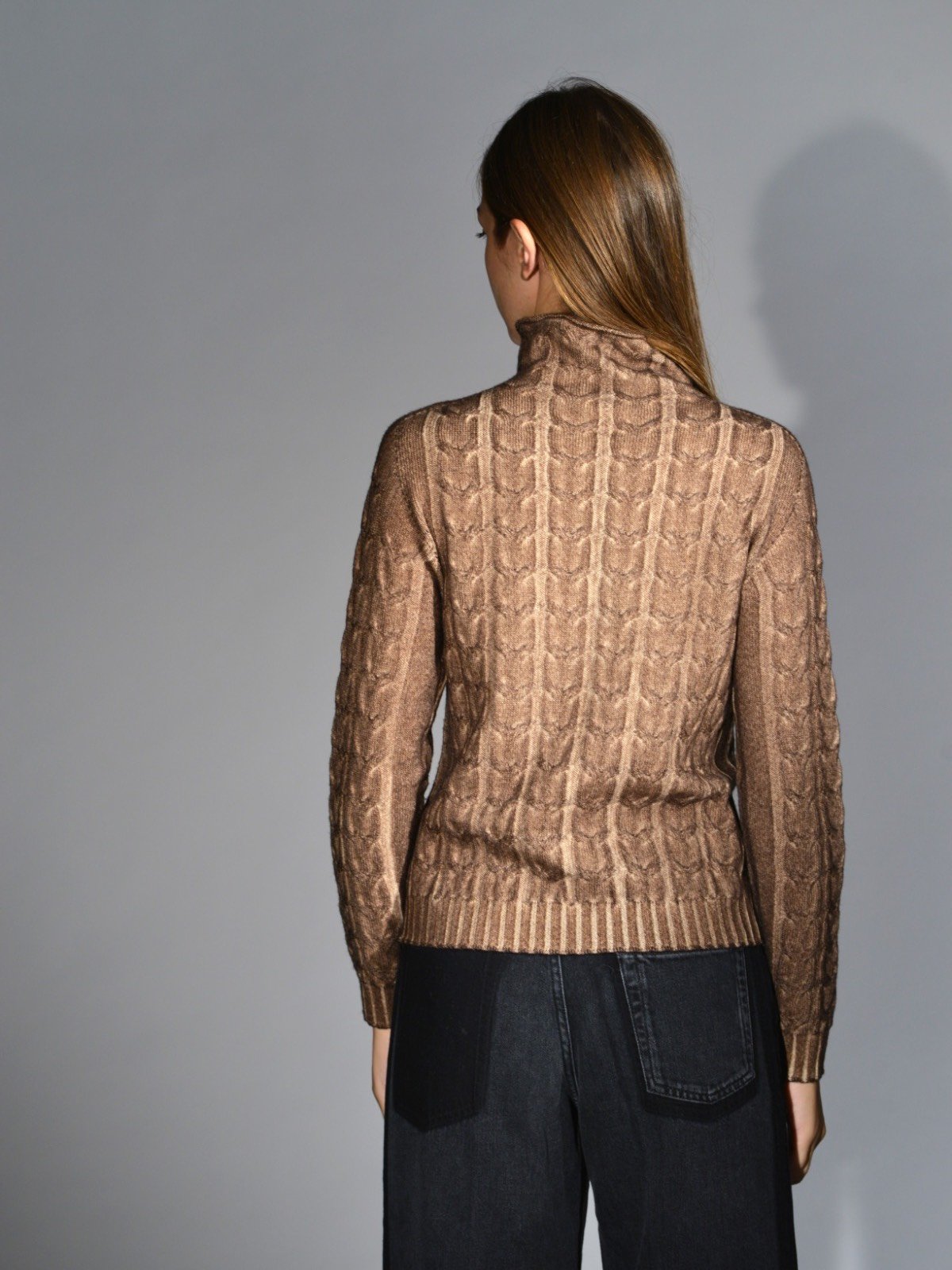 Extra-fine merino wool cable-knit sweater, hand-painted, turtleneck, long sleeves, regular fit. Misure taglia S: lunghezza 58 cm, larghezza 46 cm. Later size measurements will increase by 2 cm in length and 4 cm in circumference.
