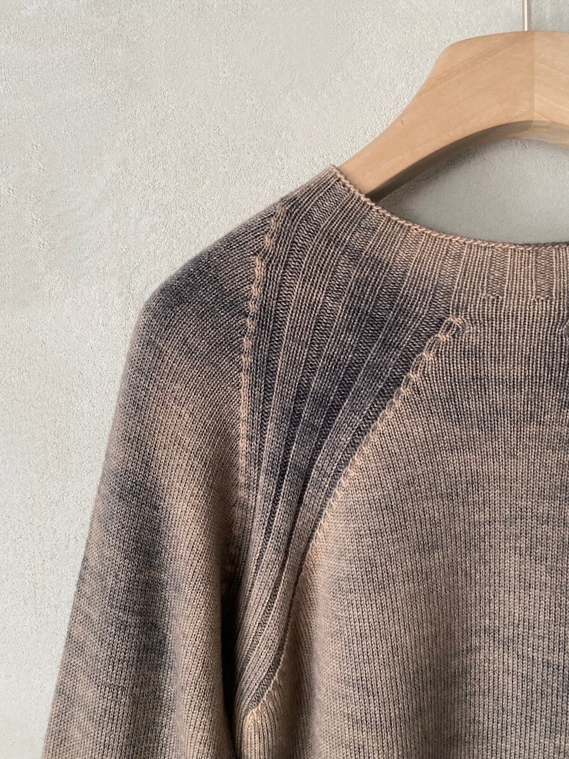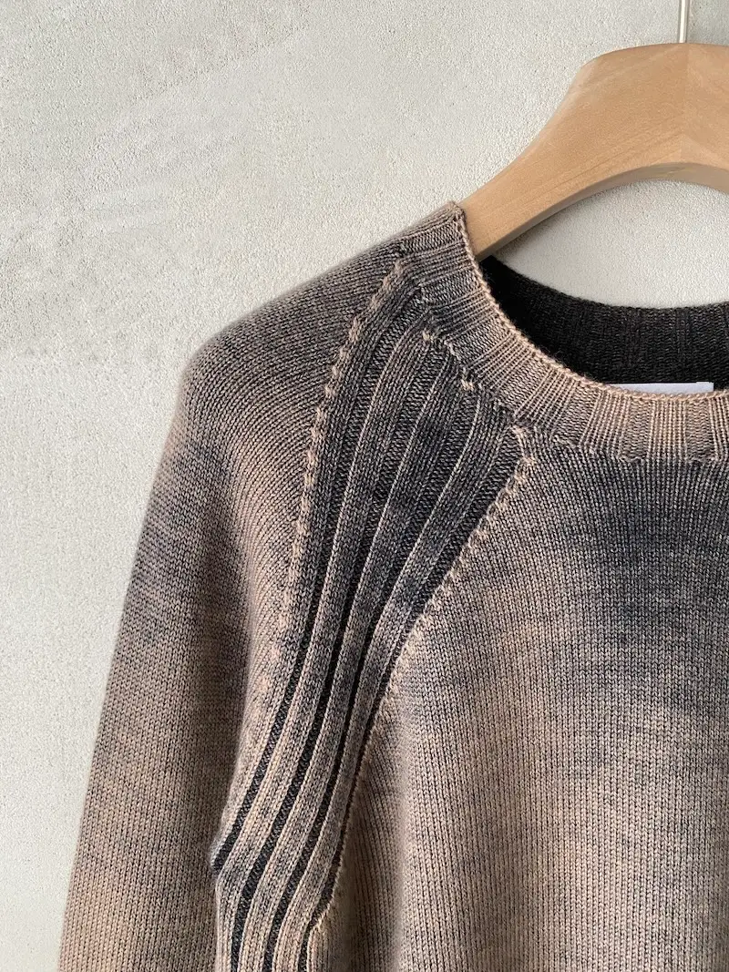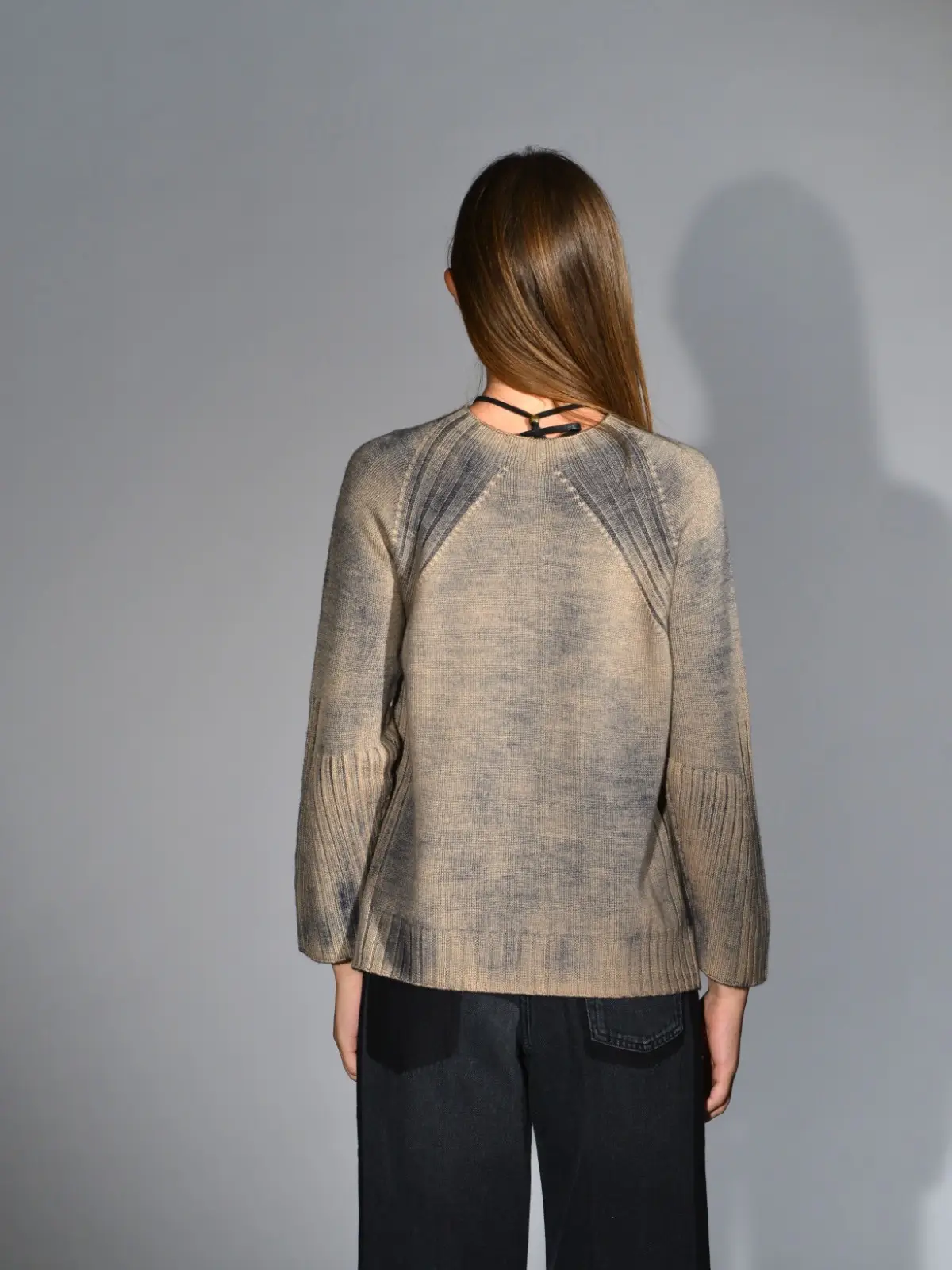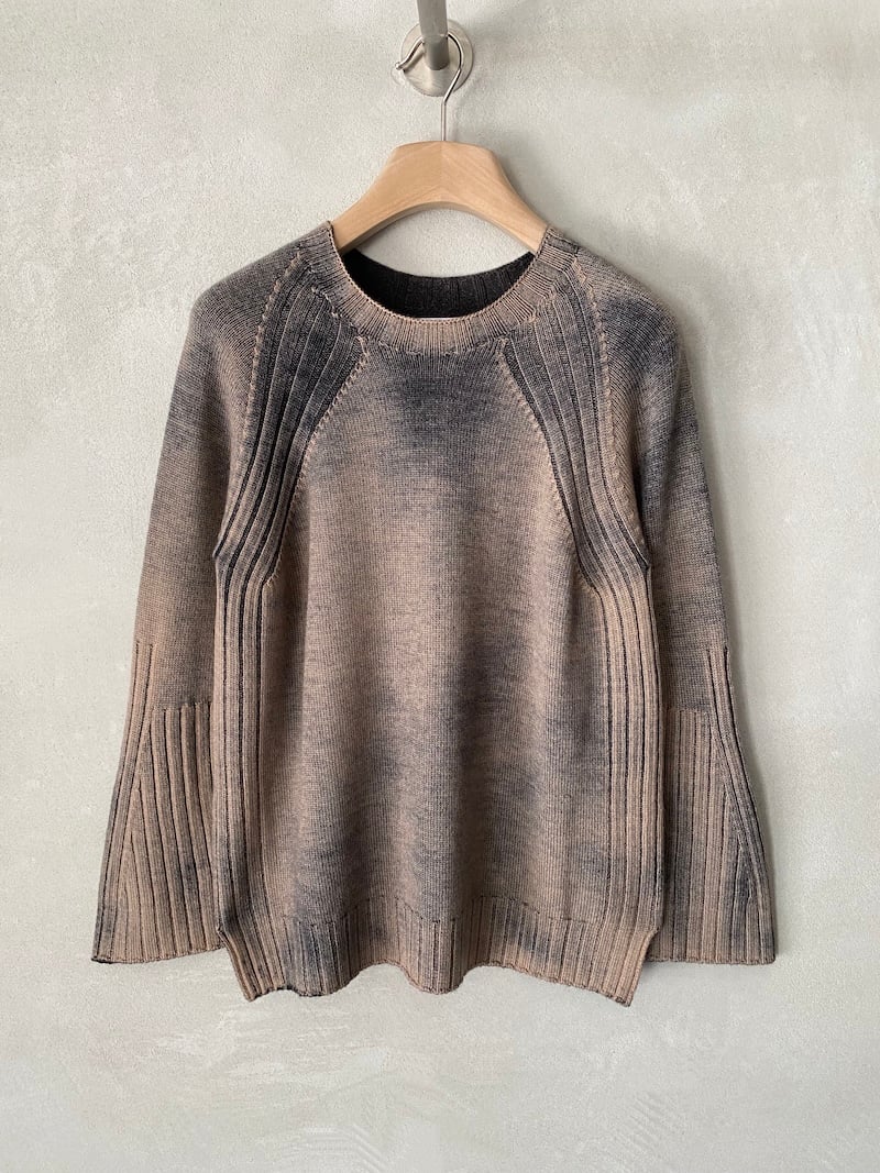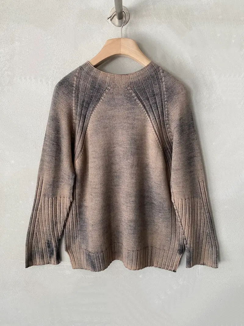 Hand-painted extra-fine merino wool sweater, round neckline, long raglan sleeve, regular fit. Size S measurements: length 62 cm, width 48 cm. Later size measurements will increase by 2 cm in length and 4 cm in circumference.