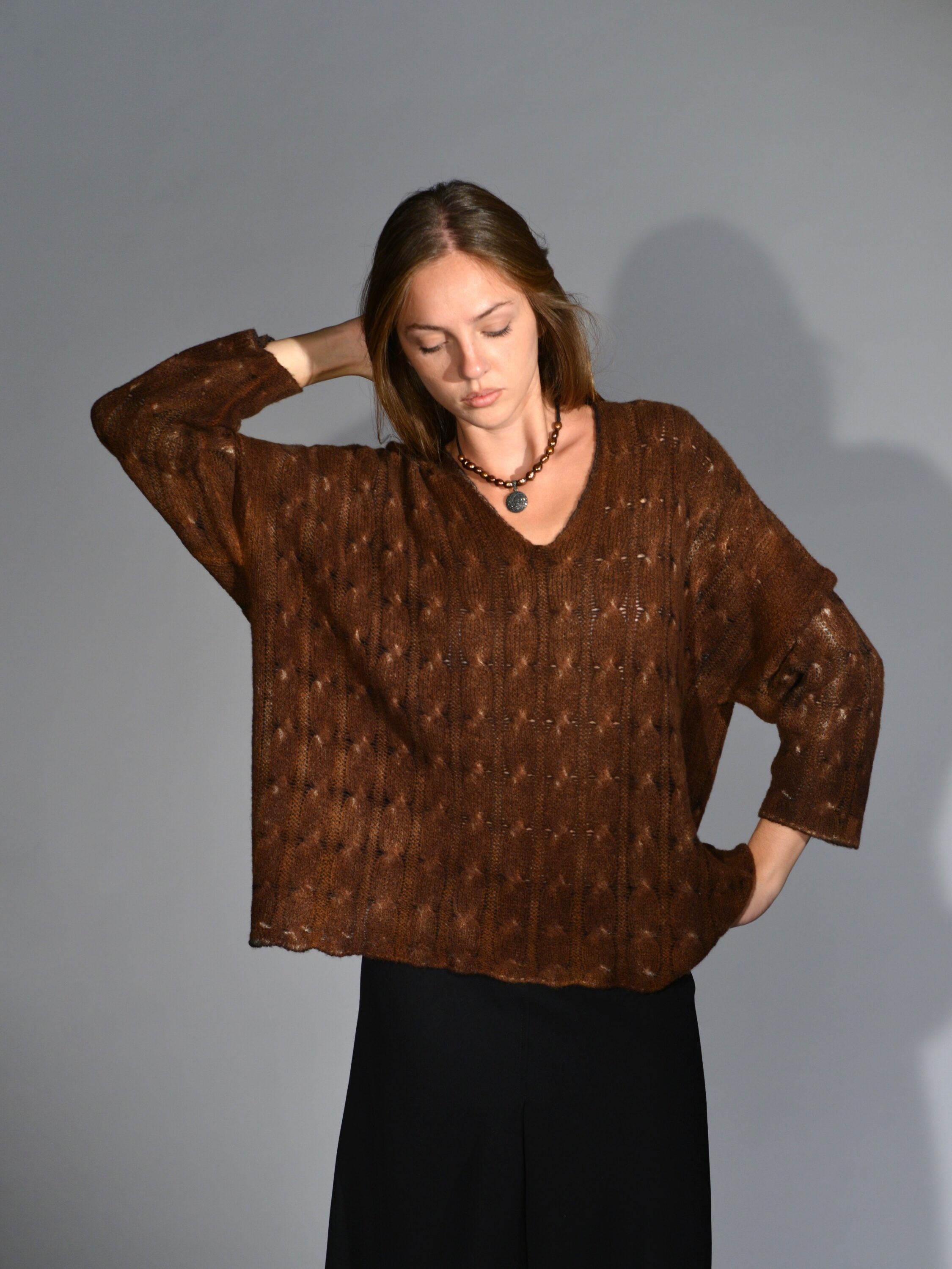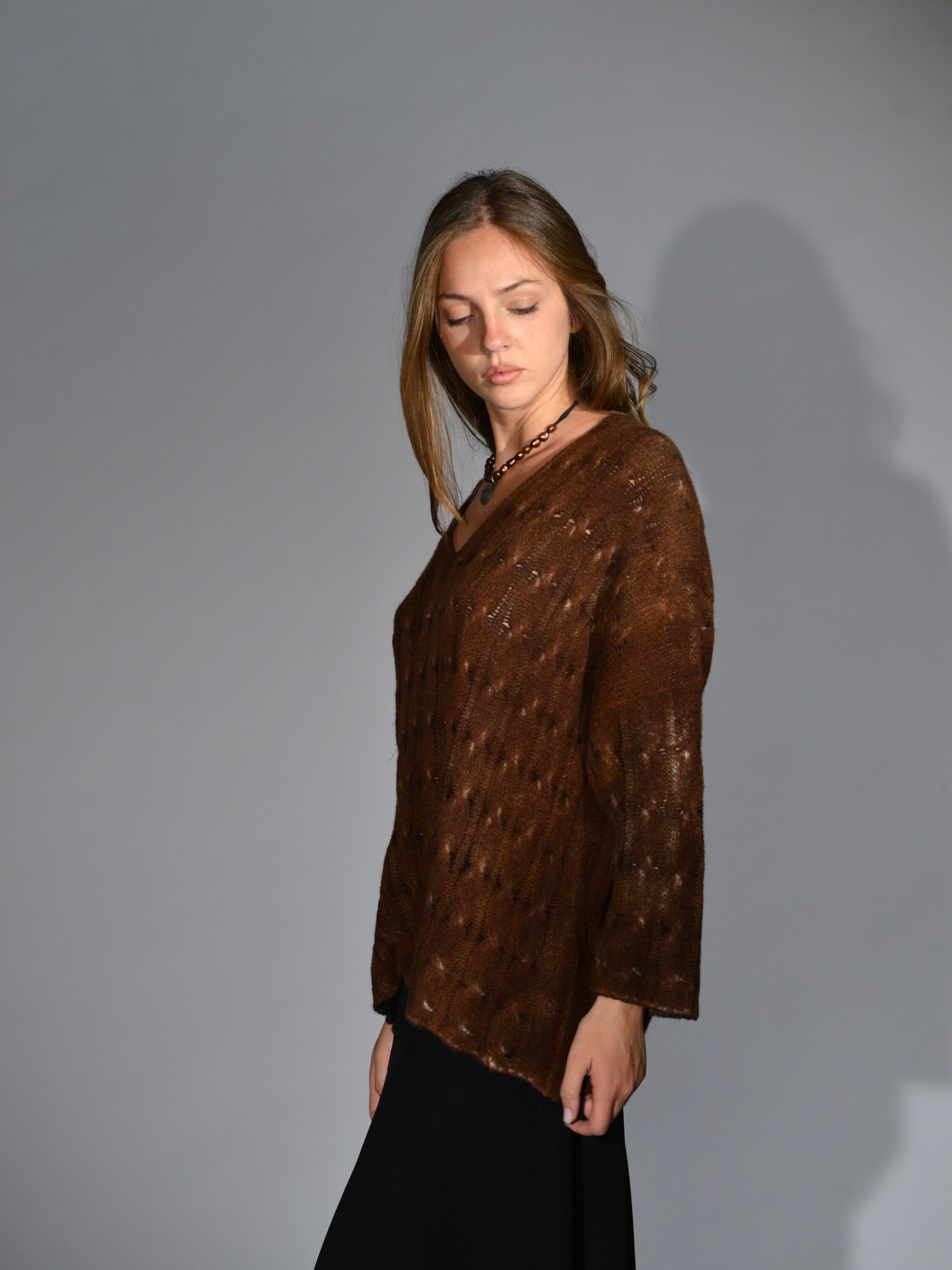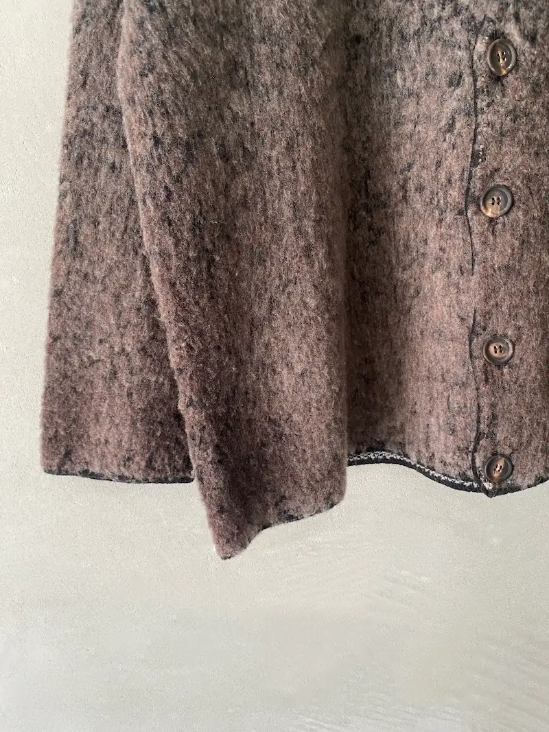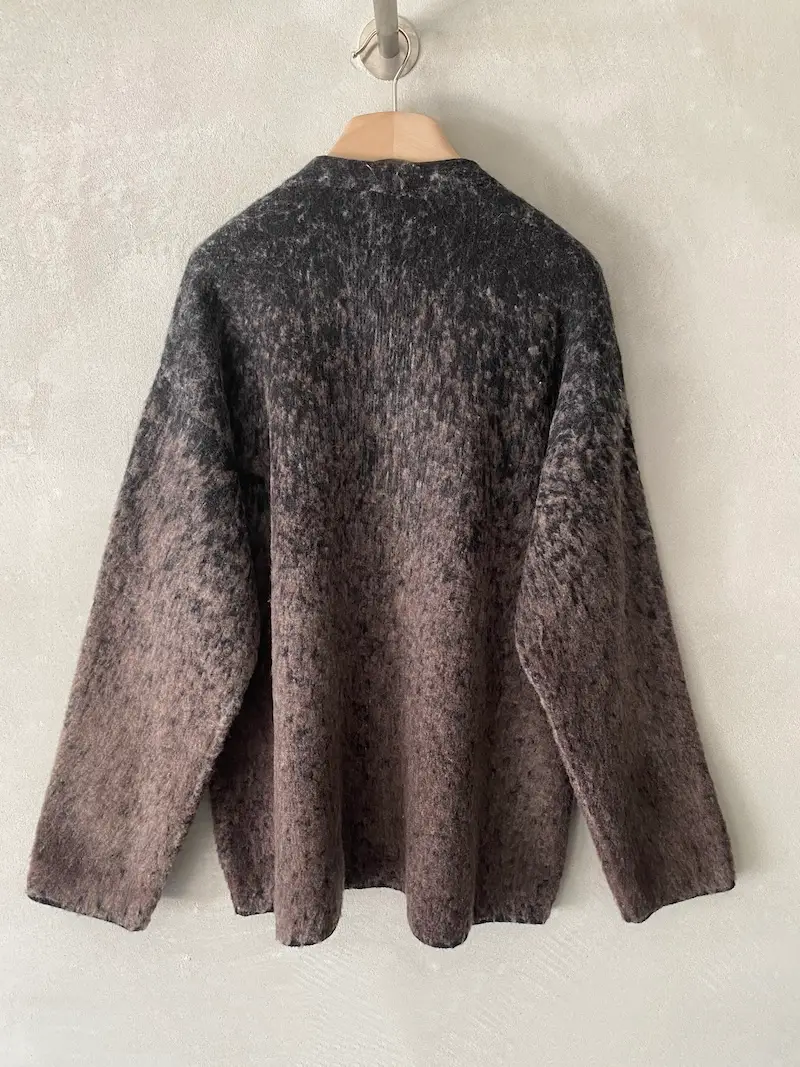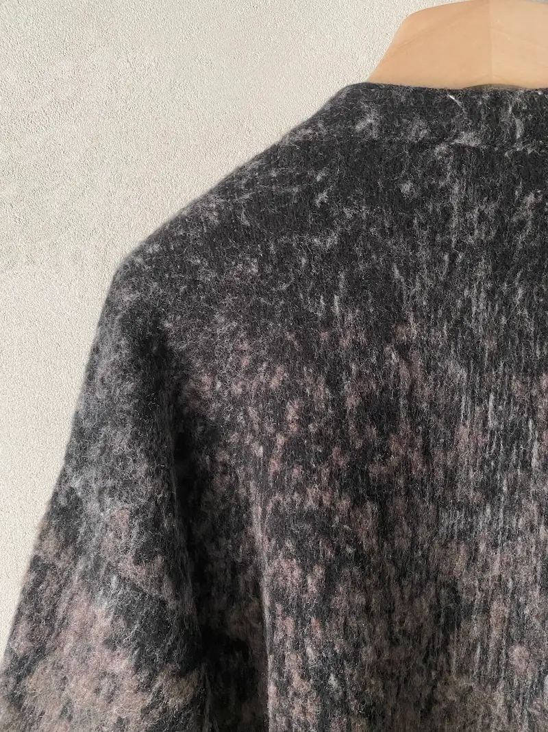 Hand-painted jaquard knit oversize cardigan, center front closure with 4 buttonholes and buttons, deep V-neck. Measurements: length 70 cm, chest width 66 cm. ONE SIZE