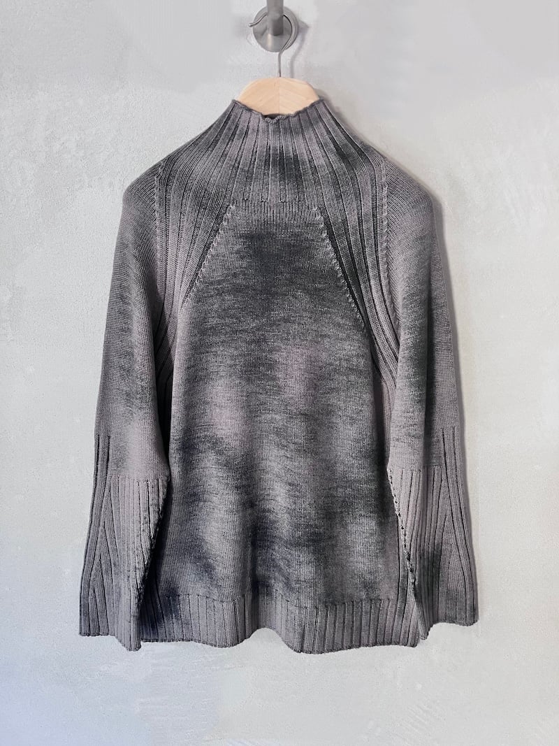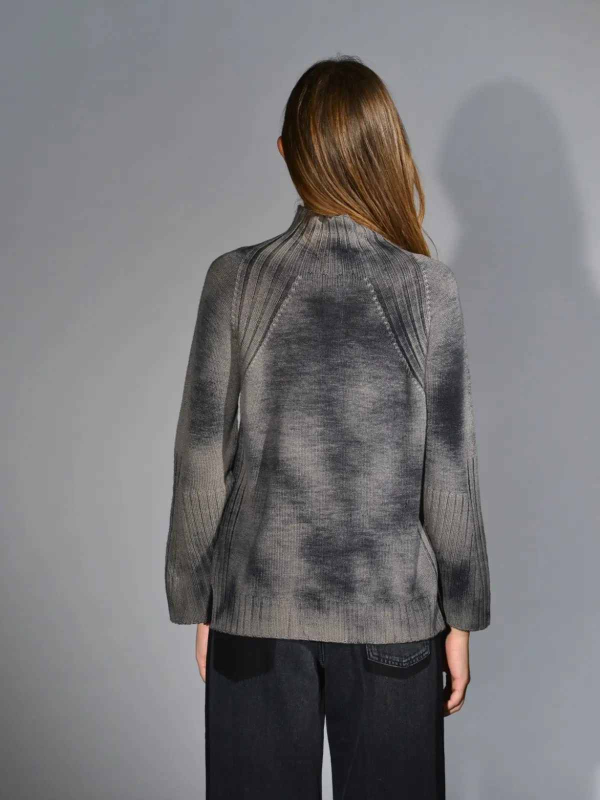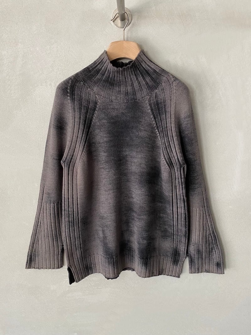 Hand-painted extra-fine merino wool sweater, mock neck, long raglan sleeve, regular fit. Size S measurements: length 64 cm, width 49 cm. Later size measurements will increase by 2 cm in length and 4 cm in circumference.