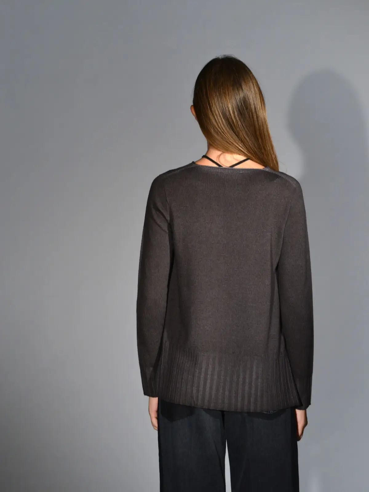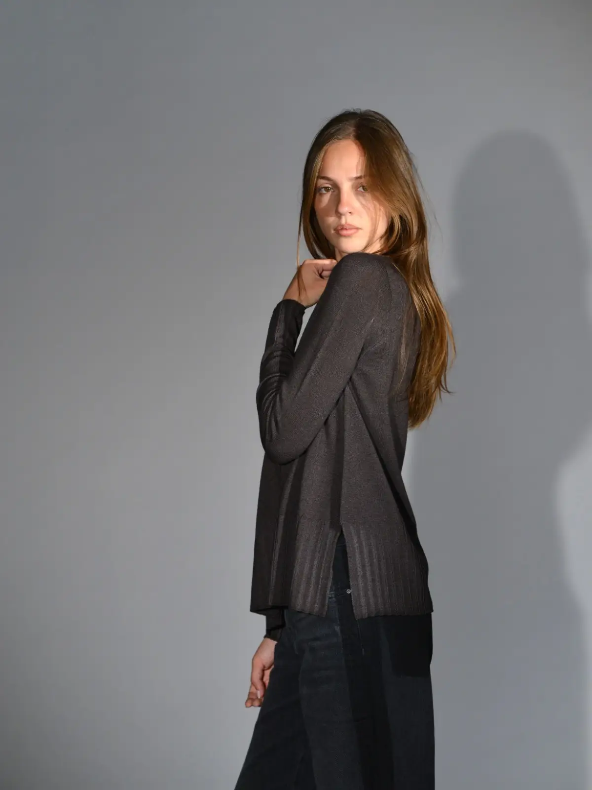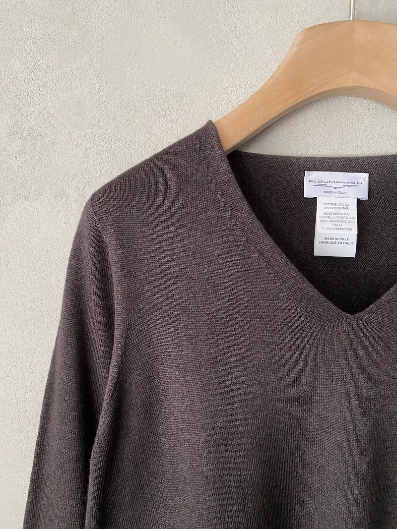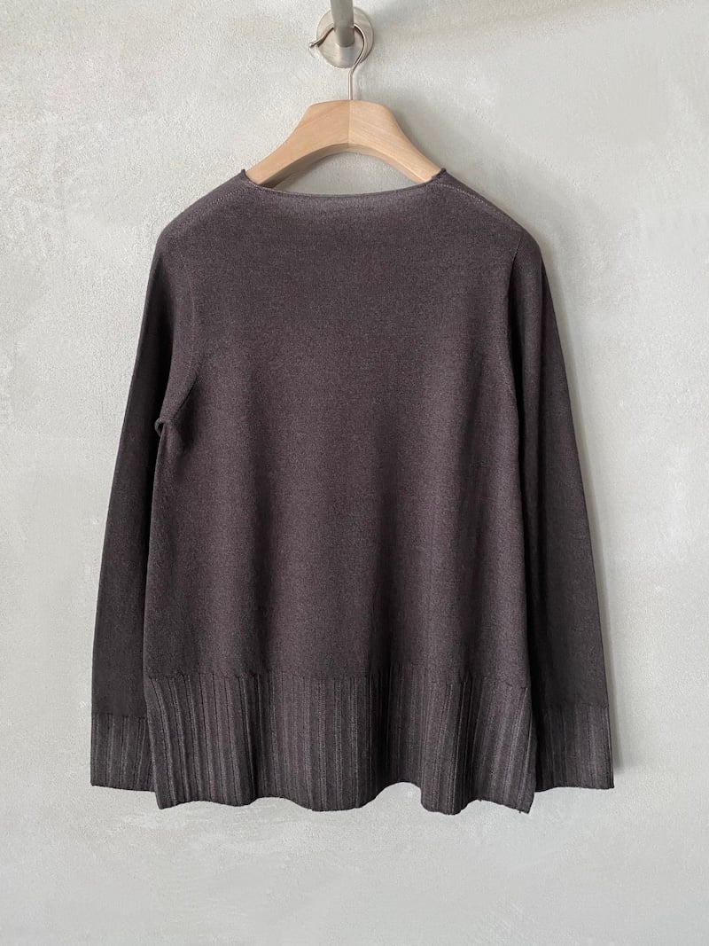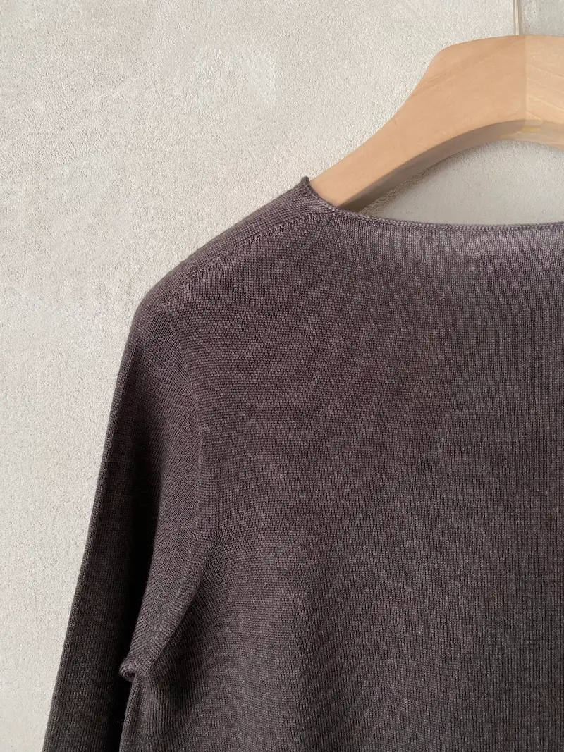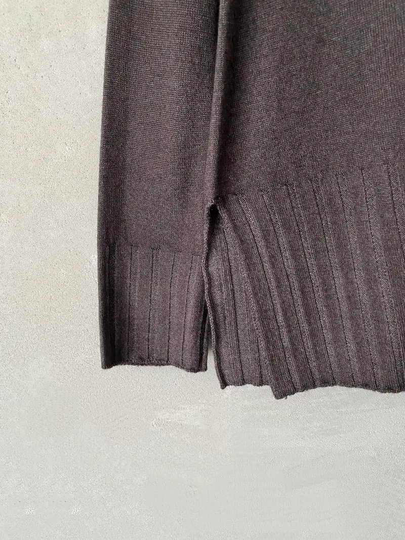 Extra-fine merino wool sweater, V-neck, long sleeve, side slits. Size S measurements: length 70 cm, width 48 cm. Later size measurements will increase by 2 cm in length and 4 cm in circumference.