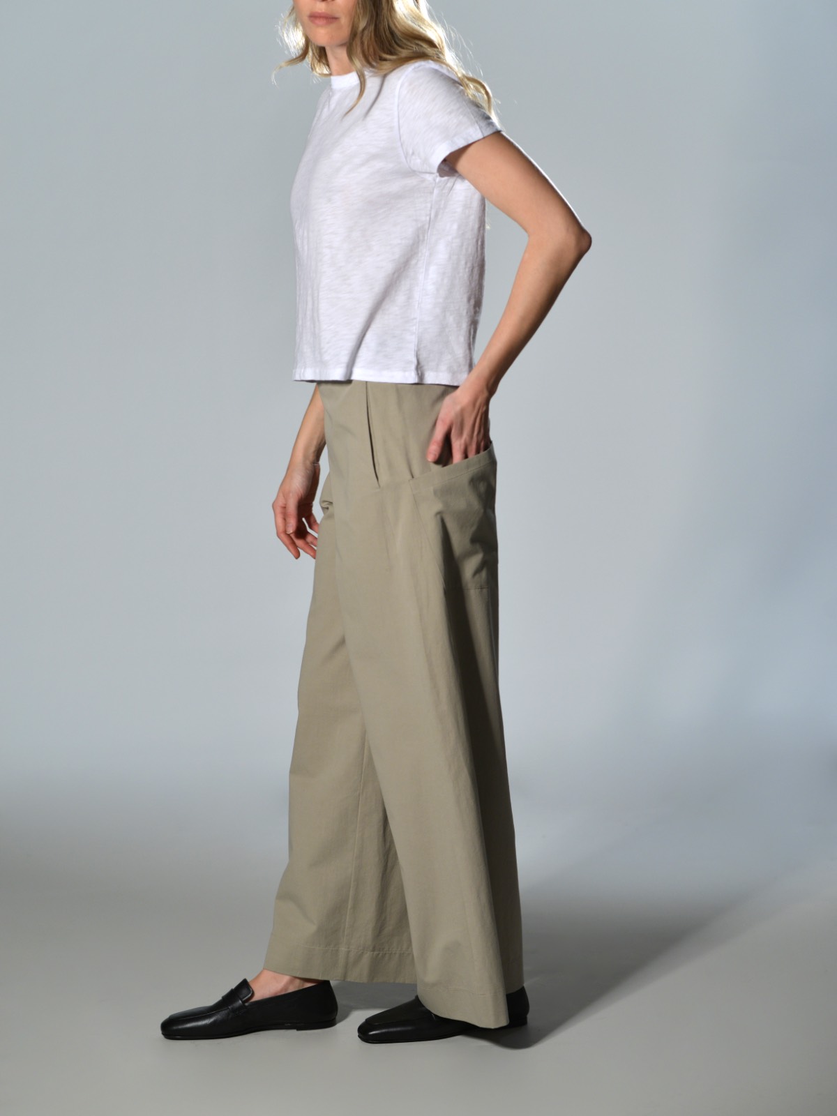 Pantaloni gamba larga in seta e cotone tinto in capo con vita elasticizzata e coulisse, tasche laterali oblique e fondo con orlo alto 25 cm, colore nero – Barbara Tani