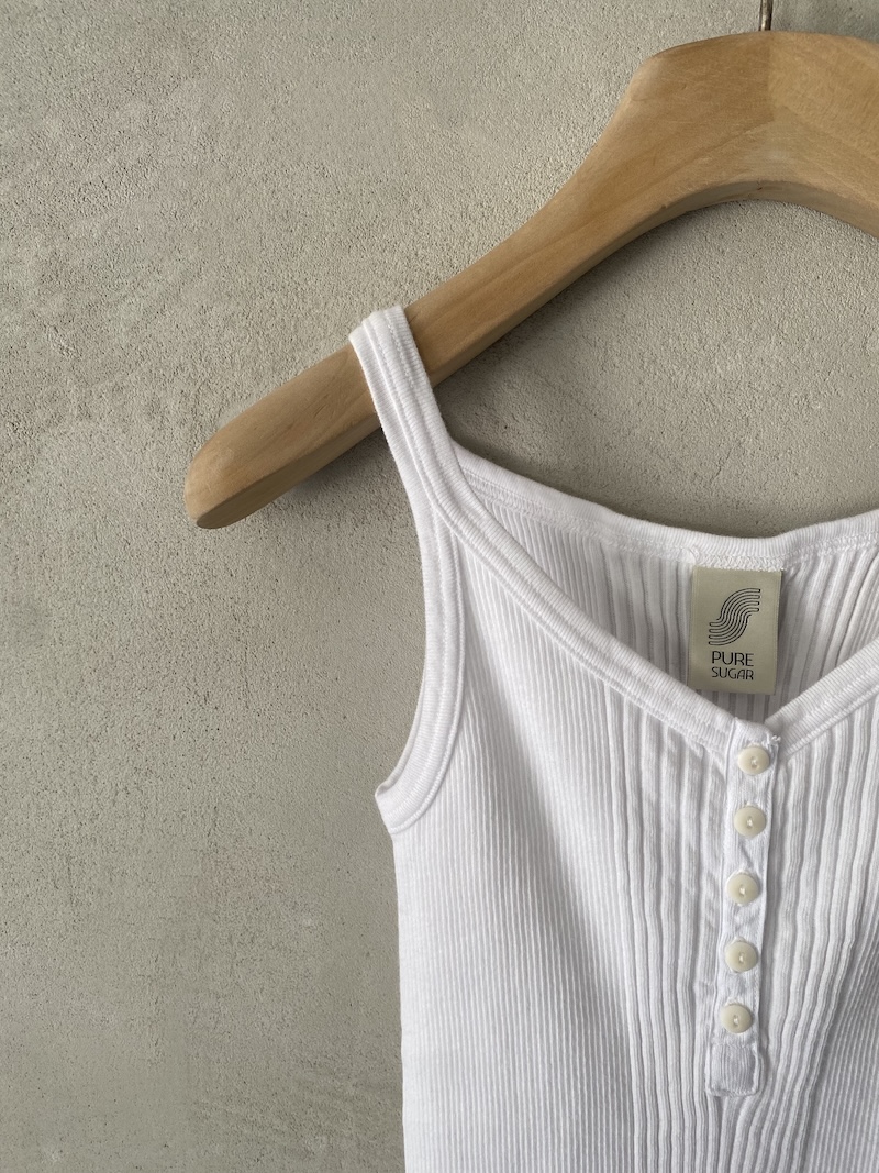 Canotta in jersey di cotone a costine. Presenta scollo rotondo, spalla regolare con spalline larghe, senza maniche, linea aderente con volume slim, fondo dritto. Vestibilità aderente. La larghezza non è definibile poiché la lavorazione a costine si adatta al corpo, espandendosi e restringendosi in base alla vestibilità.