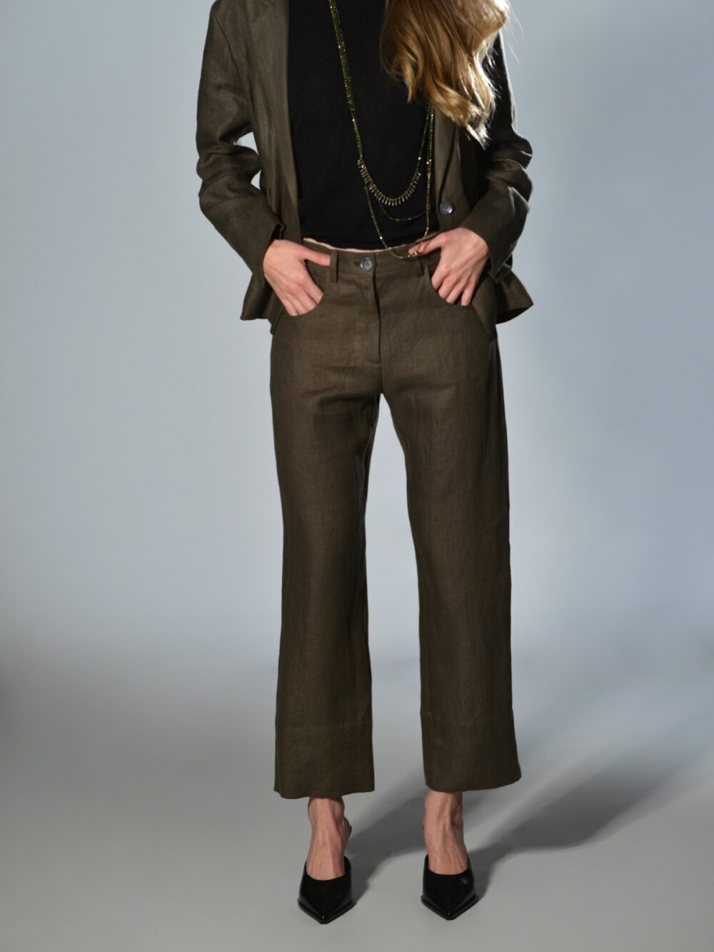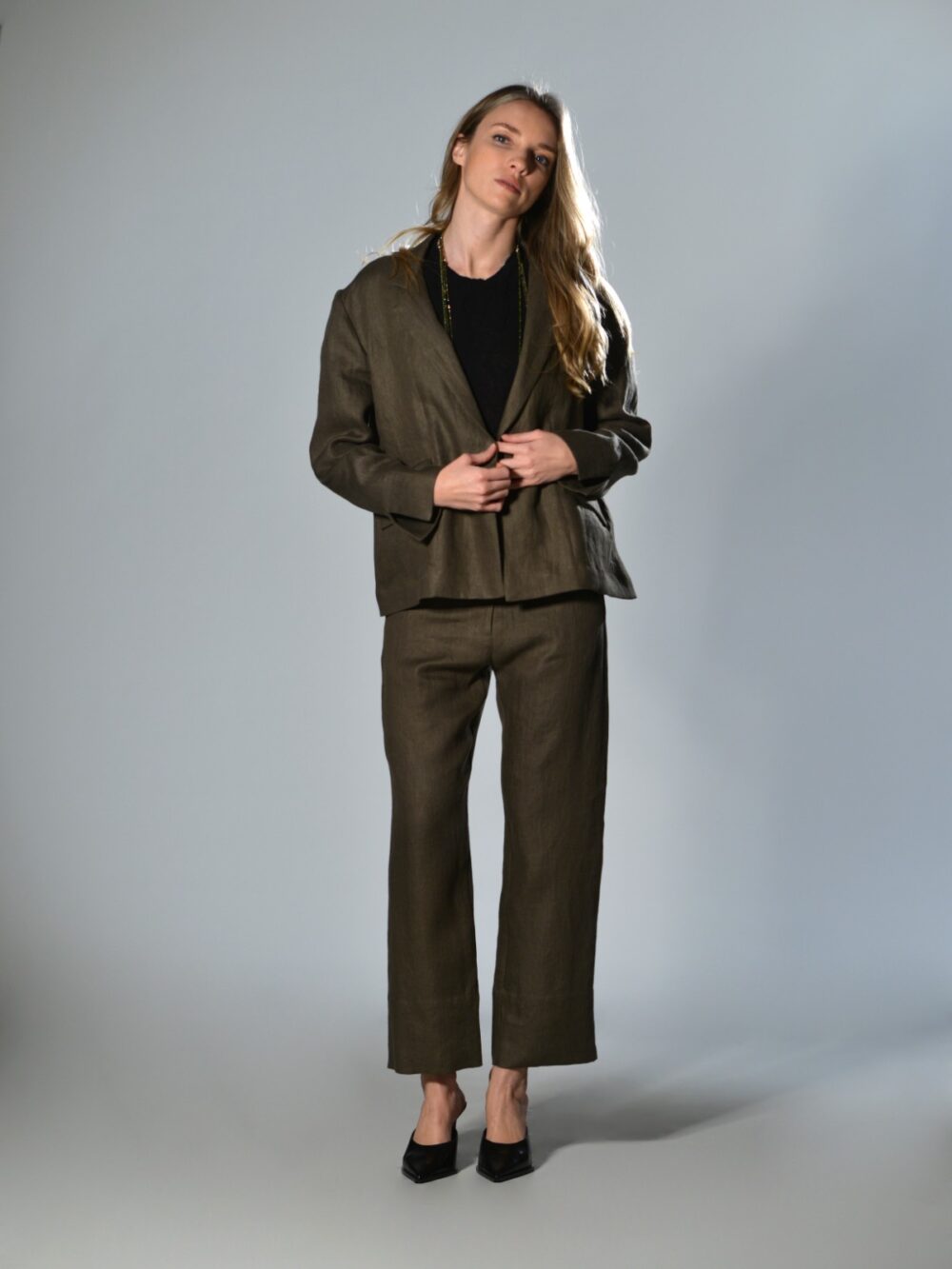 Giacca sfoderata in tessuto di lino dalla texture leggermente stropicciata, con vestibilità oversize. Presenta rever classico, maniche lunghe e chiusura frontale con un bottone e asola a filetto. Due ampie tasche con patta sul davanti. Linea morbida e leggermente boxy.