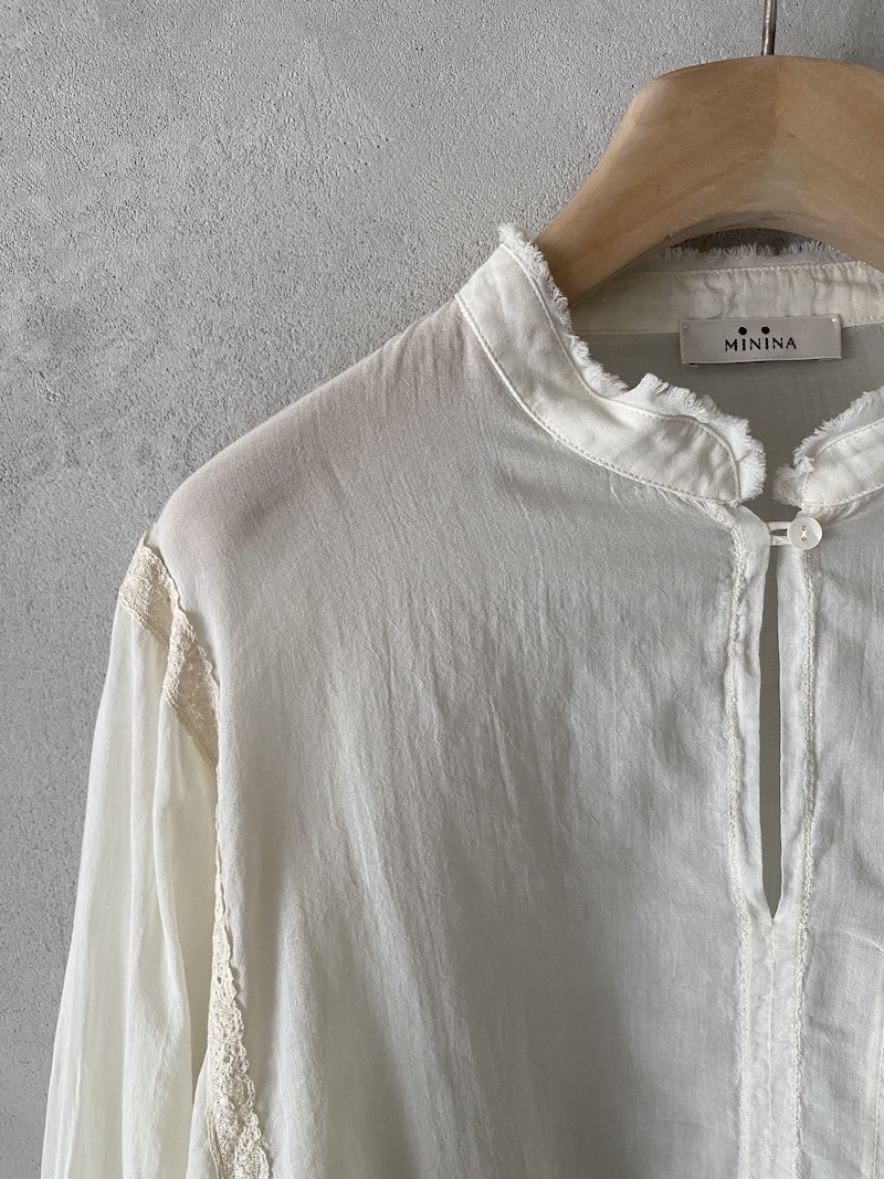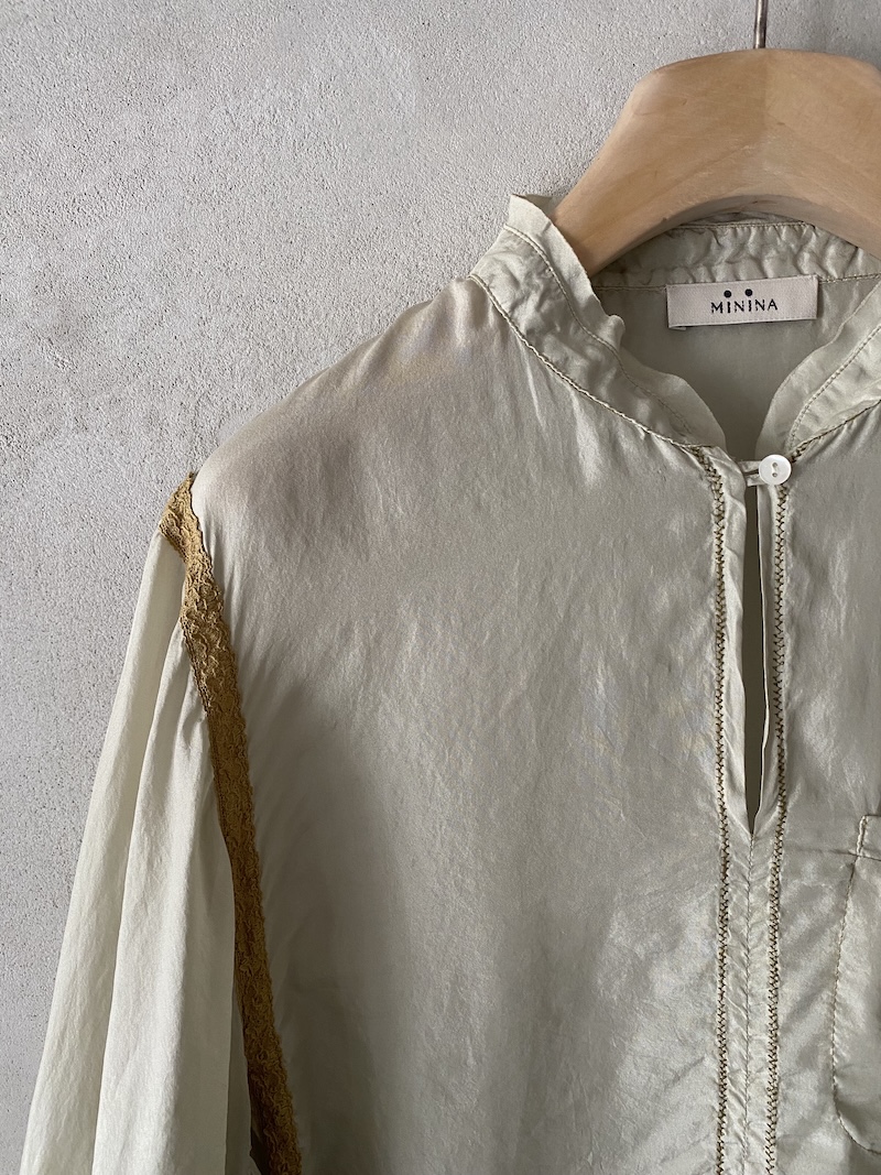 Blusa over beige in seta habotai tinto in capo con collo coreano e inserti in pizzo, manica lunga e linea morbida Minina