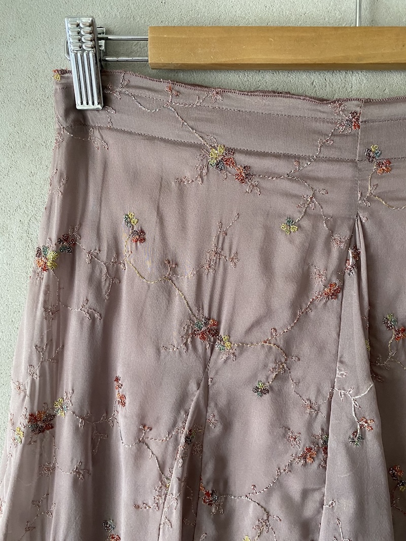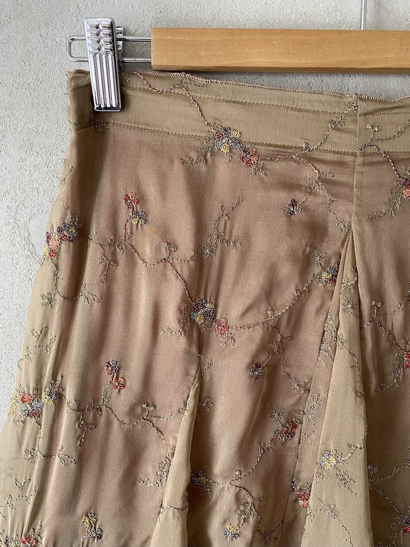 Gonna beige in seta ricamata con motivo floreale e linea ampia a spicchi, chiusura con zip laterale Minina