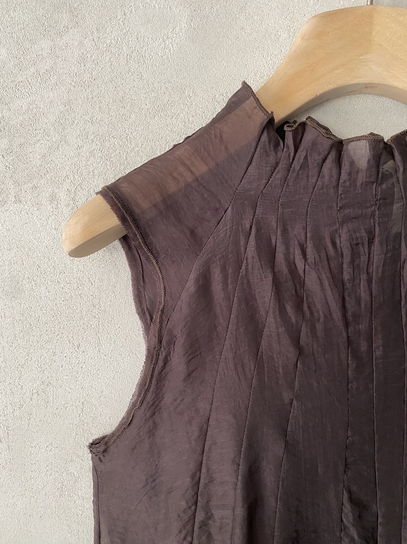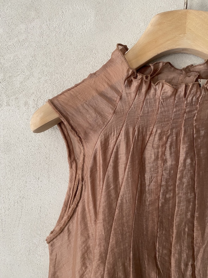 Top marrone in tessuto tencel semi trasparente con collo alto arricciato e linea ampia, giromanica a taglio vivo Minina