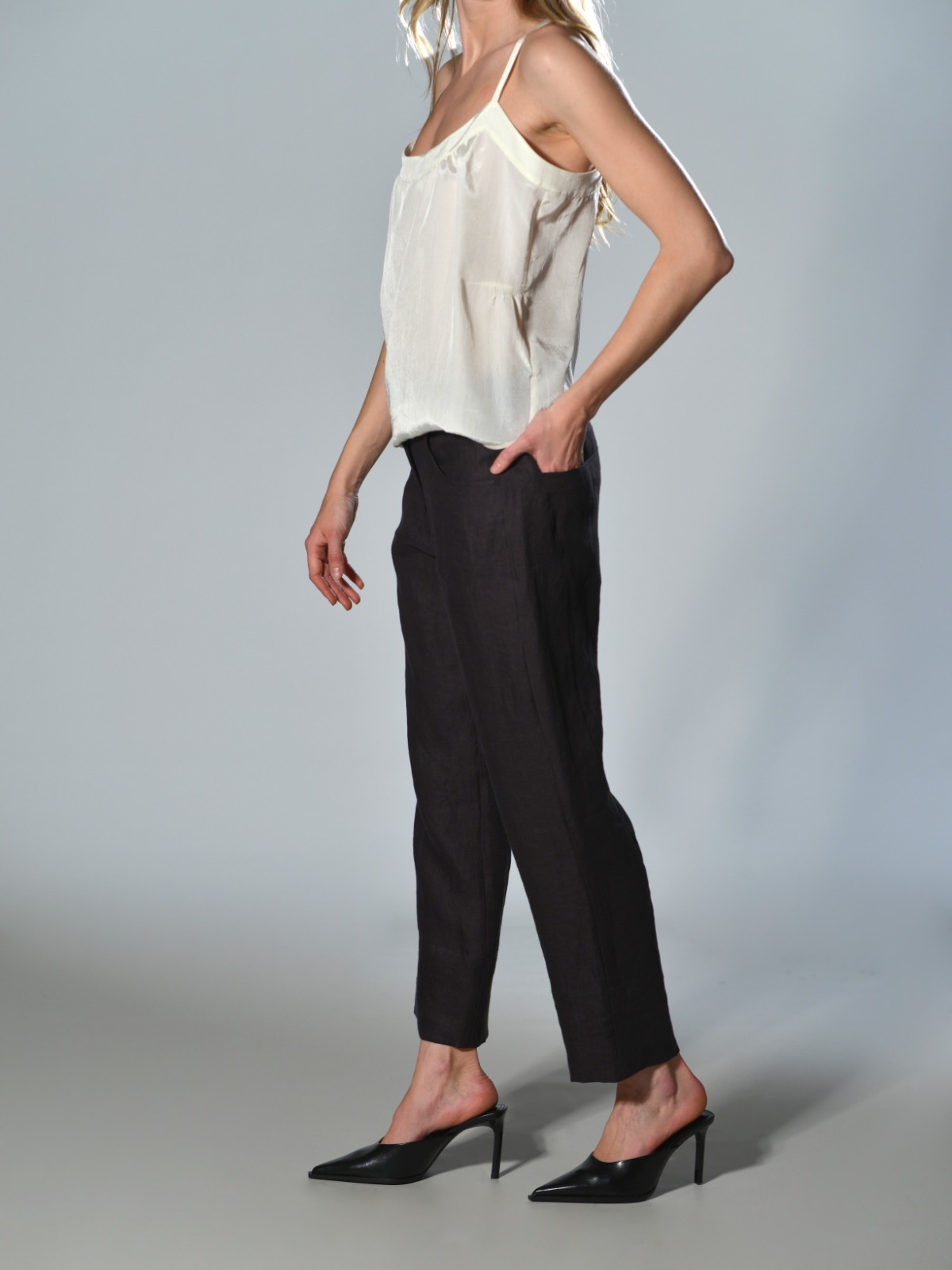 Pantaloni alla caviglia in lino colore nero con cavallo basso, costruzione a 5 tasche, vita media con passanti e chiusura con zip Marina Lari