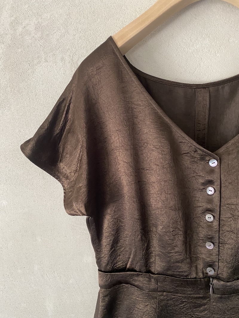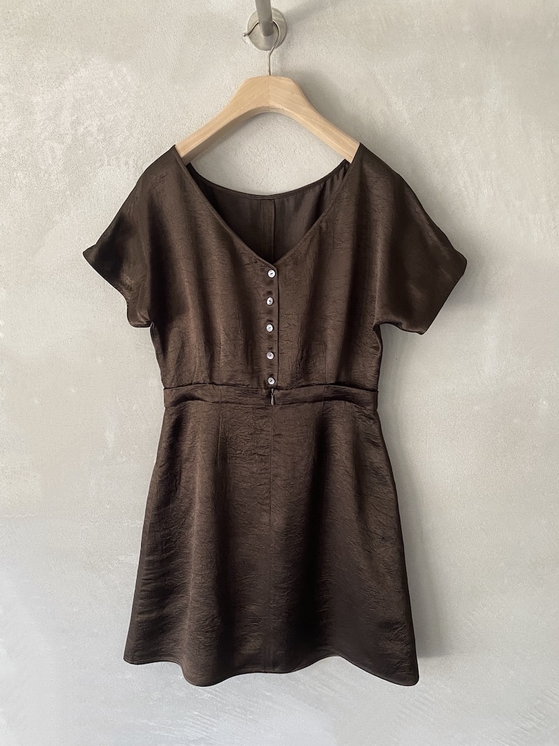 Abito corto in tessuto acetato con effetto stropicciato. Modello reversibile, indossabile in entrambi i sensi: con scollo tondo ampio sul davanti per un look più essenziale e pulito,oppure con scollatura profonda a V con cinque bottoni a vista per un effetto più deciso e femminile. La vita è definita da un cinturino applicato che struttura delicatamente la silhouette. Gonna leggermente svasata con linea fluida e movimento morbido. Chiusura con zip invisibile integrata nella costruzione.