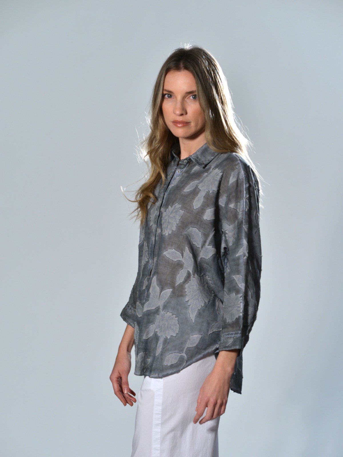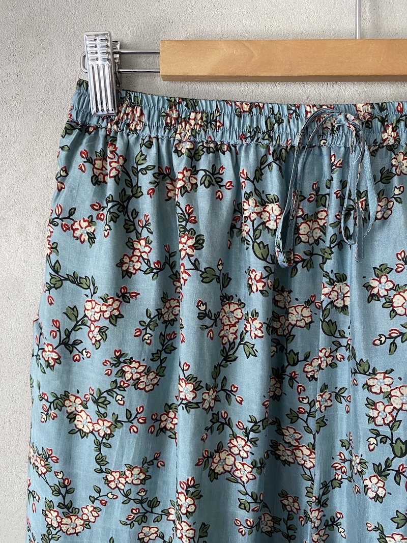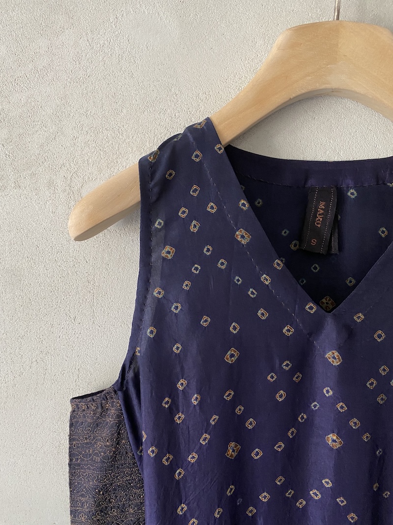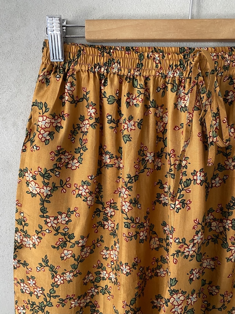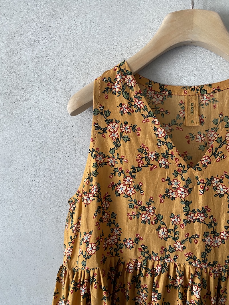 Abito lungo in seta con stampa floreale, tessuto leggero e fluido. Presenta scollo a V, spalla regolare, senza maniche, linea ampia con volume morbido arricciato sotto il seno, fondo dritto con rifiniture pulite, due tasche laterali inserite in cucitura. Vestibilità morbida.