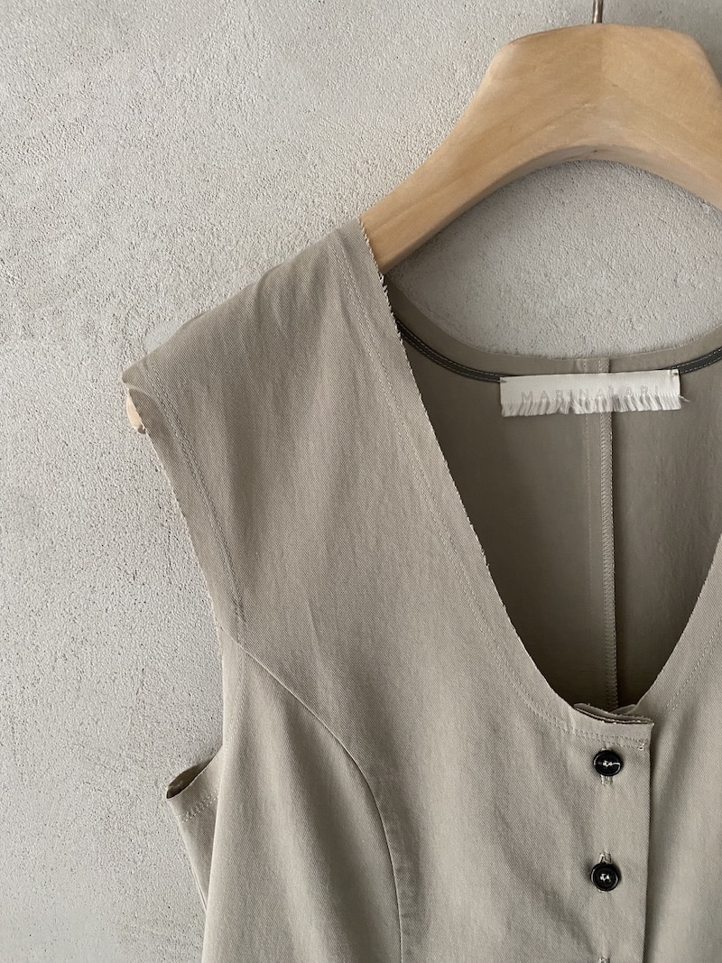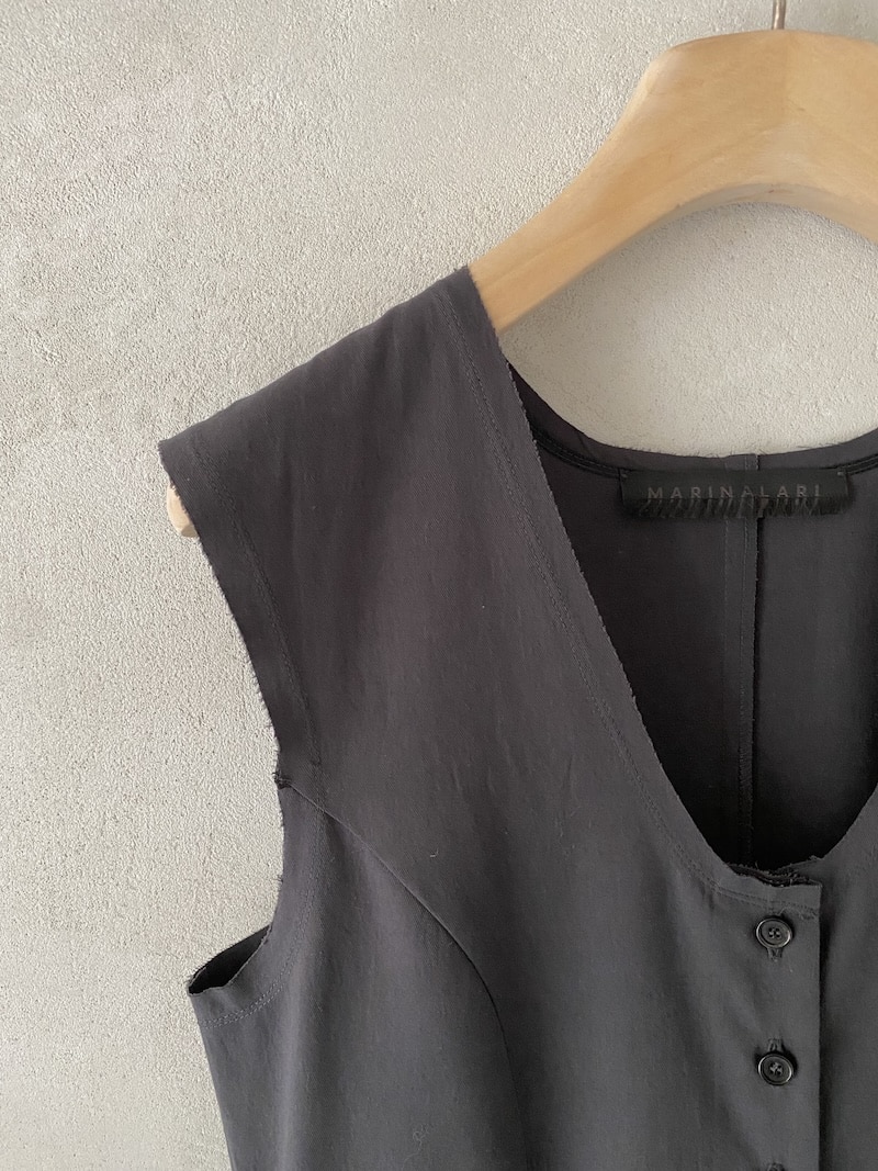 Abito in lino e viscosa. Scollo a V sul davanti e scollo tondo sul dietro, spalla regolare e senza maniche. Corpino sagomato con tagli verticali che definiscono il punto vita e si aprono in una linea svasata con volume ampio. Chiusura frontale con bottoni. Fondo con orlo a taglio vivo e impuntura. Vestibilità regolare.