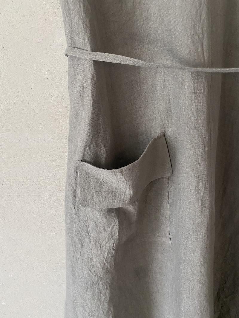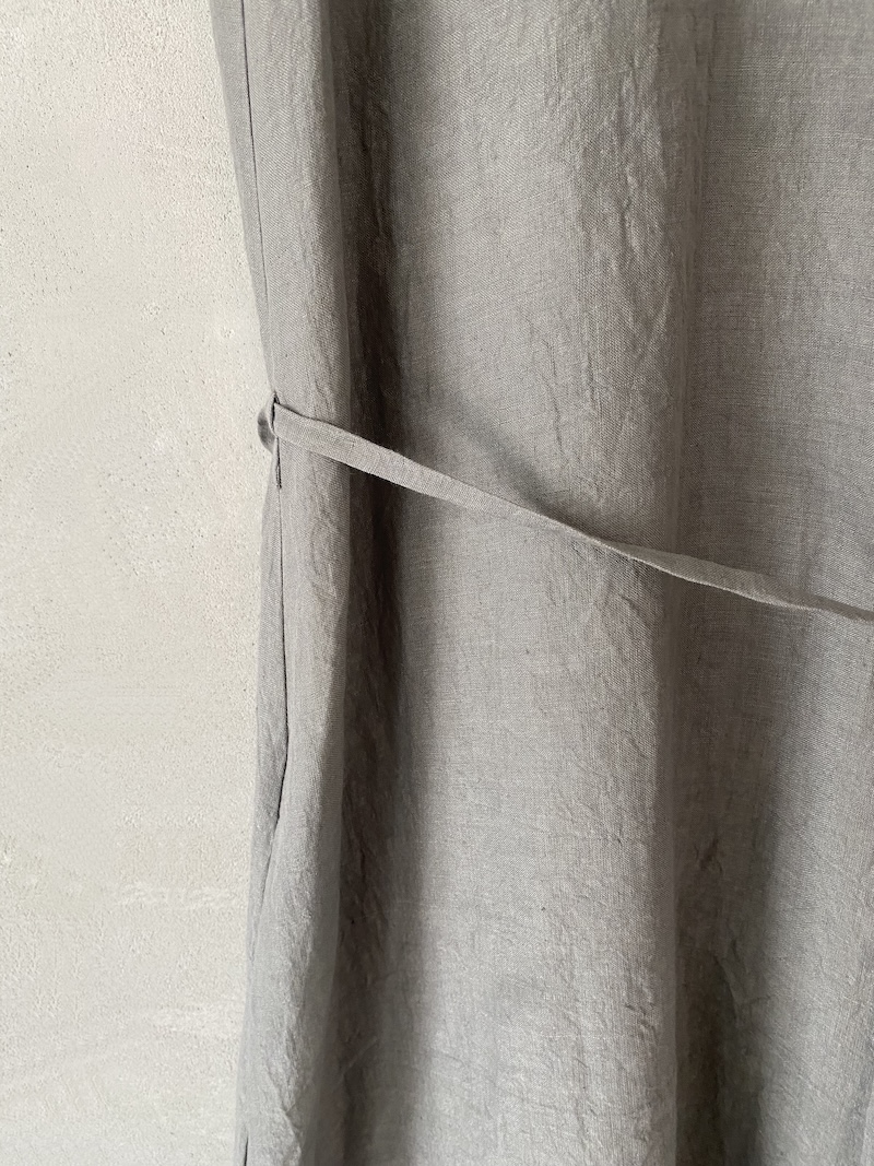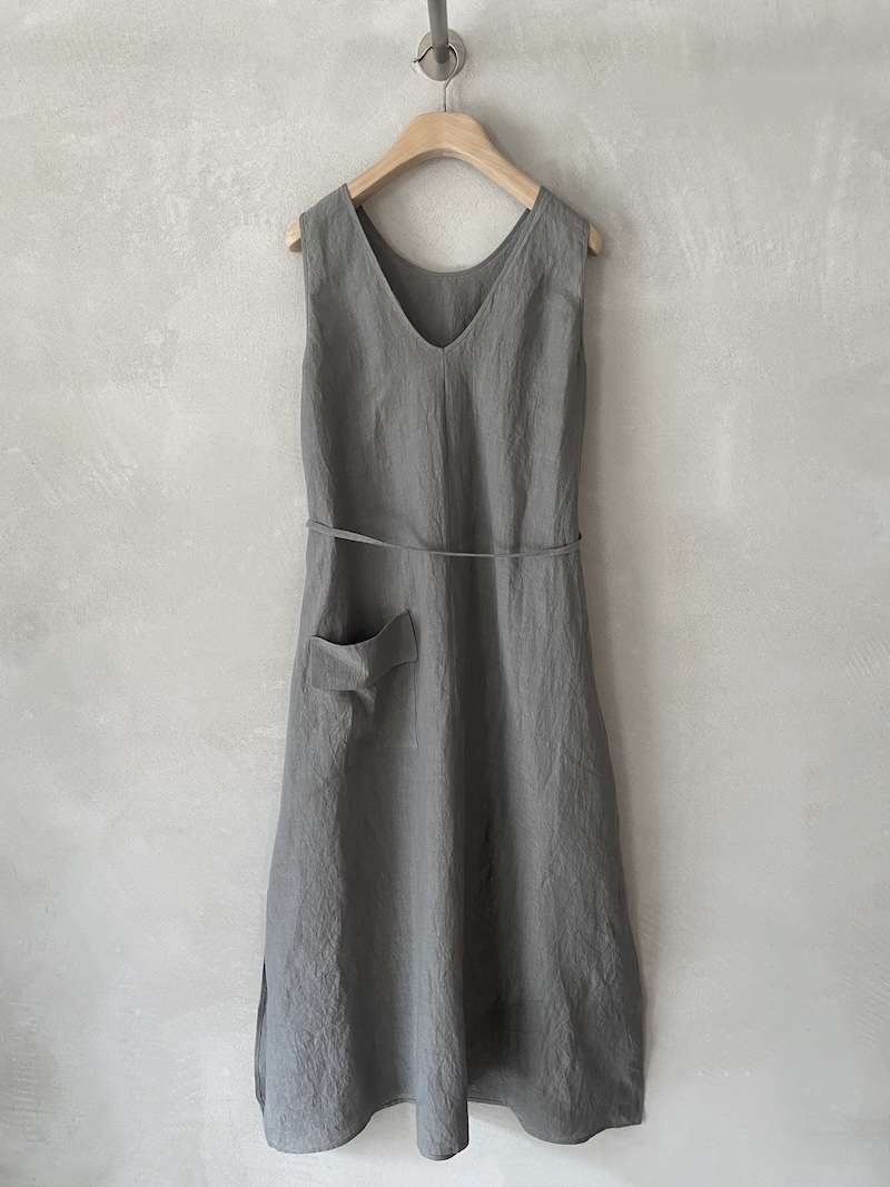 Abito lungo smanicato in tessuto di lino dalla texture leggermente stropicciata. Modello reversibile, indossabile su entrambi i lati. Presenta spacchi laterali, due tasche inserite nei fianchi e una tasca a toppa con patta sul retro. Scollo tondo leggermente sceso da un lato e scollo a V dall’altro. Cintina in vita con passanti.