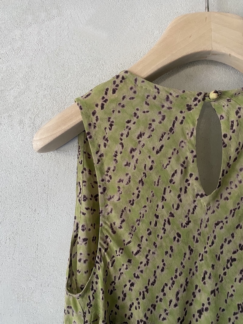 Abito smanicato Raga in viscosa color verdino marrone con scollo a V e chiusura posteriore a goccia con bottone – capo artigianale leggero