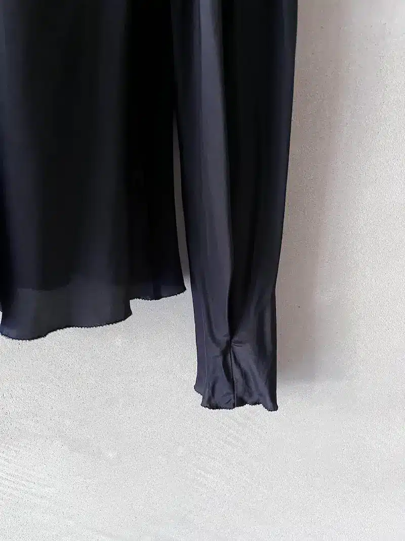 Blusa in seta habotai completamente tagliata in sbieco, scollo tondo ampio, motivo con pieghine sulle spalle, manica lunga con polso stretto da una piega. Misure taglia 36: lunghezza 58 cm, circonferenza torace 98 cm. Le misure delle taglie successive aumenteranno 2 cm in lunghezza e 4 cm in circonferenza.