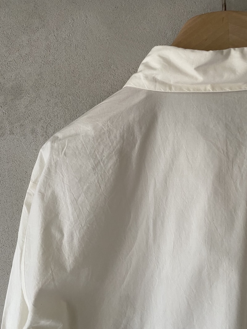 Camicia in cotone color crema con collo classico e chiusura frontale con bottoni rivestiti. Linea leggermente svasata con volume morbido e lunghezza corta. Maniche lunghe con polsino e bottone. Il fondo del capo è arricchito da un ricamo tono su tono con motivi floreali e geometrici impreziositi da piccole applicazioni di perline. Orlo rifinito con bordo smerlato che crea un effetto delicato. Vestibilità boxi. Made in Japan