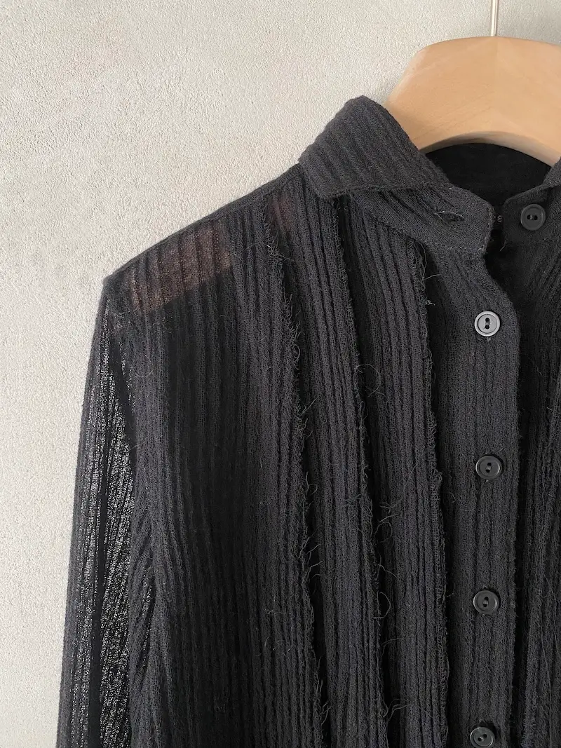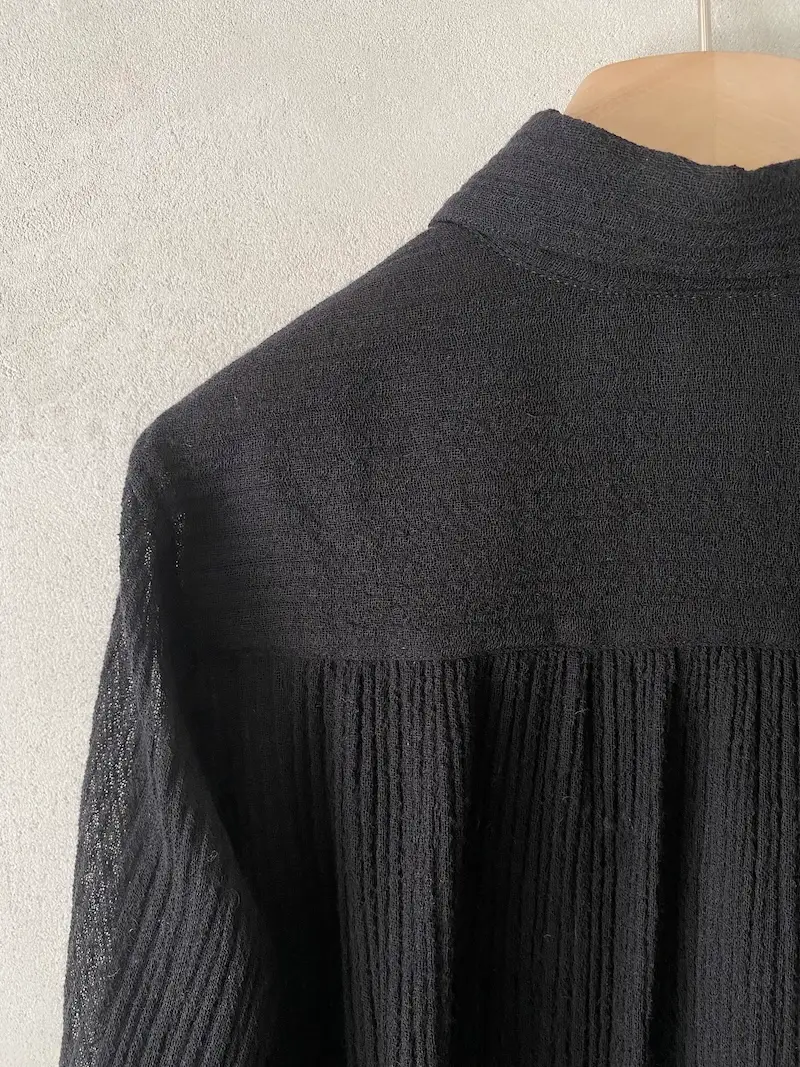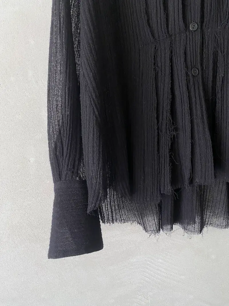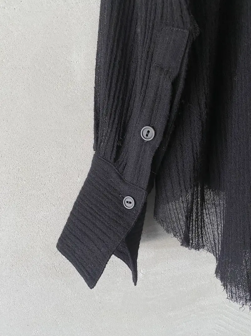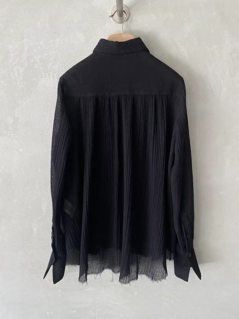 Camicia over in garza di lana, chiusura centrale davanti con 7 asole e bottoni, pieghe verticali rifinite a taglio vivo, manica lunga con polsino alto chiuso con 2 bottoni, orlo a taglio vivo sfilacciato. Misure Taglia 40: lunghezze 66/76, larghezza 58 cm. Le misure delle taglie successive aumenteranno 2 cm in lunghezza e 4 cm in circonferenza.