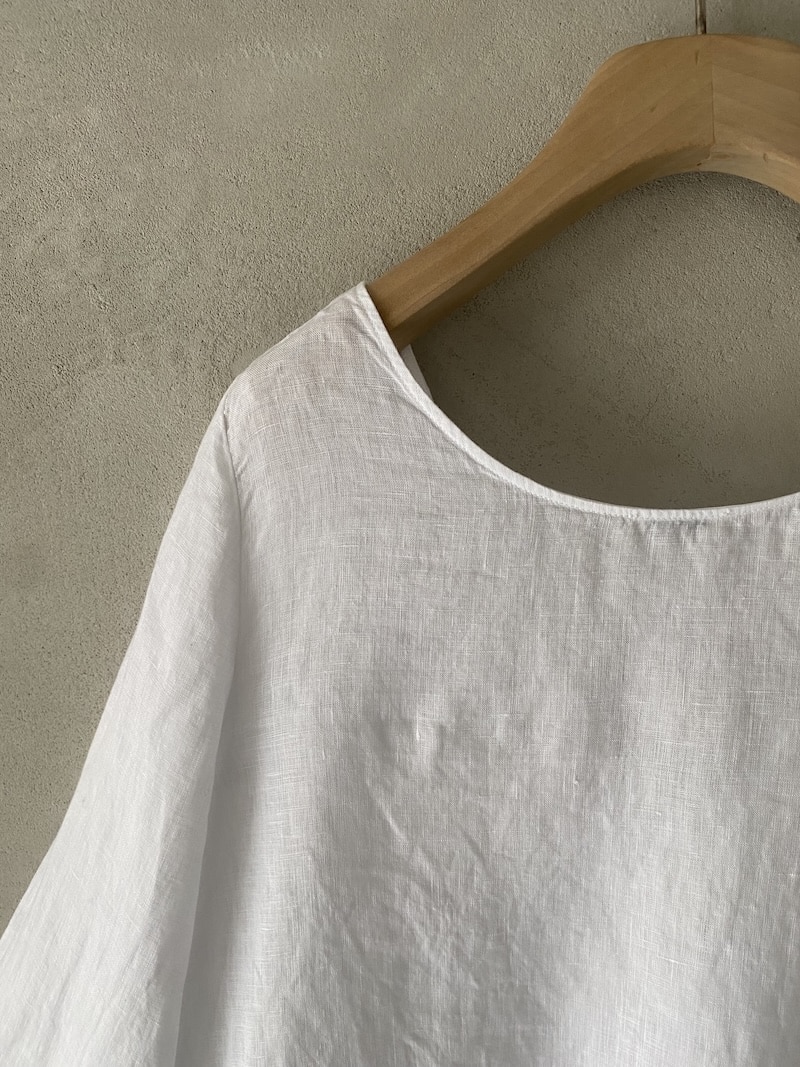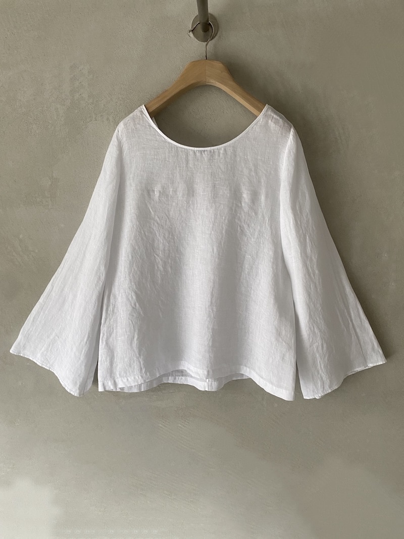 Blusa in lino dalla linea svasata. Scollo a V ampio sul davanti e scollo tondo sul retro. Spalla regolare e maniche lunghe a campana, ampie e morbide. Fondo dritto e pulito. Vestibilità morbida.