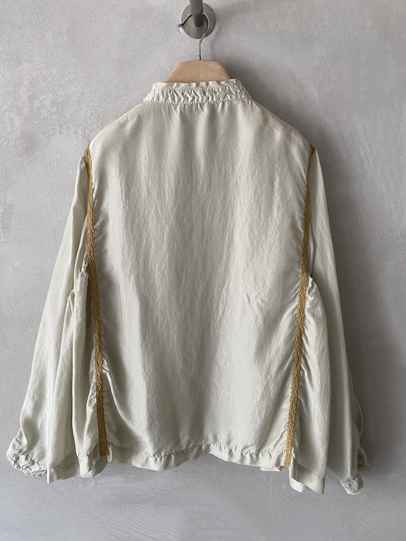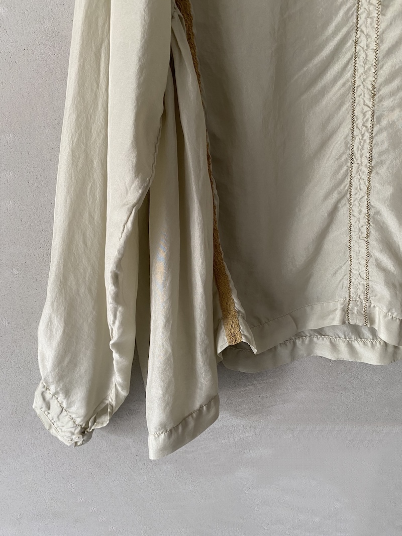 Blusa over in seta habotai tinto in capo. Collo alla coreana con rifinitura a taglio vivo sfilacciato e apertura frontale con bottone. Spalla leggermente scesa e manica lunga con polso rifinito a taglio vivo. Linea morbida con pannelli laterali arricchiti da inserti in pizzo. Taschino applicato sul petto. Fondo dritto con orlo impunturato. Vestibilità oversize.