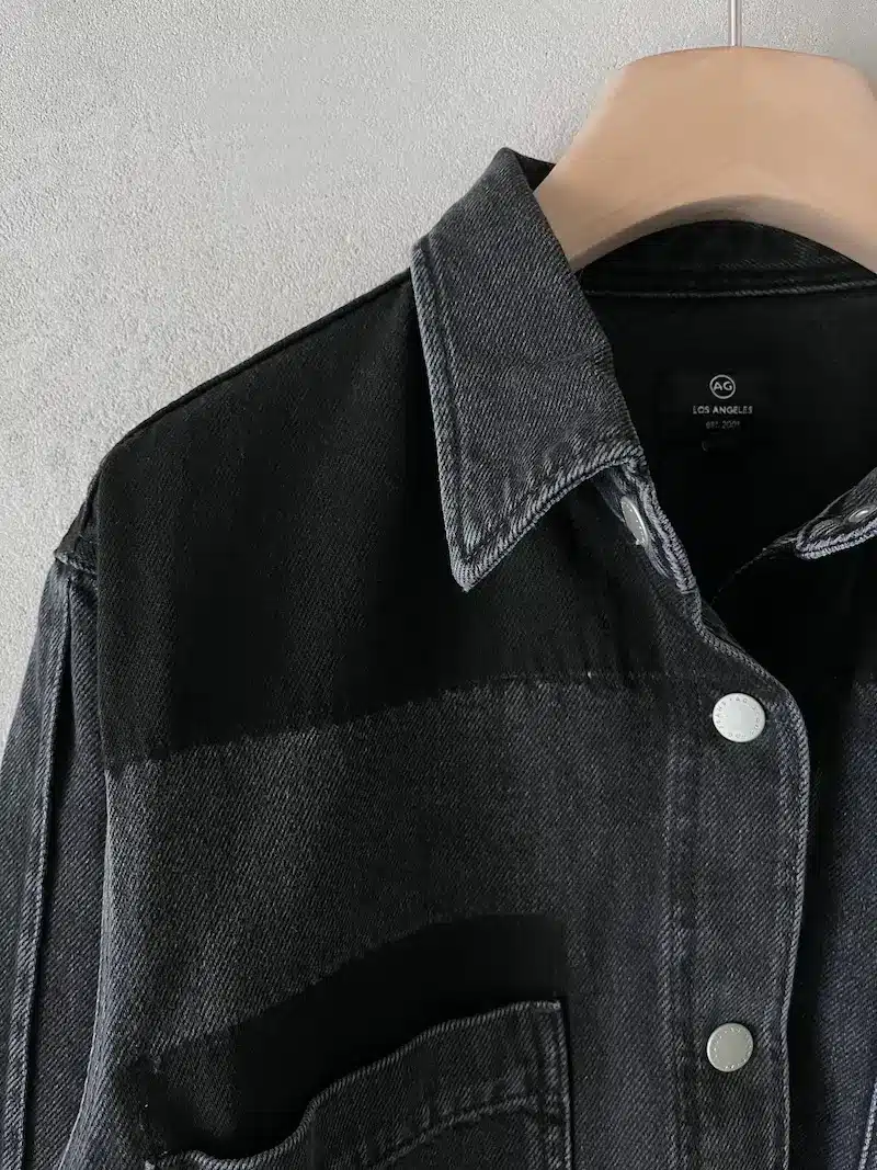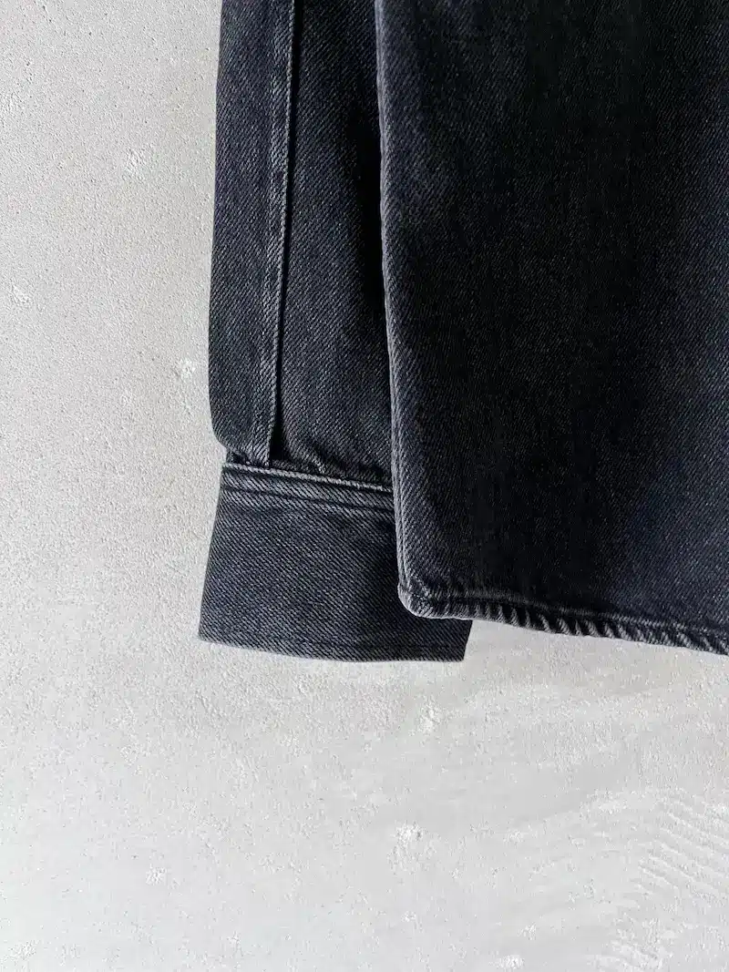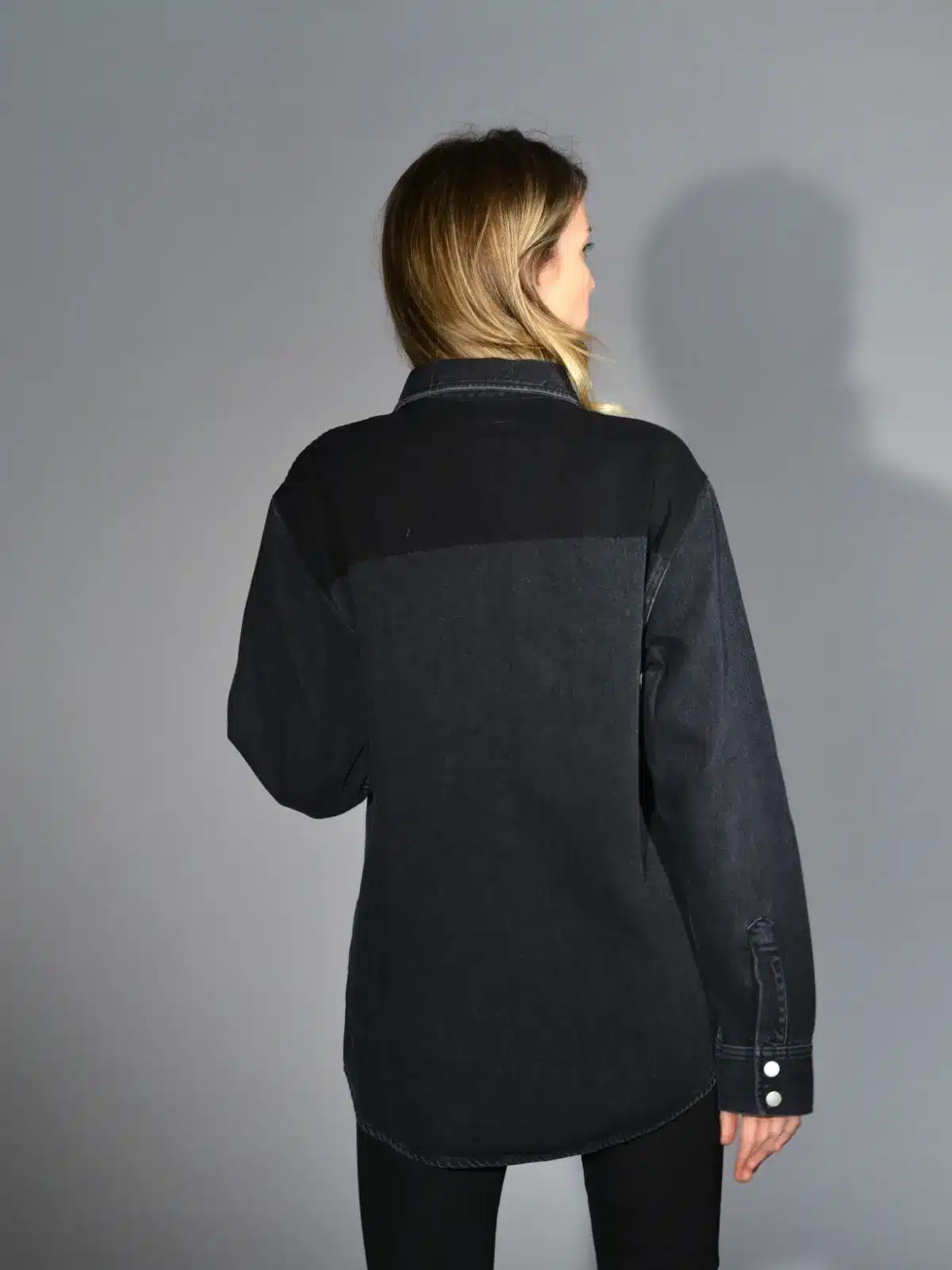 Camicia jeans grigio scuro con doppia tintura, chiusura centrale davanti con 6 snaps, manica lunga con polso chiuso con 2 snaps. Misure taglia S: lunghezza 69 cm, larghezza 54 cm. Le misure delle taglie successive aumenteranno 2 cm in lunghezza e 4 cm in circonferenza.