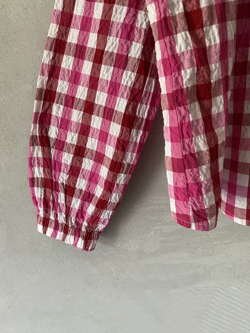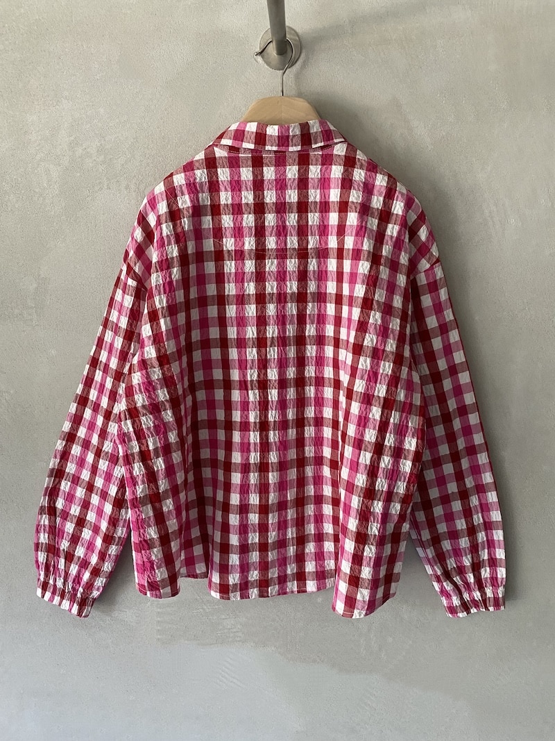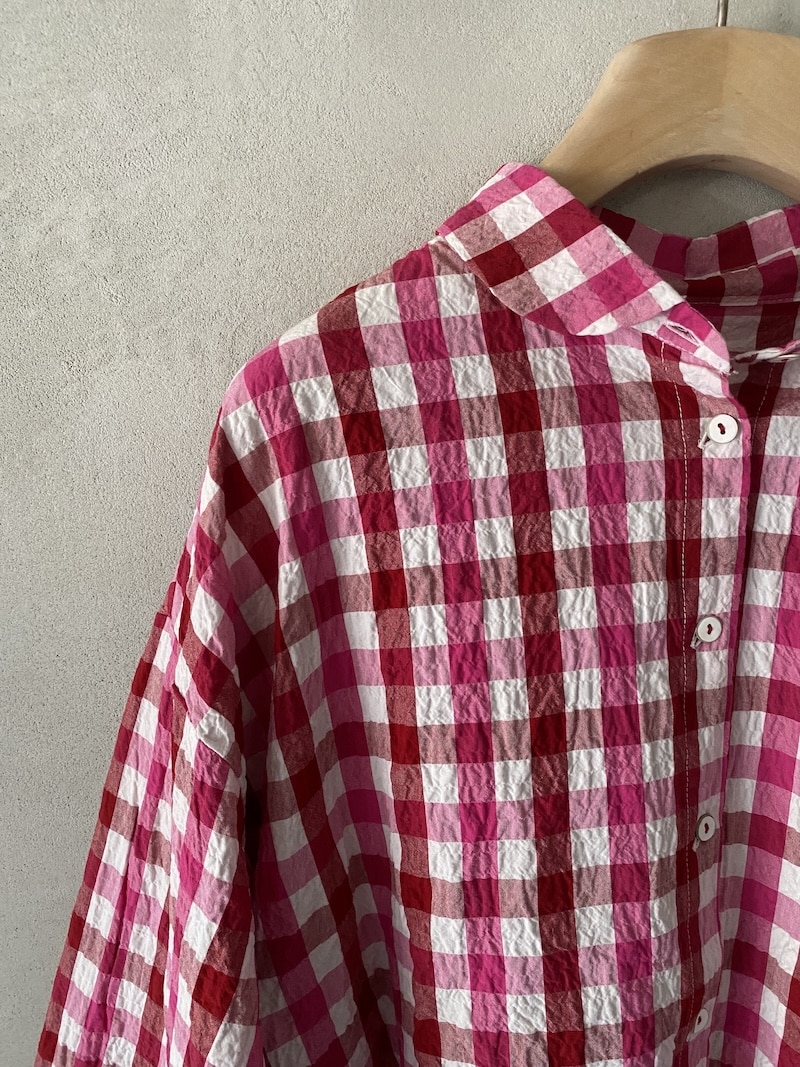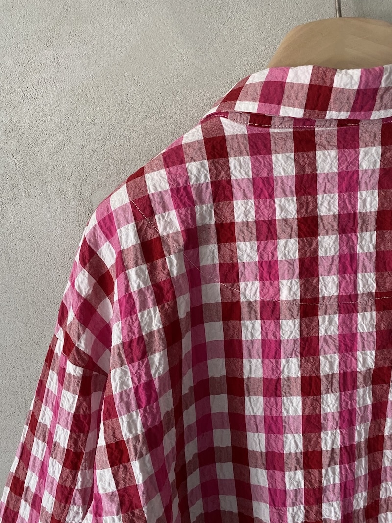 Camicia over in cotone con motivo vichy bicolore ed effetto leggermente stropicciato. Colletto arrotondato, chiusura frontale con bottoni. Spalla calata e linea dritta. Maniche lunghe con polsino rifinito da elastico inserito, che crea un leggero arriccio e dona morbidezza al volume. Fondo arrotondato, leggermente più lungo sul retro. Vestibilità over.