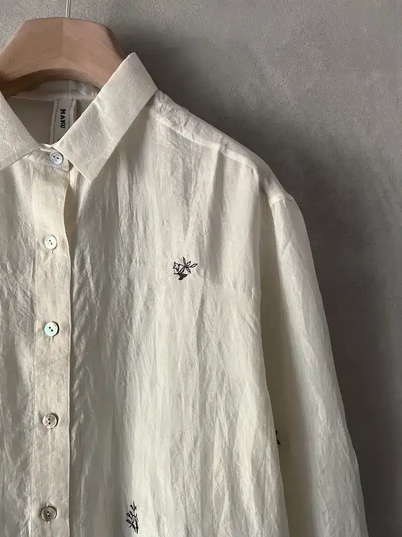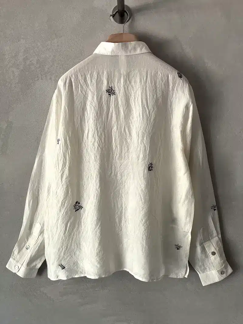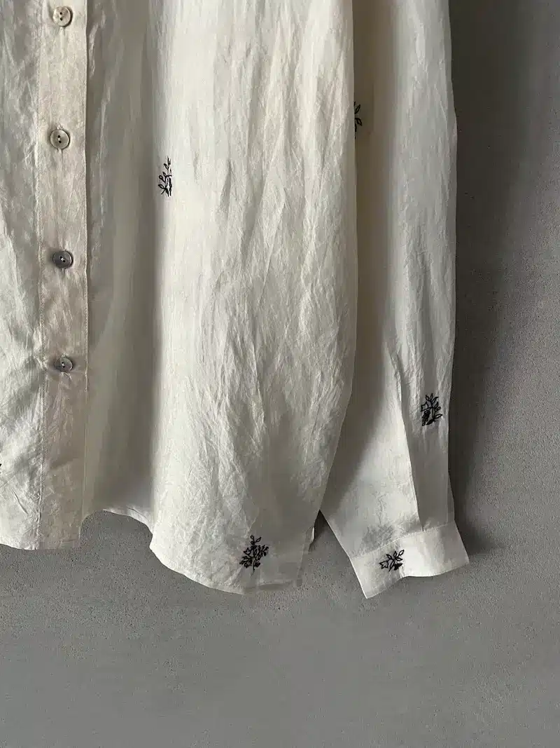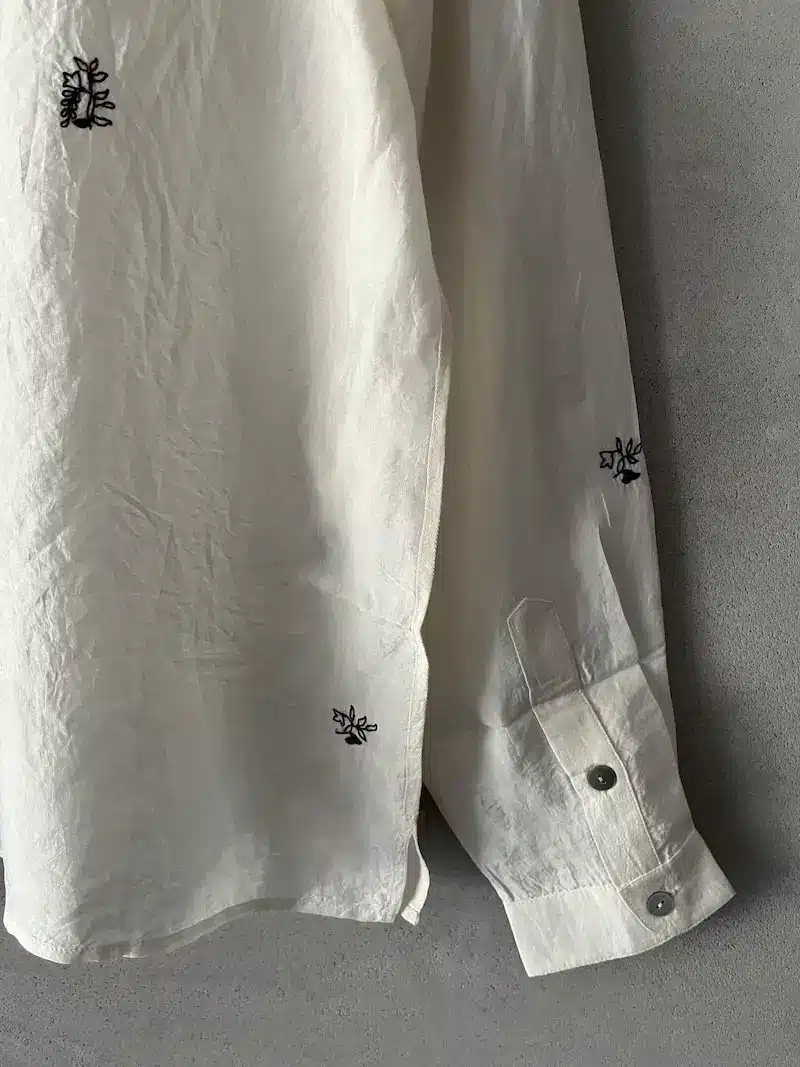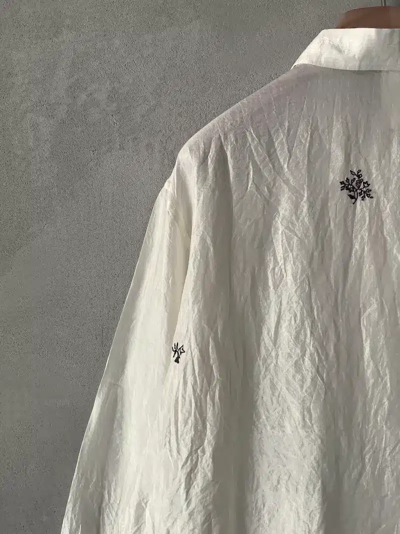 Camicia in seta habotai ricamata, tessuto fatto a mano a telaio, chiusa davanti con 7 asole e 7 bottoni di madreperla, manica lunga con polsino basso chiuso con 2 bottoni, colletto a uomo, piccoli spacchi laterali. Misure taglia S: lunghezza 64 cm, larghezza 54 cm. Le misure delle taglie successive aumenteranno 2 cm in lunghezza e 4 cm in circonferenza.