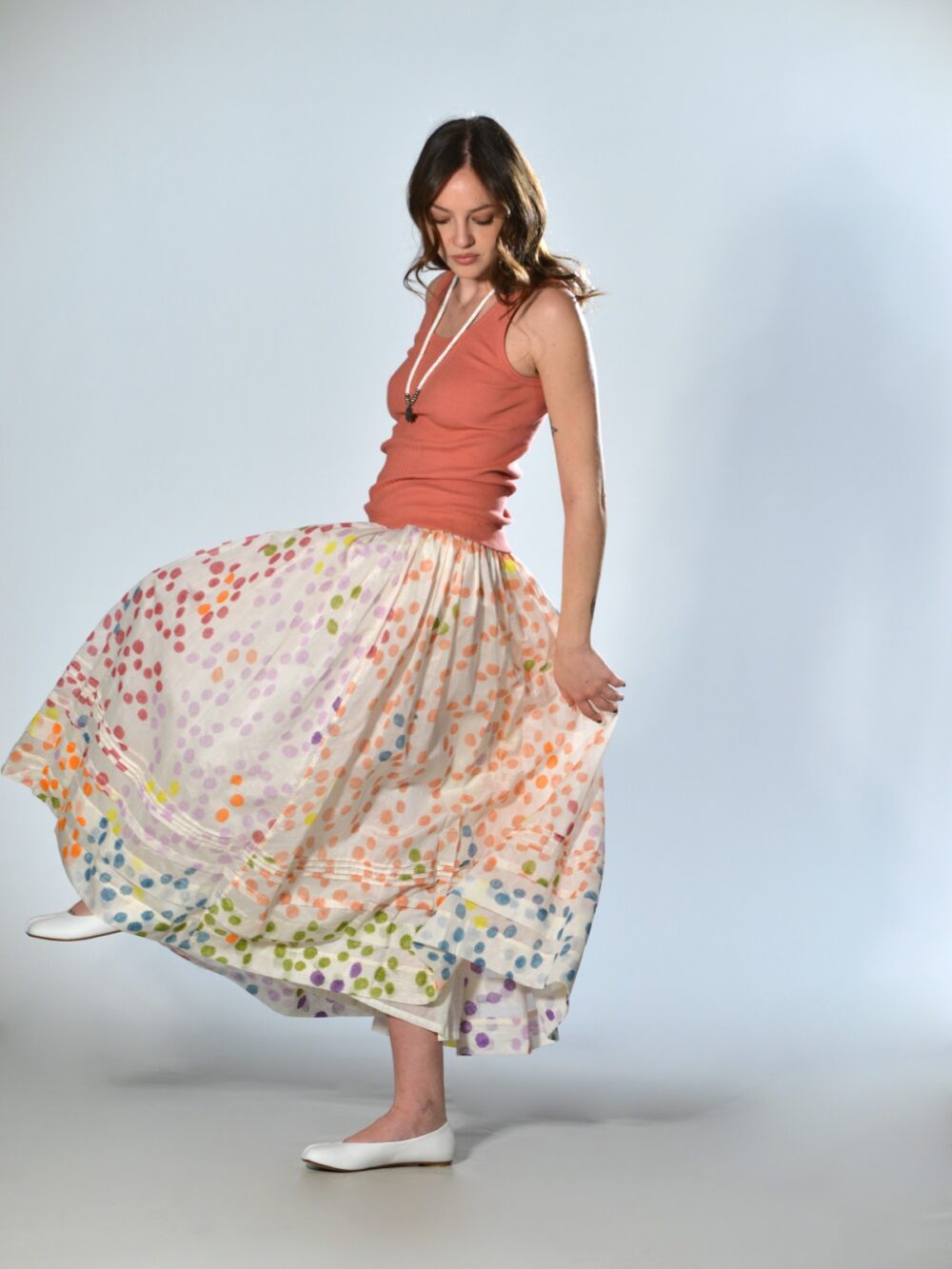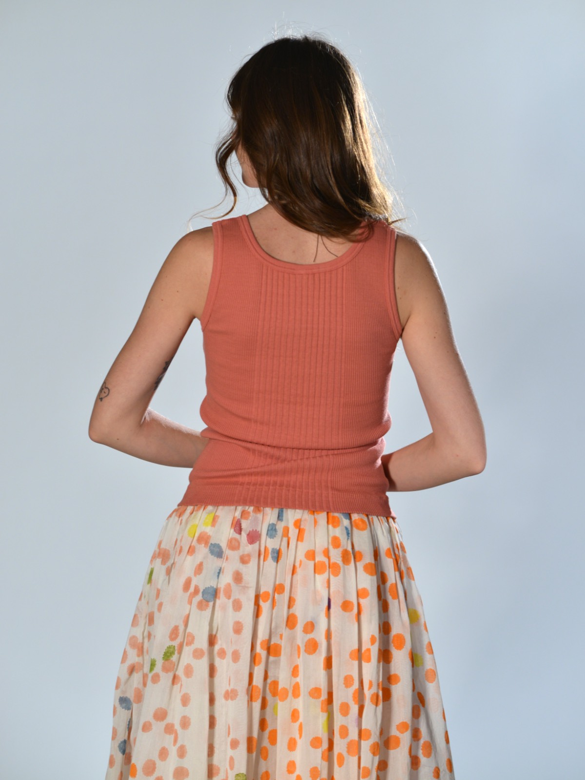 Canotta in jersey di cotone a costine. Presenta scollo rotondo, spalla regolare con spalline larghe, senza maniche, linea aderente con volume slim, fondo dritto. Vestibilità aderente. La larghezza non è definibile poiché la lavorazione a costine si adatta al corpo, espandendosi e restringendosi in base alla vestibilità.