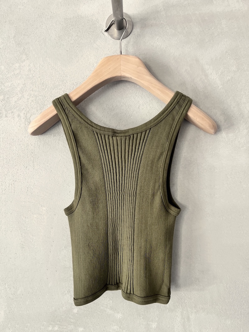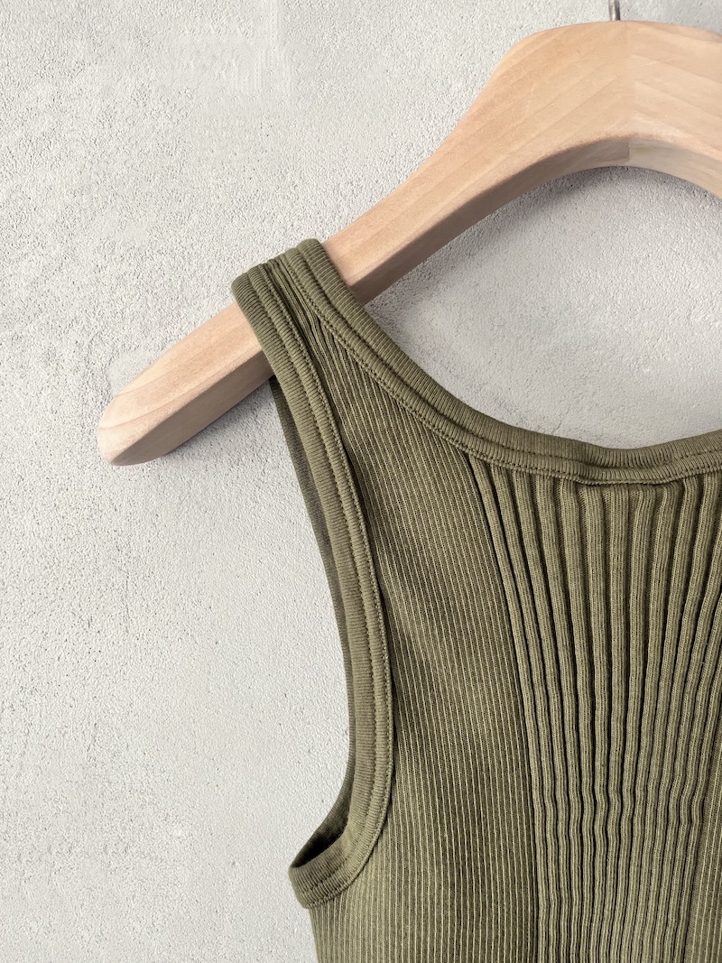 Canotta corta in jersey di cotone a costine. Presenta scollo rotondo, spalla regolare con spalline larghe, senza maniche, linea aderente con volume slim, fondo dritto. Vestibilità aderente. La larghezza non è definibile poiché la lavorazione a costine si adatta al corpo, espandendosi e restringendosi in base alla vestibilità.