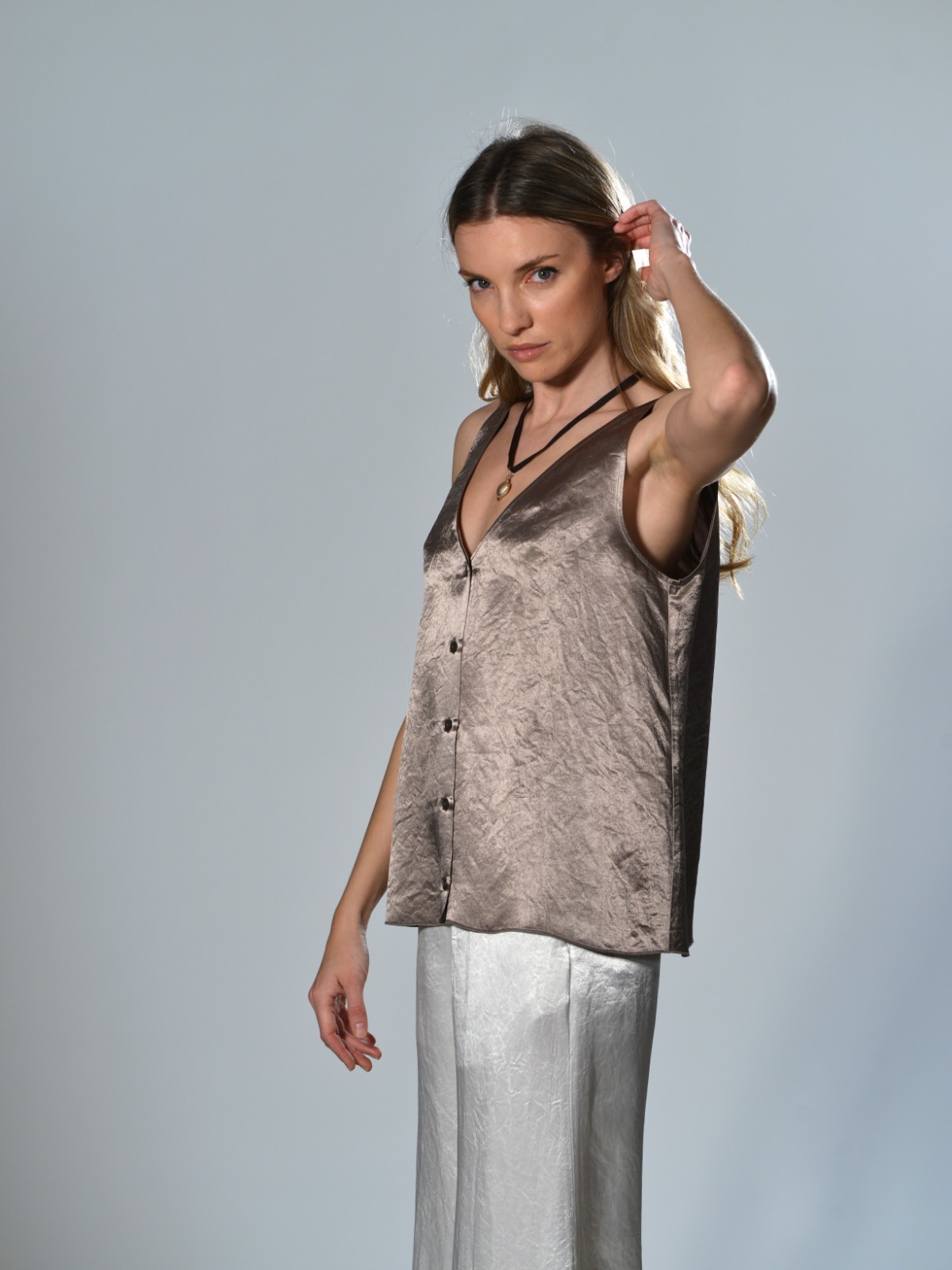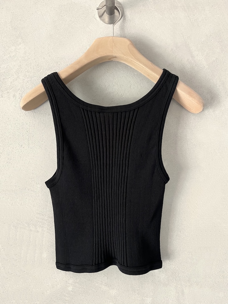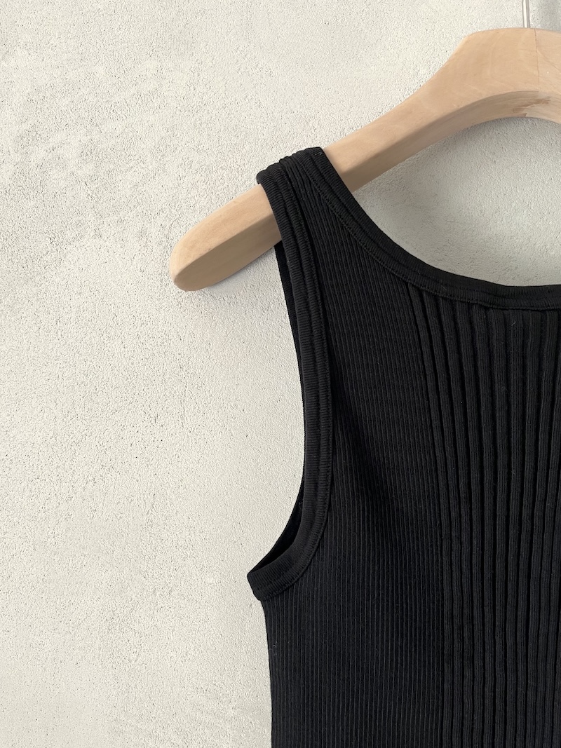 Canotta corta in jersey di cotone a costine. Presenta scollo rotondo, spalla regolare con spalline larghe, senza maniche, linea aderente con volume slim, fondo dritto. Vestibilità aderente. La larghezza non è definibile poiché la lavorazione a costine si adatta al corpo, espandendosi e restringendosi in base alla vestibilità.