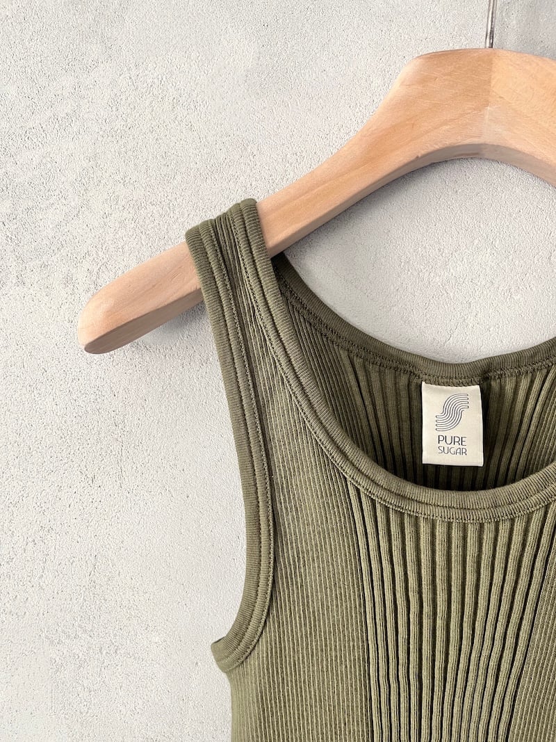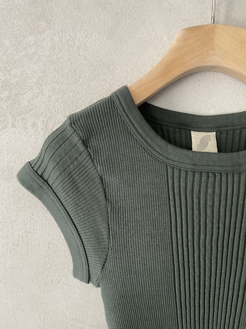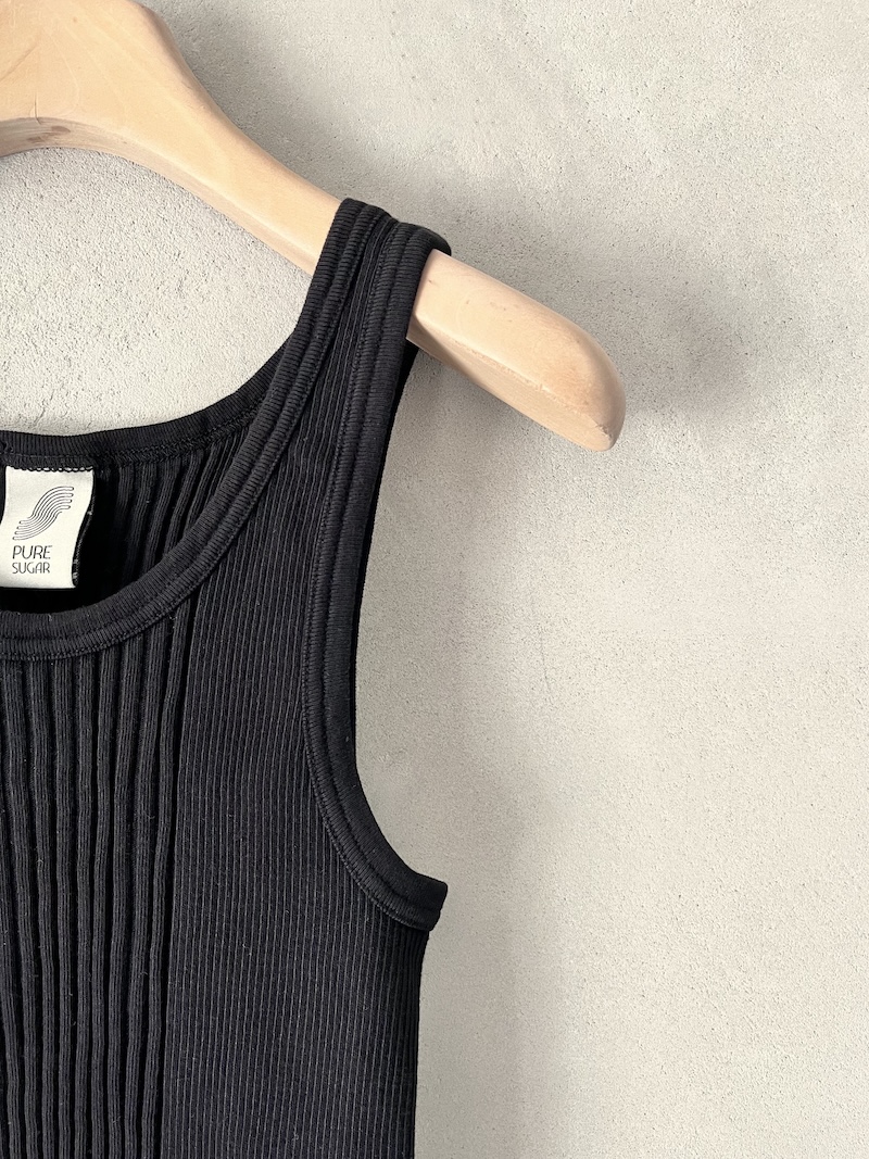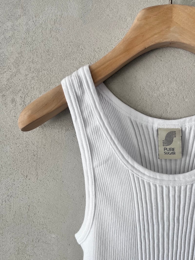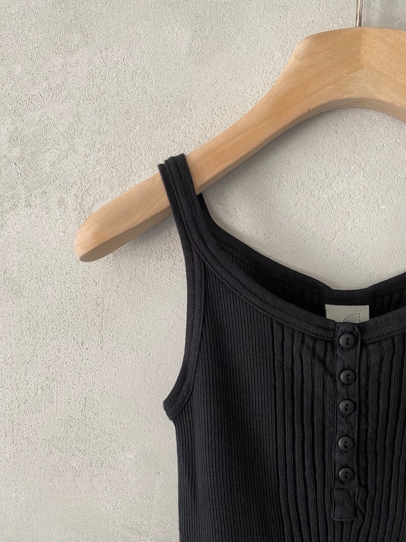 Canotta corta in jersey di cotone a costine. Presenta scollo rotondo, spalla regolare con spalline larghe, senza maniche, linea aderente con volume slim, fondo dritto. Vestibilità aderente. La larghezza non è definibile poiché la lavorazione a costine si adatta al corpo, espandendosi e restringendosi in base alla vestibilità.