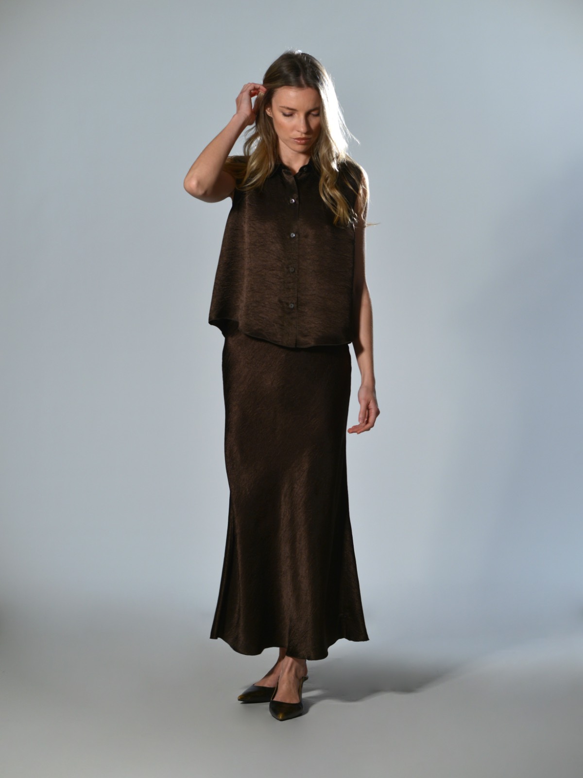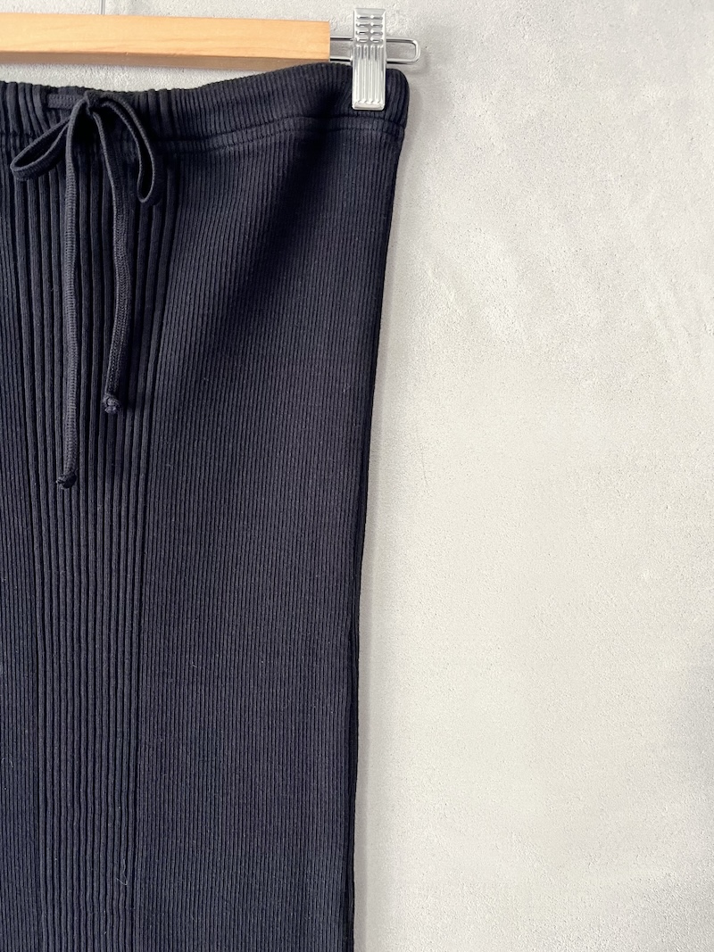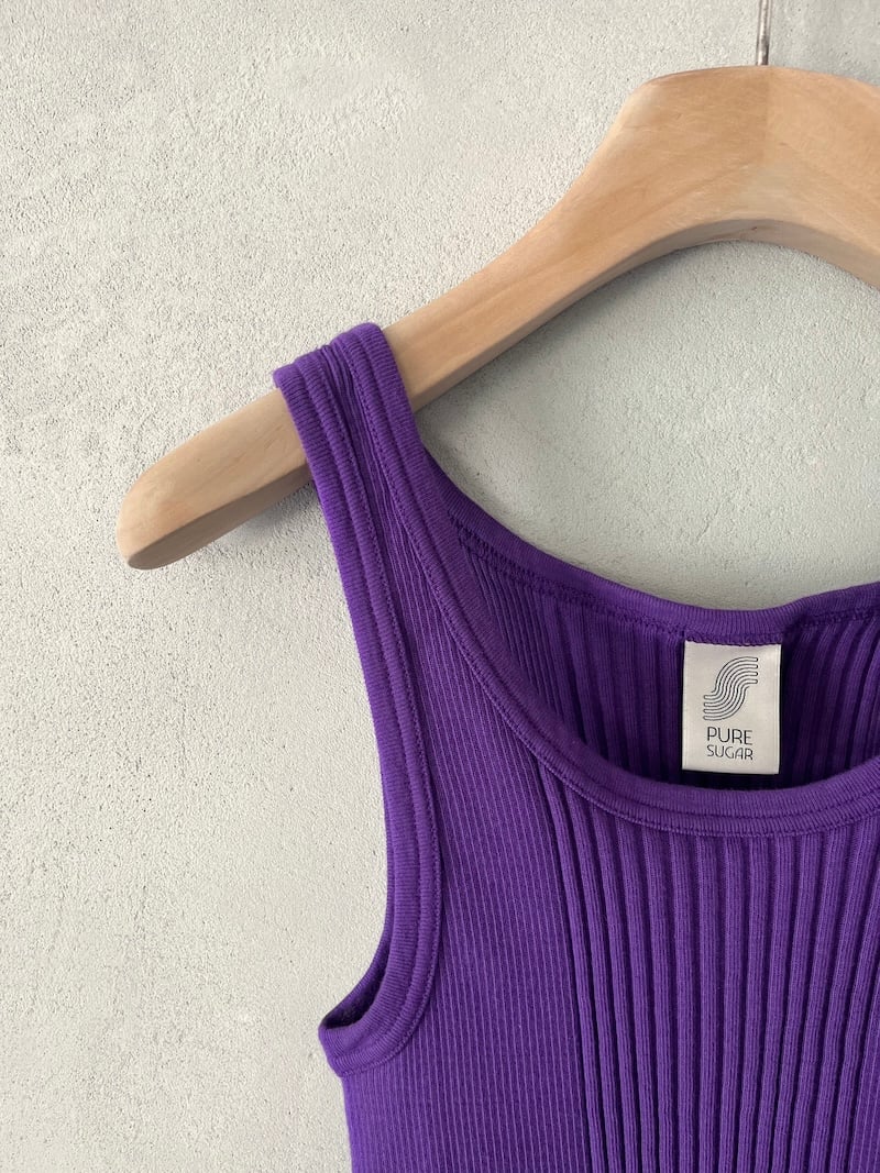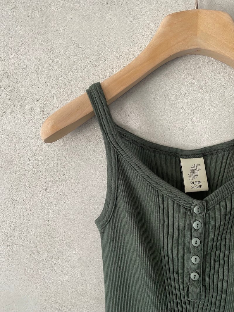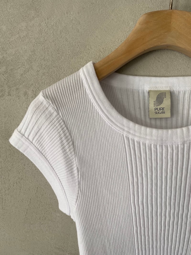 Canotta corta in jersey di cotone a costine. Presenta scollo rotondo, spalla regolare con spalline larghe, senza maniche, linea aderente con volume slim, fondo dritto. Vestibilità aderente. La larghezza non è definibile poiché la lavorazione a costine si adatta al corpo, espandendosi e restringendosi in base alla vestibilità.
