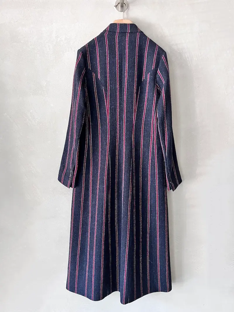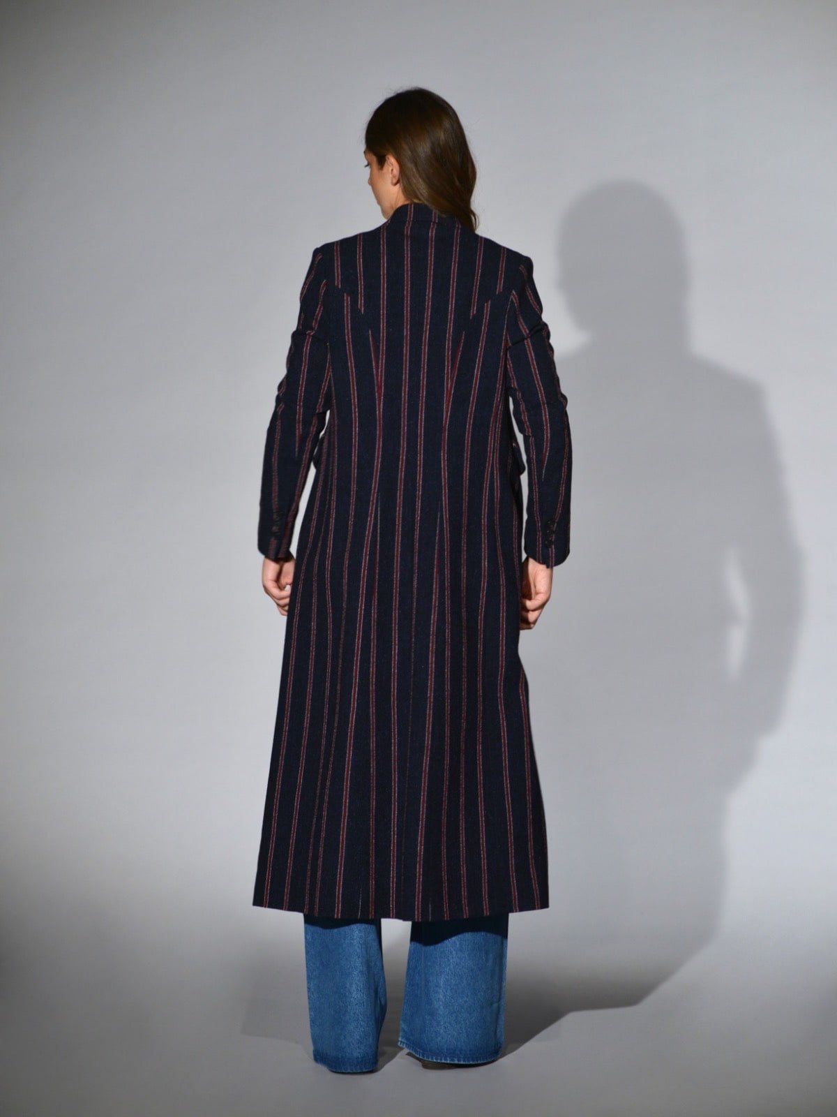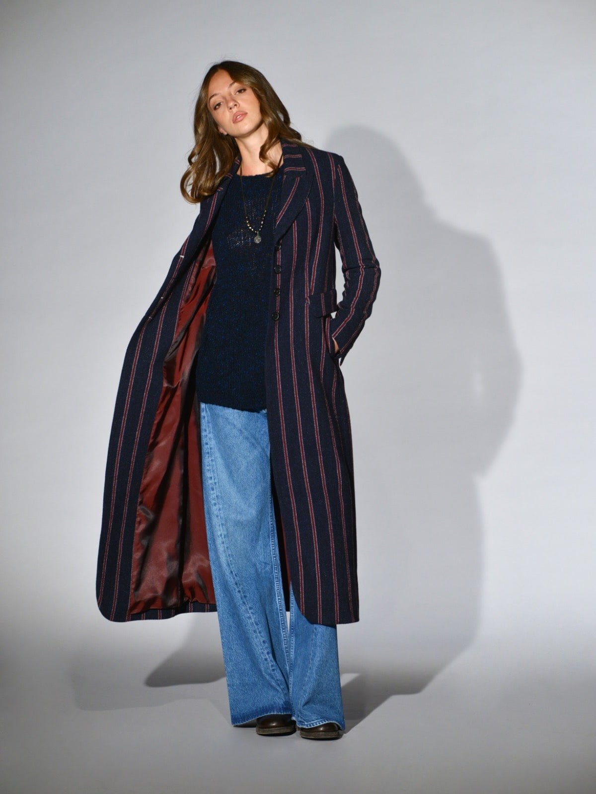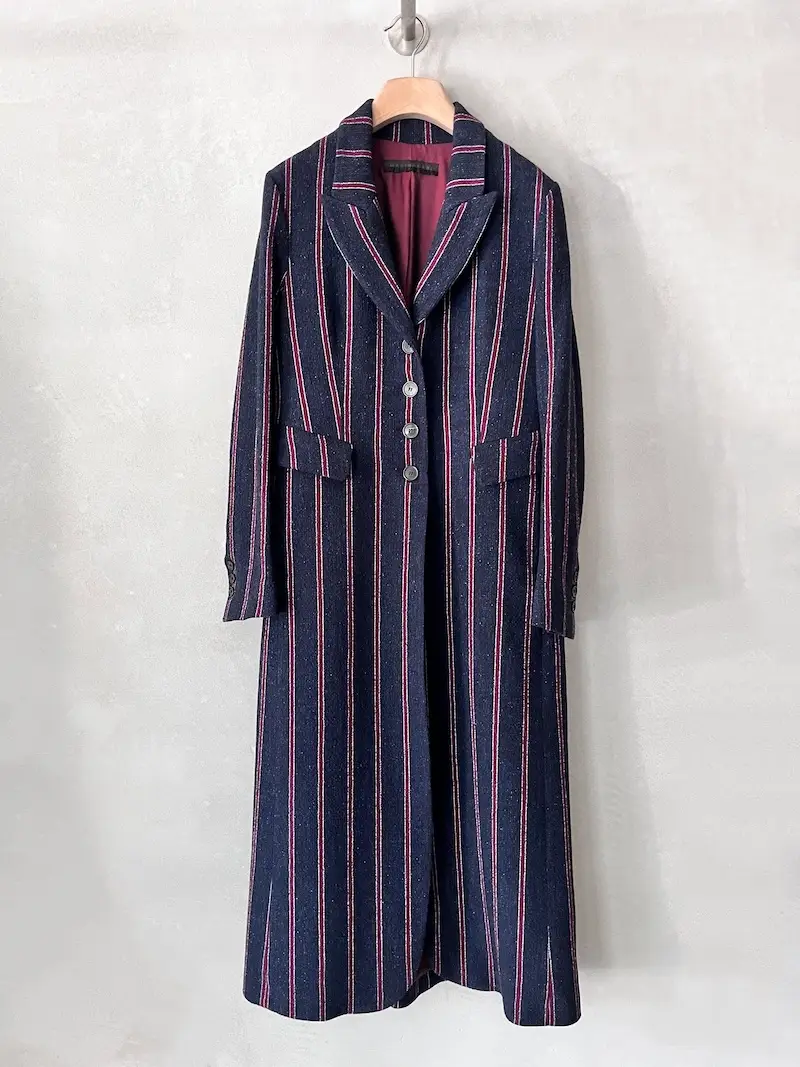 Cappotto lungo in tessuto di lana rigato, completamente foderato, chiuso con quattro asole e bottoni, due tasche a filetto con patta più due tasche laterali in cucitura, manica con polso chiuso con tre asole e bottoni. Lunghezza 128 cm, circonferenza torace 96 cm, circonferenza fianchi 106 cm, le misure delle taglie successive aumenteranno 2 cm in lunghezza e 4 cm in circonferenza.