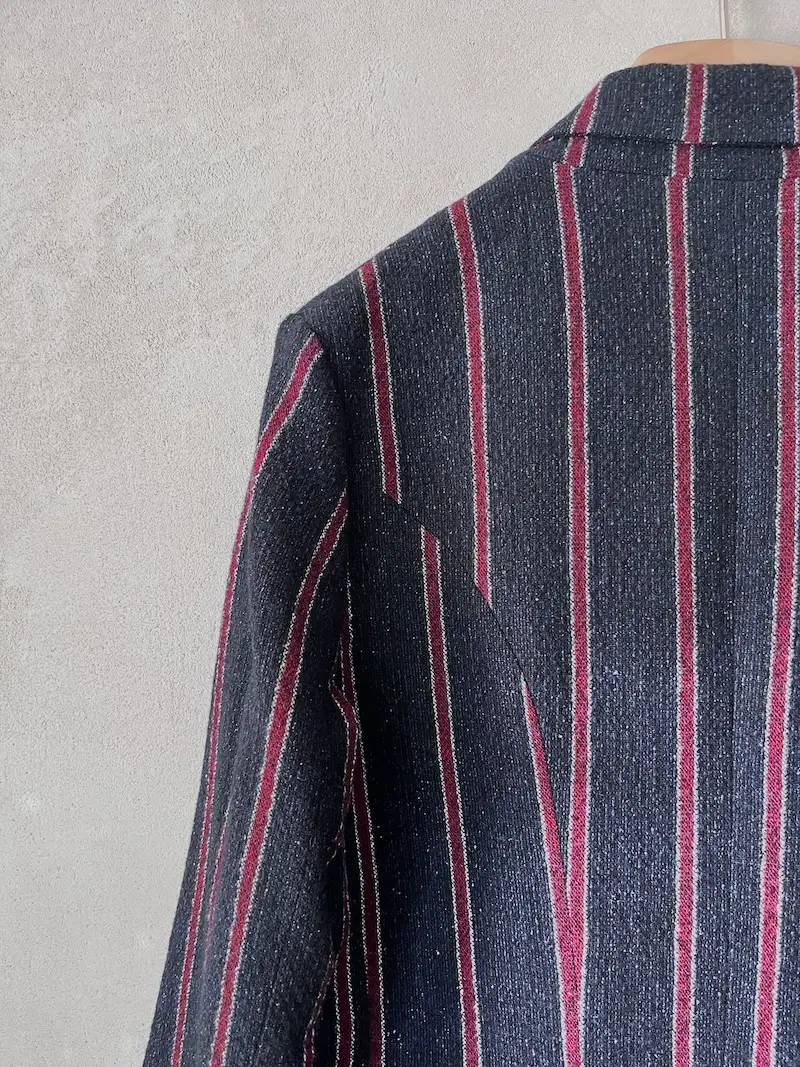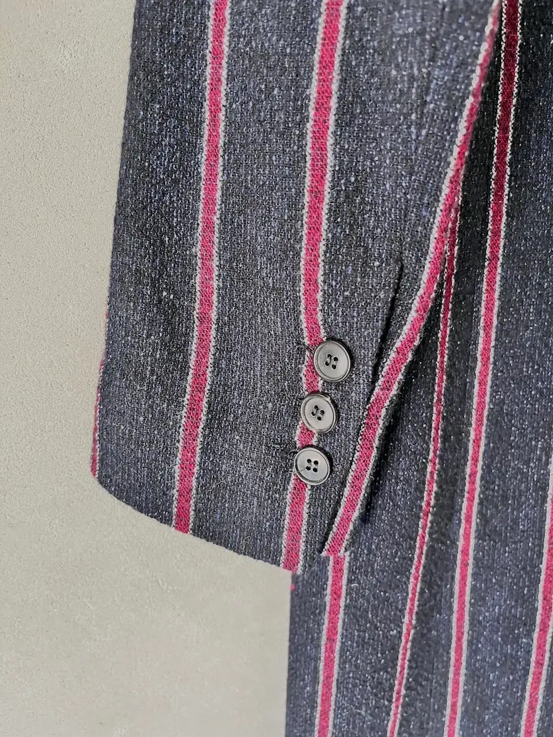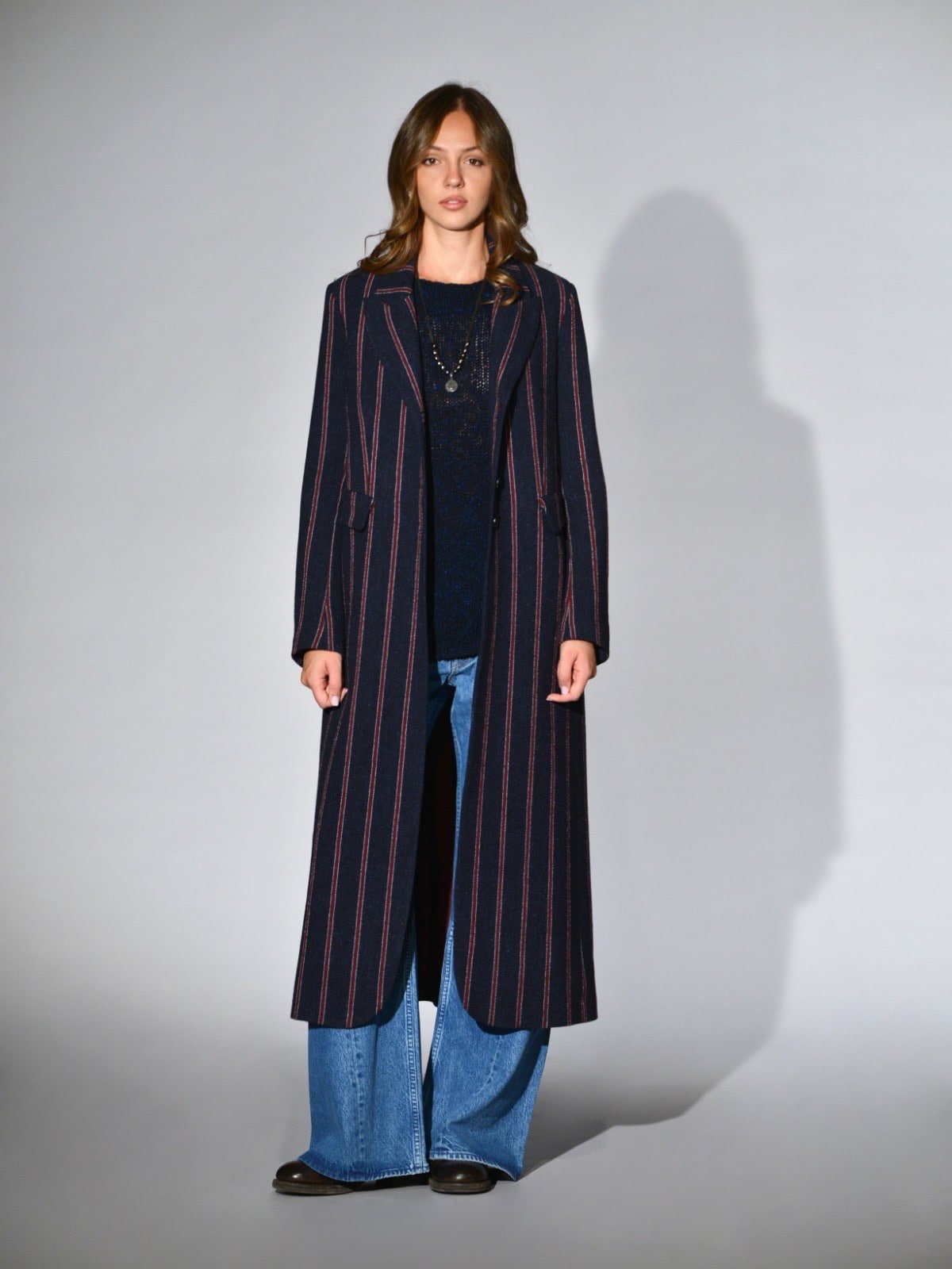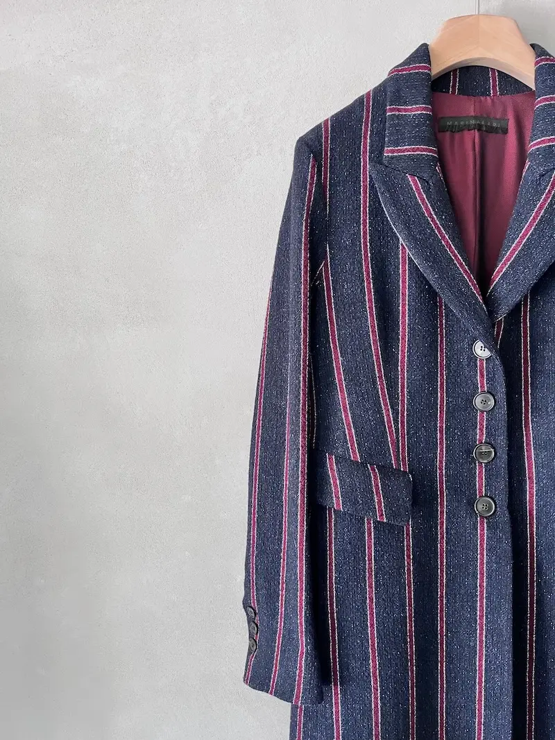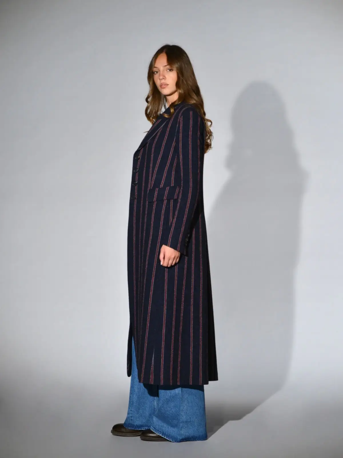 Cappotto lungo in tessuto di lana rigato, completamente foderato, chiuso con quattro asole e bottoni, due tasche a filetto con patta più due tasche laterali in cucitura, manica con polso chiuso con tre asole e bottoni. Lunghezza 128 cm, circonferenza torace 96 cm, circonferenza fianchi 106 cm, le misure delle taglie successive aumenteranno 2 cm in lunghezza e 4 cm in circonferenza.