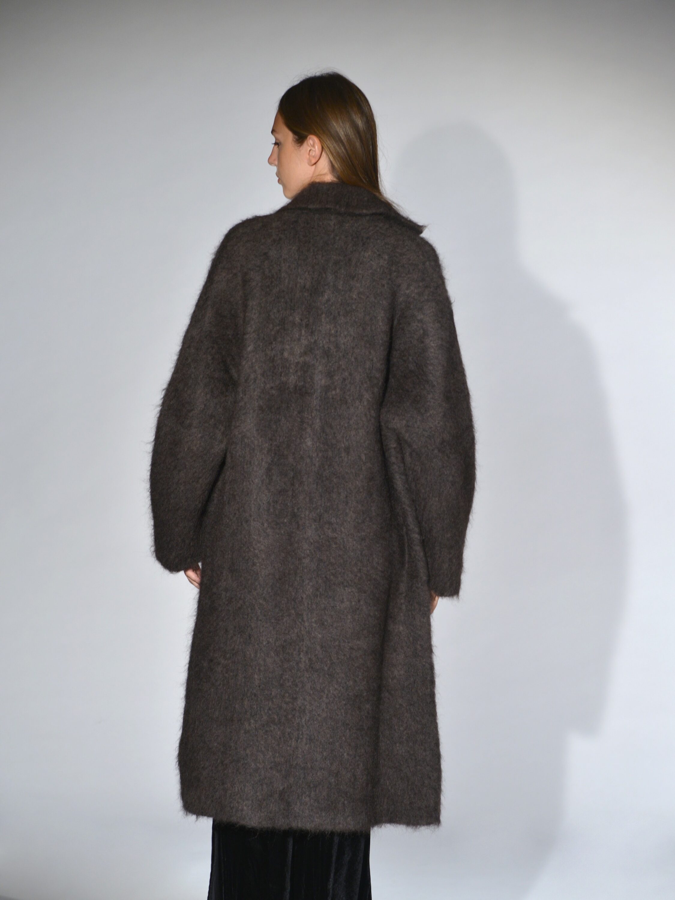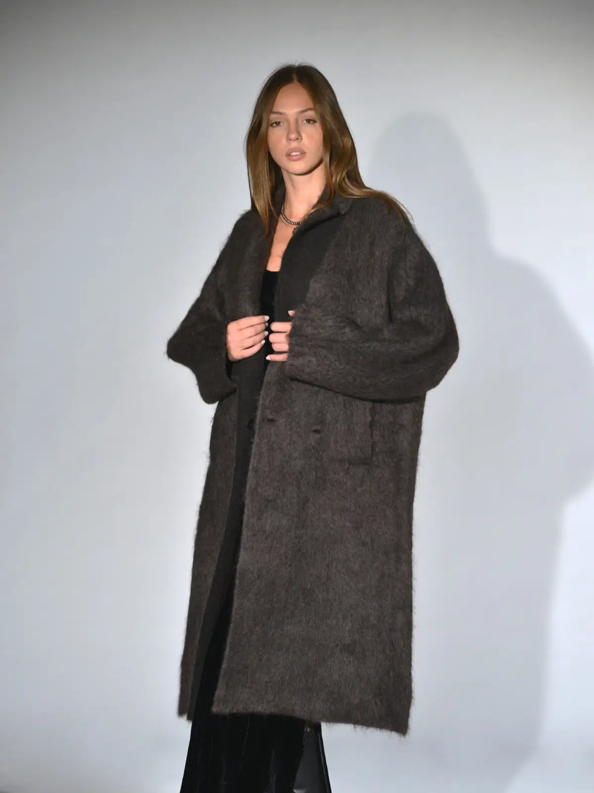 Cappotto doppiopetto in filati misti melange. Questo capo è particolarmente morbido e caldo con una vestibilità oversize interamente prodotto in Italia. Spalla calata, ampio giro manica, chiuso con quattro asole e bottoni a scomparsa, due tasche verticali con patta. . Misure taglia XS: lunghezza 114 cm, larghezza torace 60 cm. Le misure delle taglie successive aumenteranno 2 cm in lunghezza e 4 cm in circonferenza.