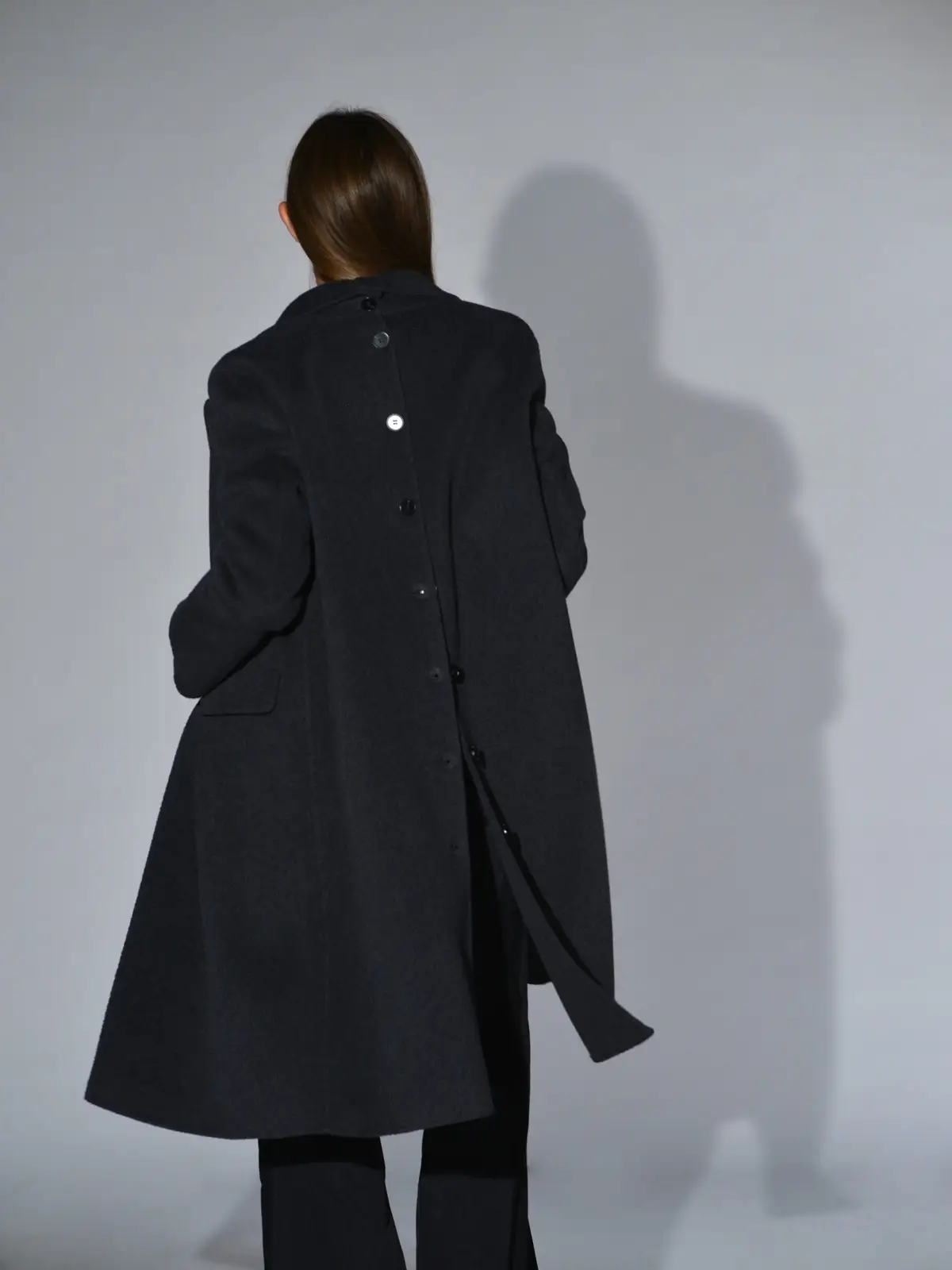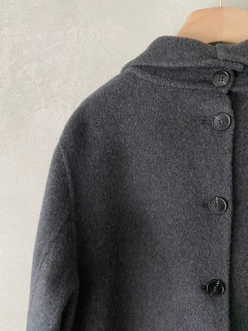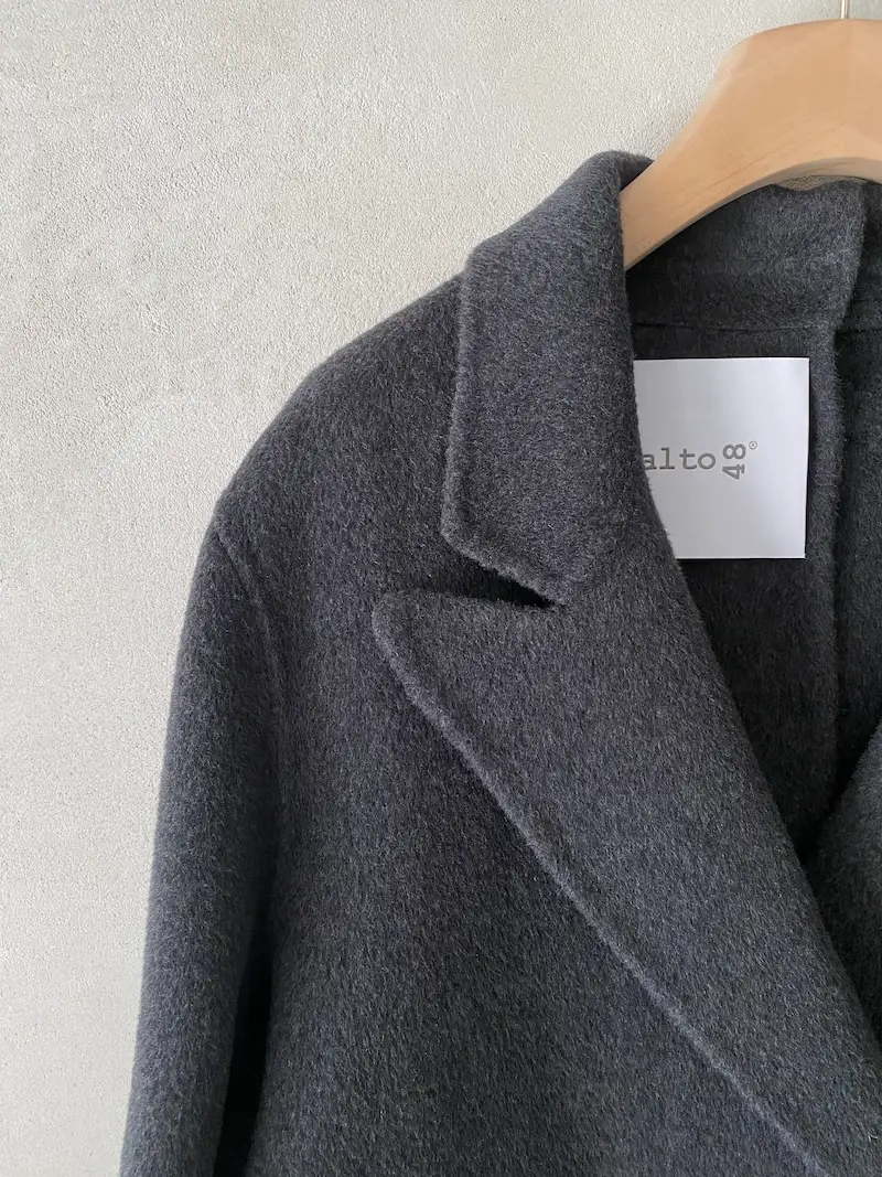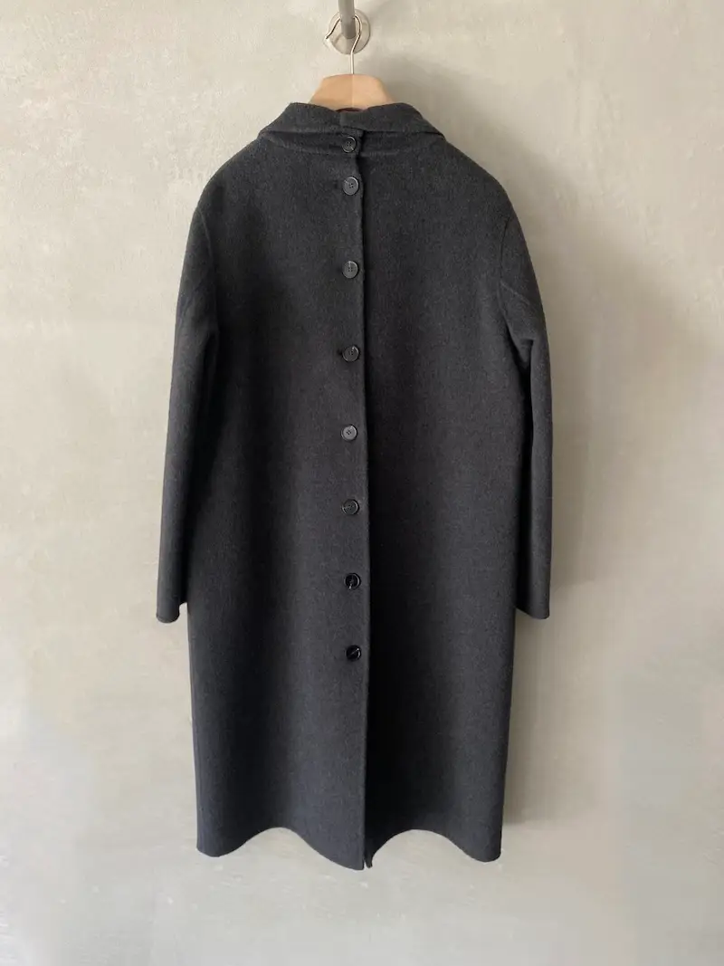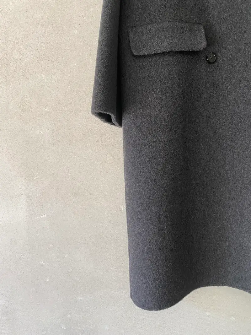 Cappotto doppiopetto oversize in doppio panno di lana e cashmere con impunture cucite a mano, ampi rever, 2 tasche a filetto con patta, sfoderato, spalla calata, centro dietro chiuso con 9 asole e bottoni. Misure taglia 40: lunghezza 108, larghezza 58 cm. Le misure delle taglie successive aumenteranno 2 cm in lunghezza e 4 cm in circonferenza.