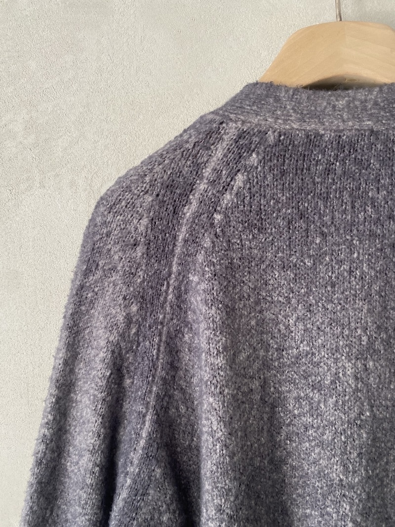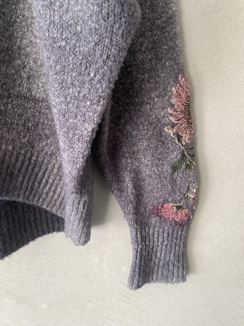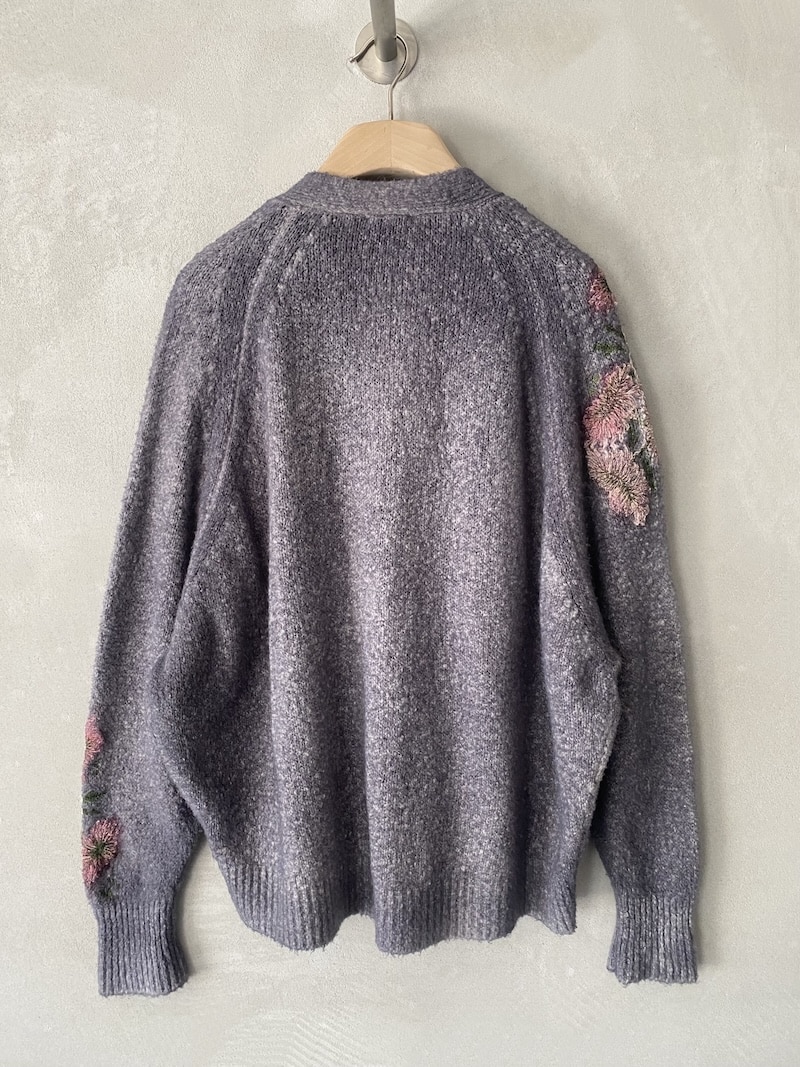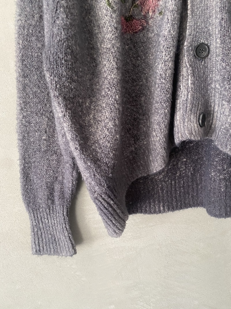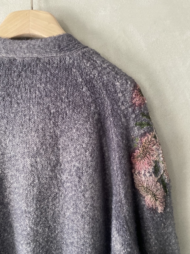 Cardigan over in maglia morbida, lavorazione effetto mélange con ricami floreali applicati e spruzzature a mano. Scollo a V con apertura frontale. Spalla con costruzione semi-raglan. Manica lunga con polso a costina. Linea ampia, volume morbido. Fondo con bordo a costina. Chiusura frontale con bottoni. Vestibilità ampia.