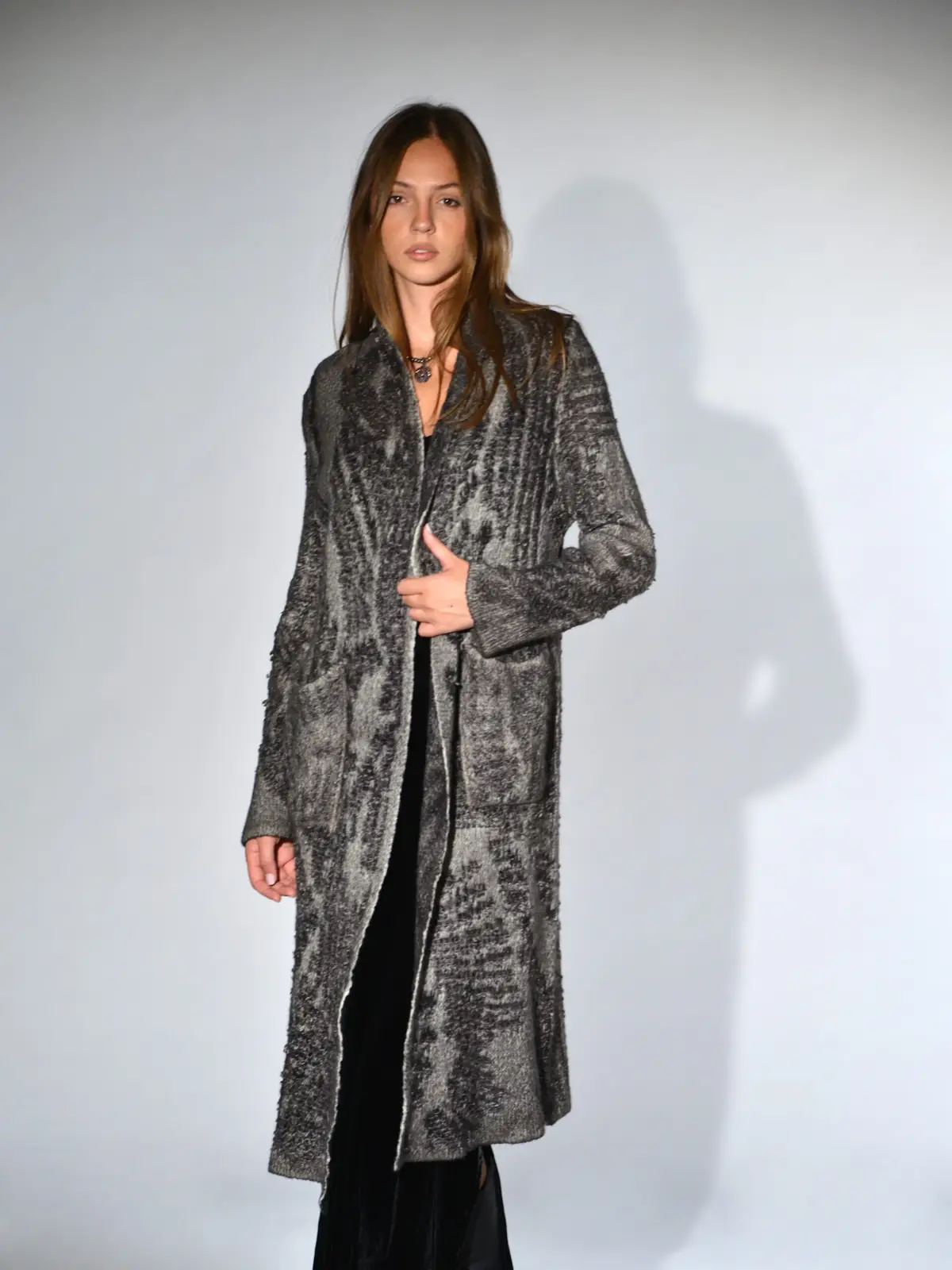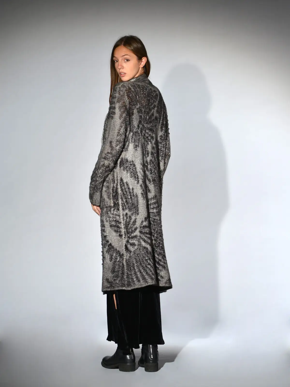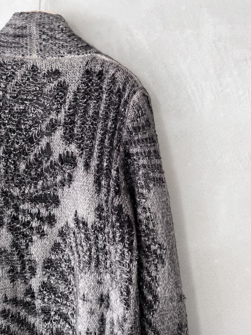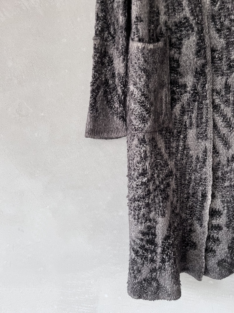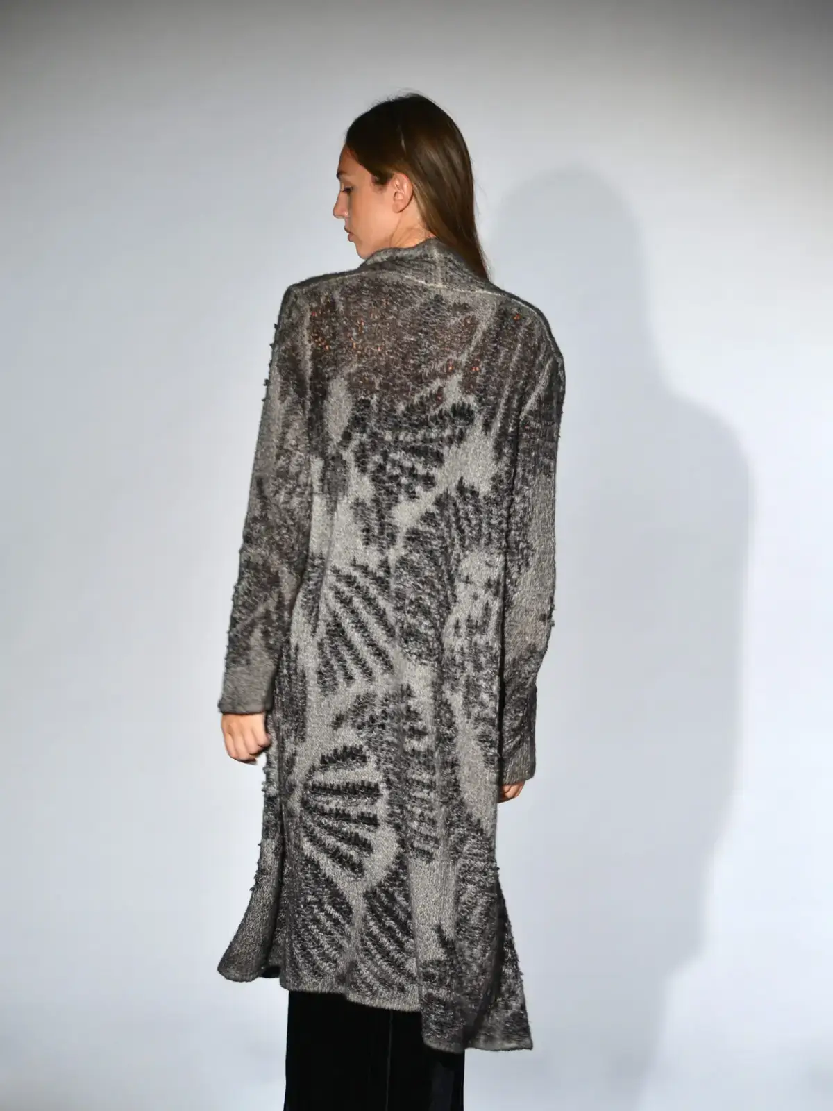 Cardigan realizzato con filati misti e punto maglia traforato, dipinto a mano, aperto davanti, senza bottoni, due ampie tasche a toppa, manica lunga. Misure taglia XS: lunghezza 122 cm, larghezza 54 cm. Le misure delle taglie successive aumenteranno 2 cm in lunghezza e 4 cm in circonferenza.