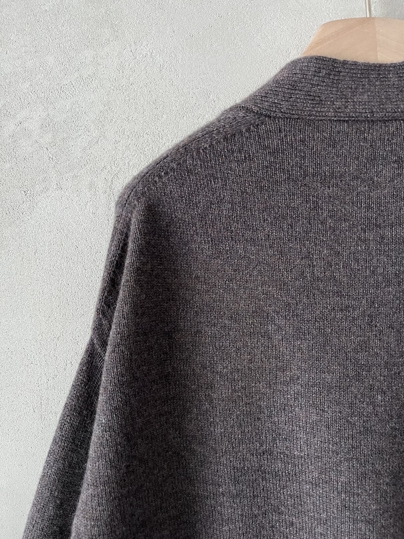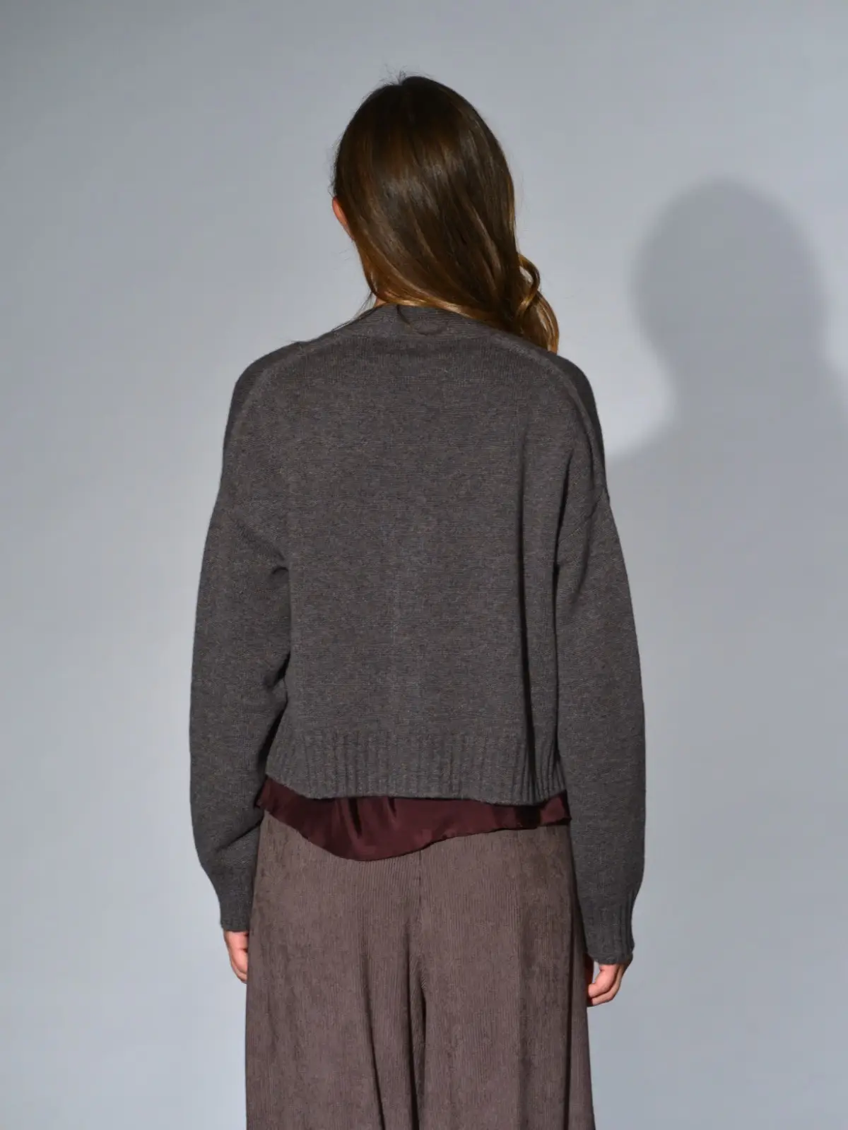 Cardigan over corto in cashmere melange, chiuso davanti a V con 3 asole e bottoni di madreperla, due tasche a toppa, spalla calata. Misure taglia I: lunghezza 50 cm, larghezza 53 cm. Le misure della taglia successiva aumenteranno 3 cm in lunghezza e 6 cm in circonferenza.