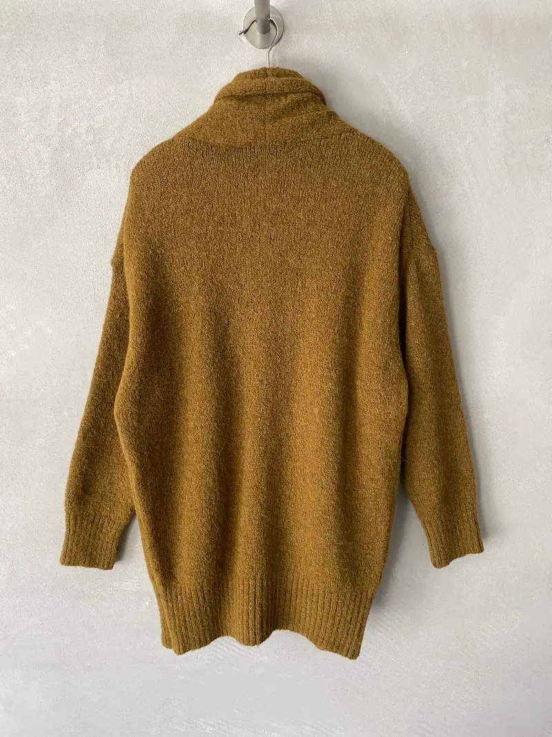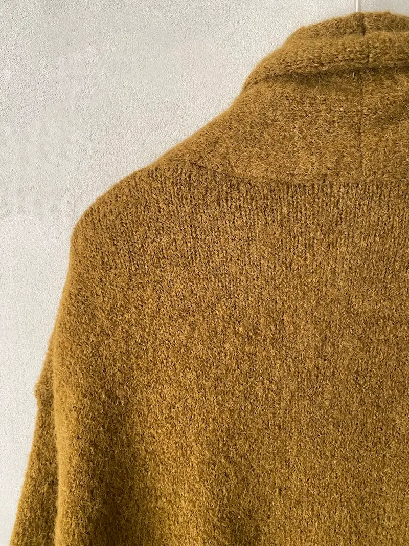 Cardigan lungo over in alpaca e lana vergine, collo sciallato, spalla calata. Misure taglia 38: lunghezza 80 cm, larghezza torace 60 cm, larghezza fondo 50 cm. Le misure delle taglie successive aumenteranno 2 cm in lunghezza e 4 cm in circonferenza.