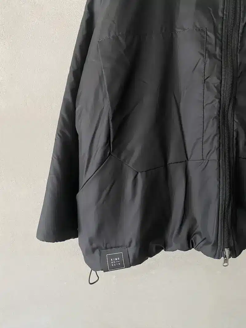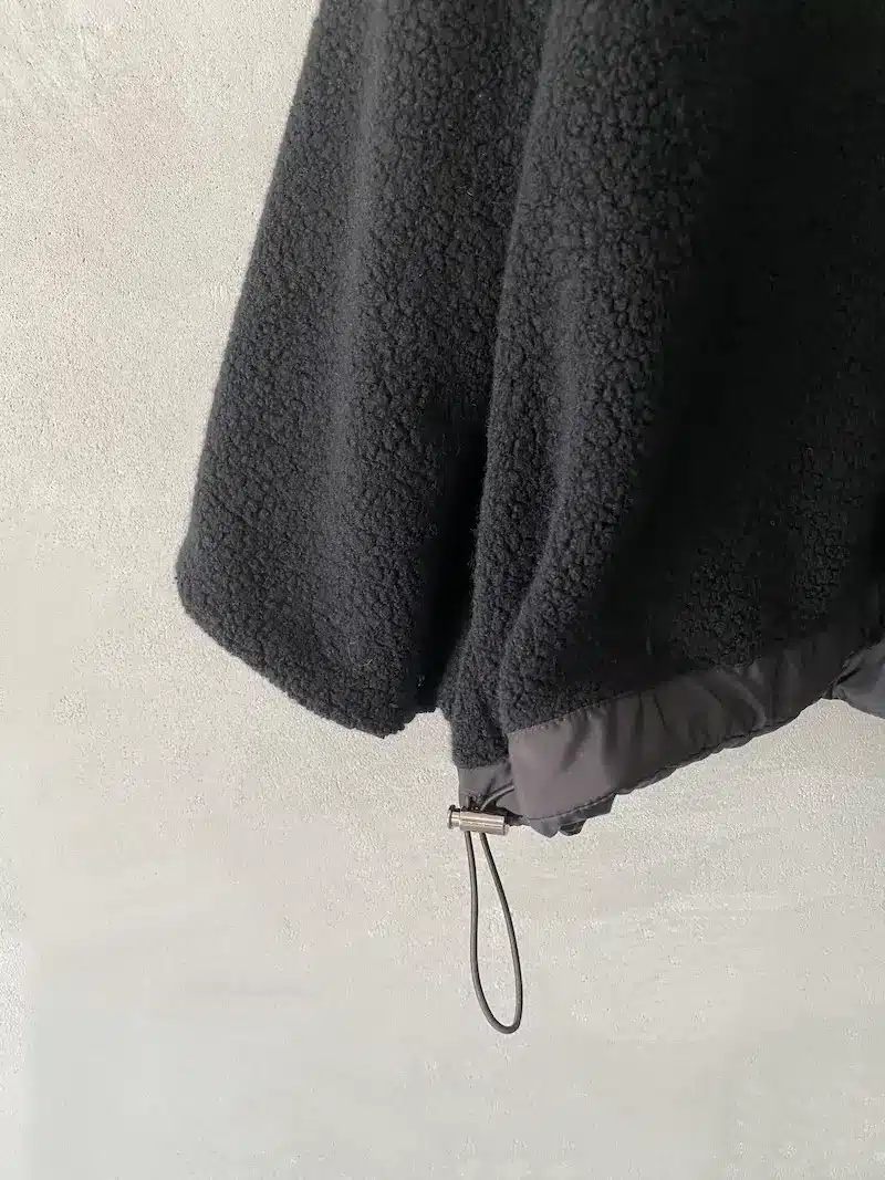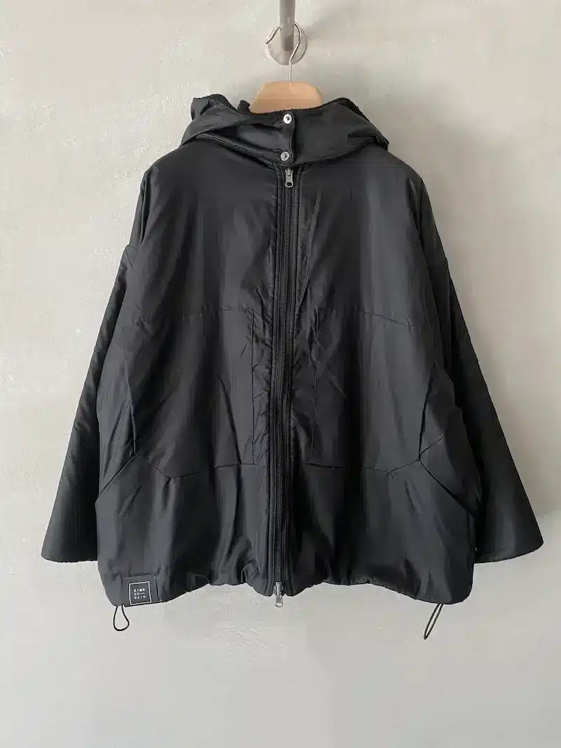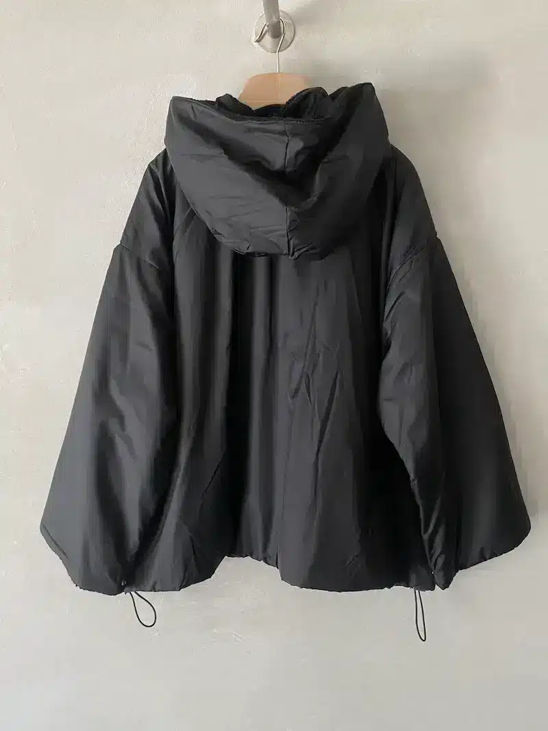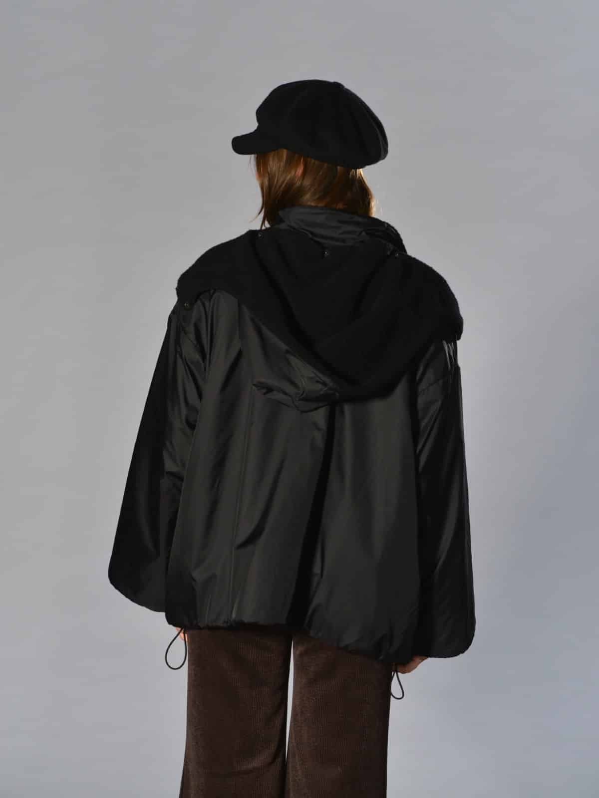 Giacca bomber con cappuccio rimovibile, completamente reversibile, vestibilità oversize, 2 ampie tasche oblique laterali più 2 tasche a marsupio, chiusura centrale davanti con lampo a vista, interno foderato con tessuto di lana e fibre miste, polso chiuso con automatico. Misure taglia S: lunghezze 70 cm, larghezza 70 cm. Le misure delle taglie successive aumenteranno 4 cm in circonferenza e 2 cm in lunghezza.