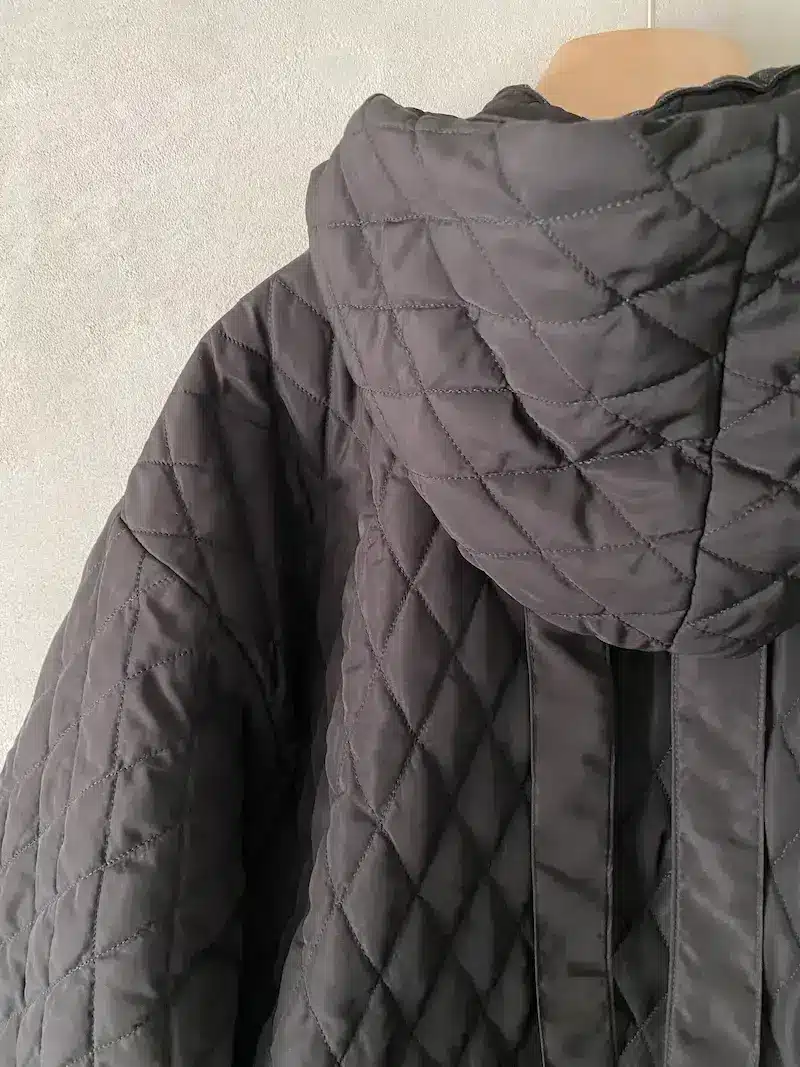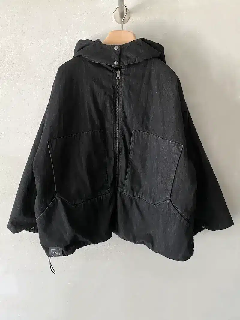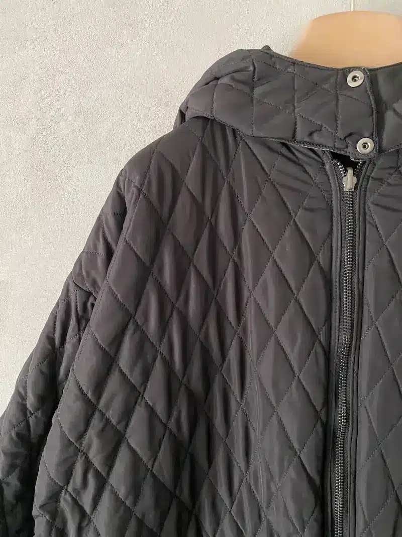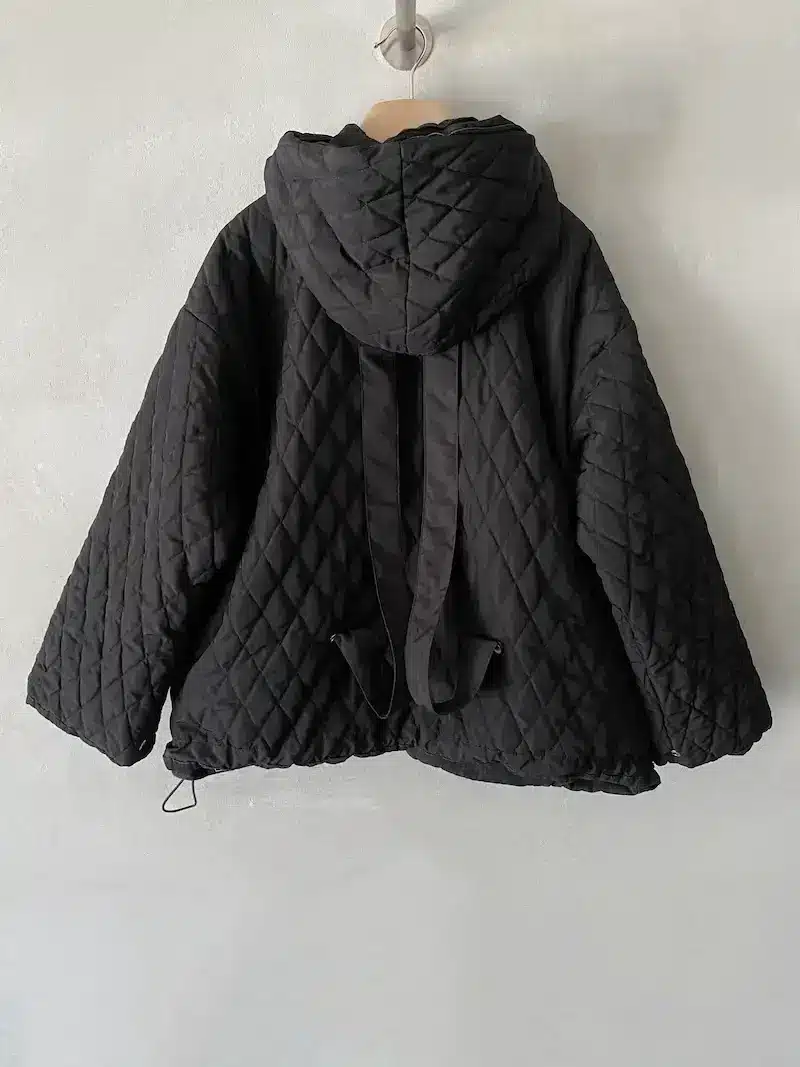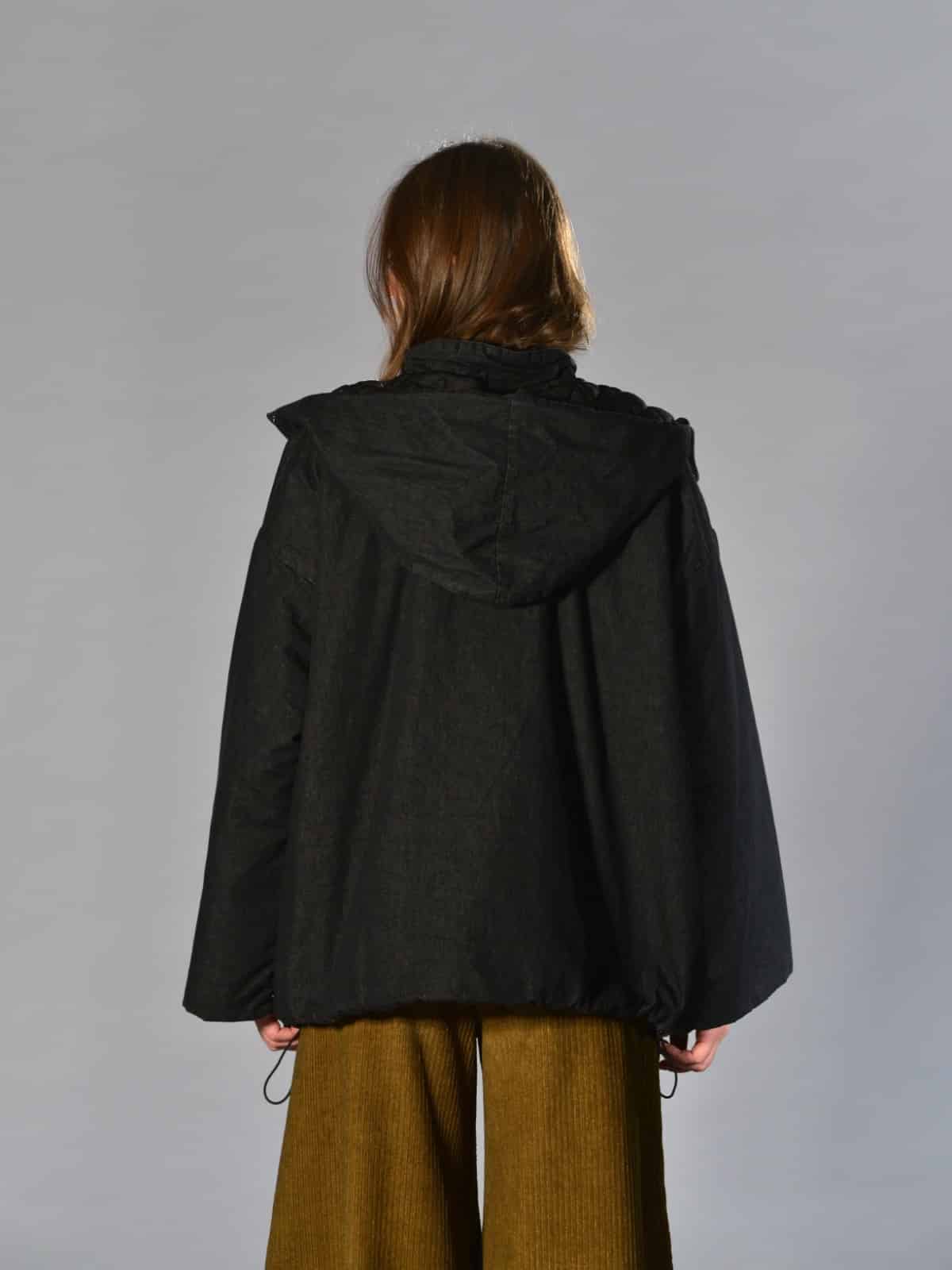 Giacca bomber con cappuccio rimovibile, vestibilità oversize, 2 ampie tasche oblique laterali più 2 tasche a marsupio, chiusura centrale davanti con lampo a vista, imbottitura con trapunta, polso chiuso con automatico. Misure taglia S: lunghezze 70 cm, larghezza 70 cm. Le misure delle taglie successive aumenteranno 4 cm in circonferenza e 2 cm in lunghezza.