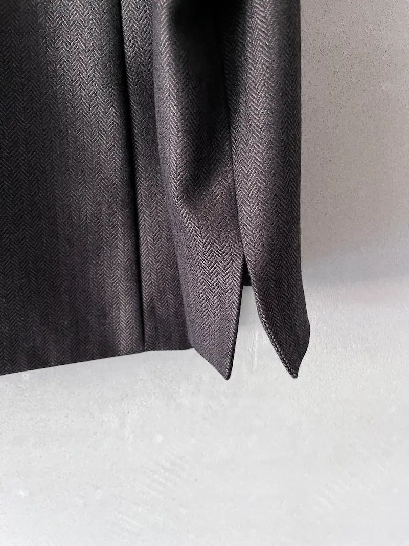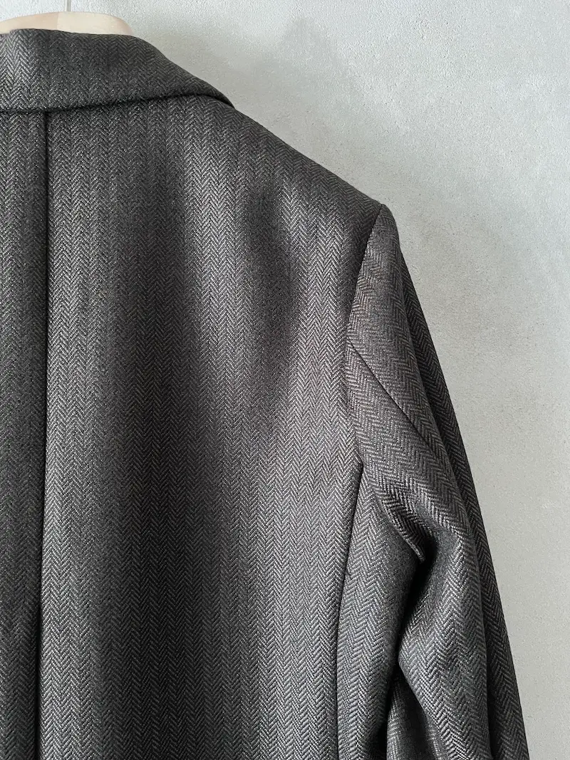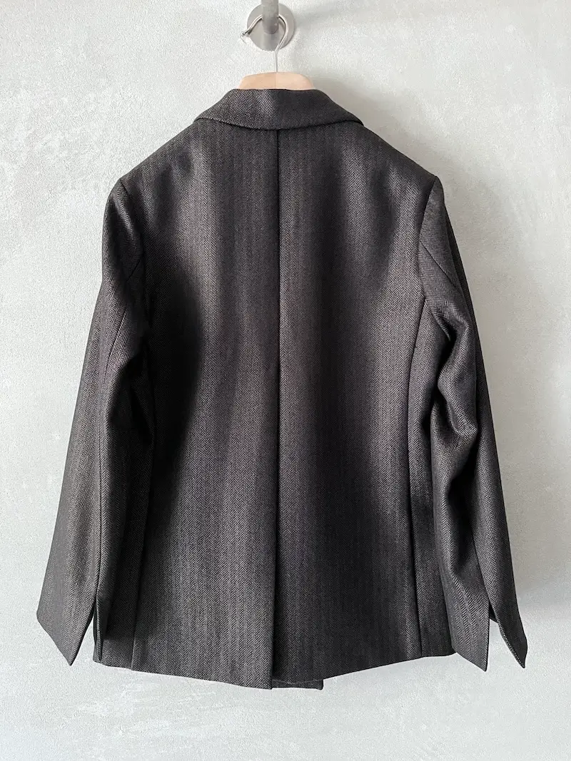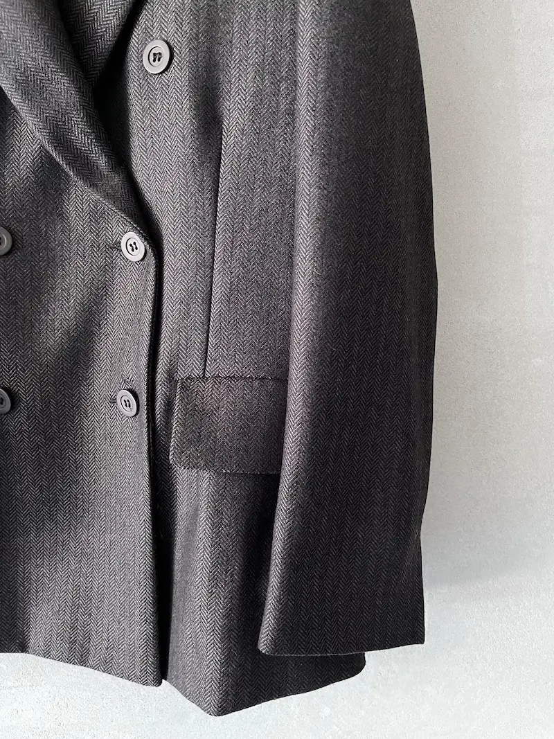 Giacca doppiopetto in tessuto di lana e cashmere spigato, spalle e maniche foderate, collo a lancia, chiusa con 6 bottoni + 1 interno in madreperla, 2 tasche laterali a filetto con patta, manica al polso con spacco, spacco alto al centro dietro. Misure taglia 38: lunghezza 65 cm, circonferenza torace 90 cm. Le misure delle taglie successive aumenteranno 1 cm in lunghezza e 4 cm in circonferenza.