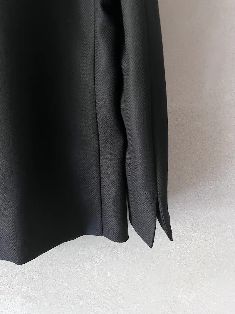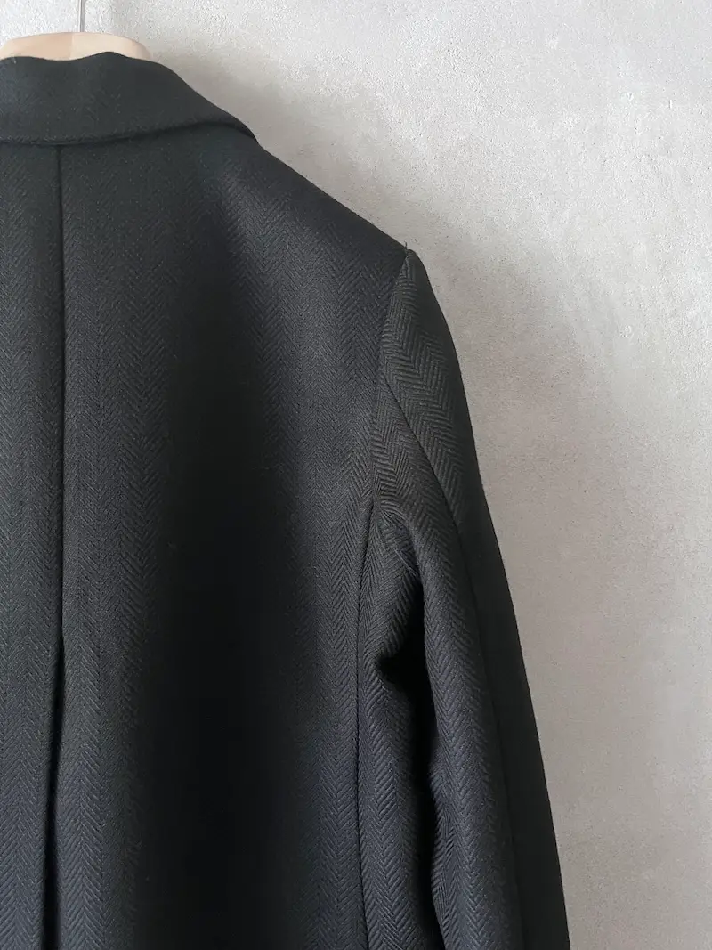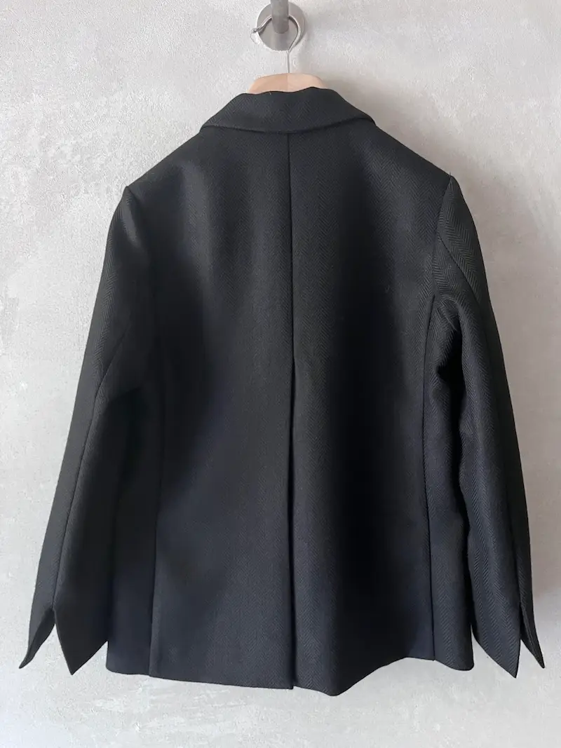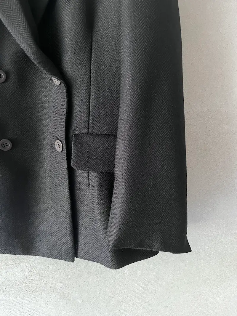Giacca doppiopetto bicolore in tessuto di lana spigato, spalle e maniche foderate, collo a lancia, chiusa con 6 bottoni + 1 interno in madreperla, 2 tasche laterali a filetto con patta, manica al polso con spacco, spacco alto al centro dietro. Misure taglia 38: lunghezza 65 cm, circonferenza torace 90 cm. Le misure delle taglie successive aumenteranno 1 cm in lunghezza e 4 cm in circonferenza.
