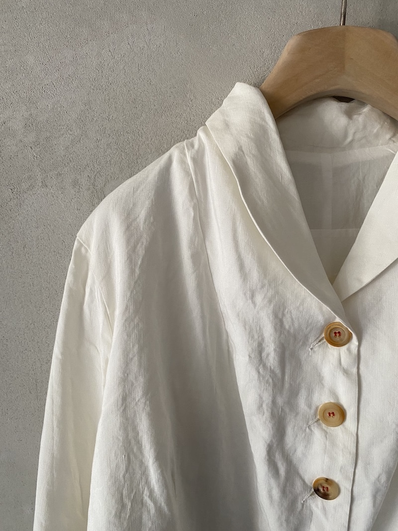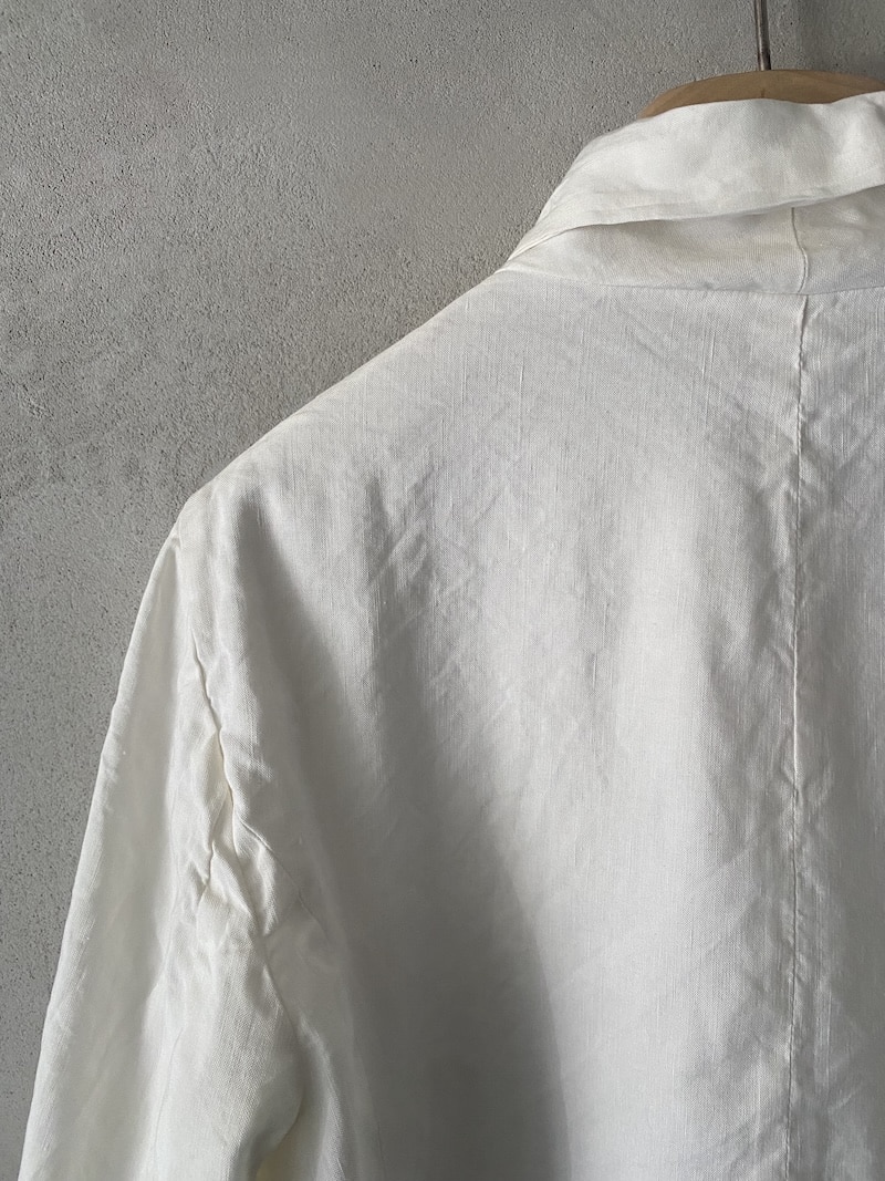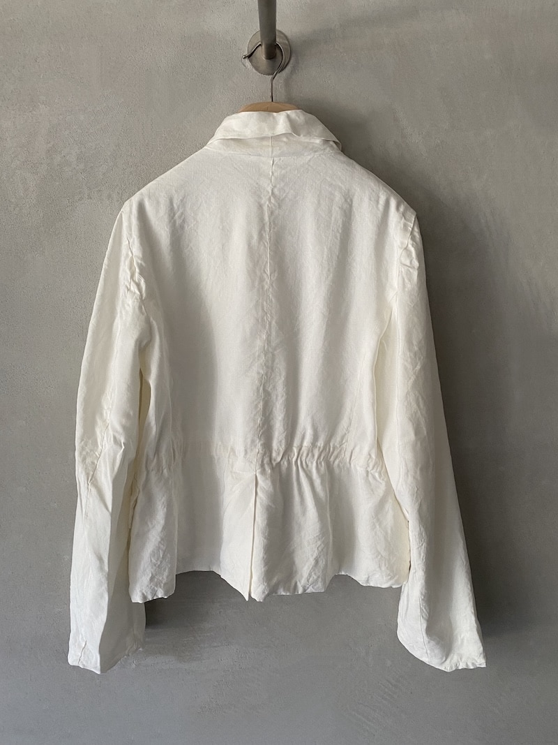 Giacca destrutturata in lino e seta con effetto leggermente stropicciato, completamente foderata in cotone. Spalle calate e collo con rever sciallato. Chiusura frontale con 5 bottoni. Due tasche a filetto con patta sul davanti. Coulisse regolabile in vita che permette di modulare il volume e creare un leggero arriccio definendo la silhouette. Sul retro è presente uno spacco centrale che dona movimento al capo. Linea morbida con vestibilità rilassata.