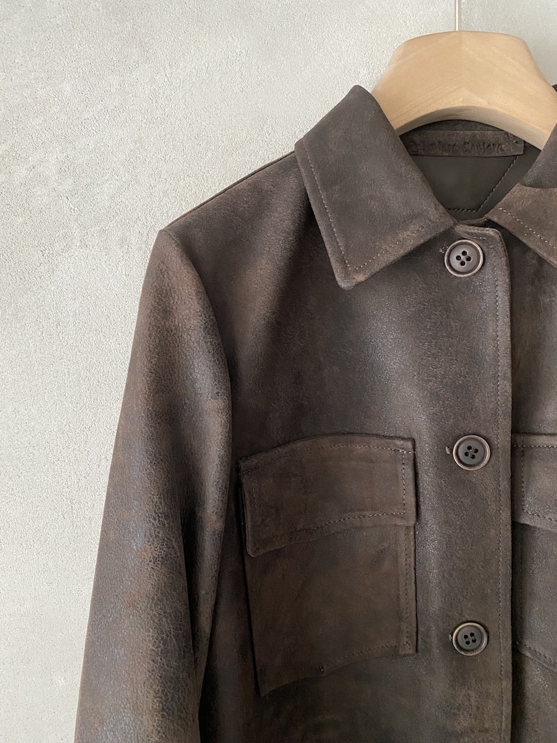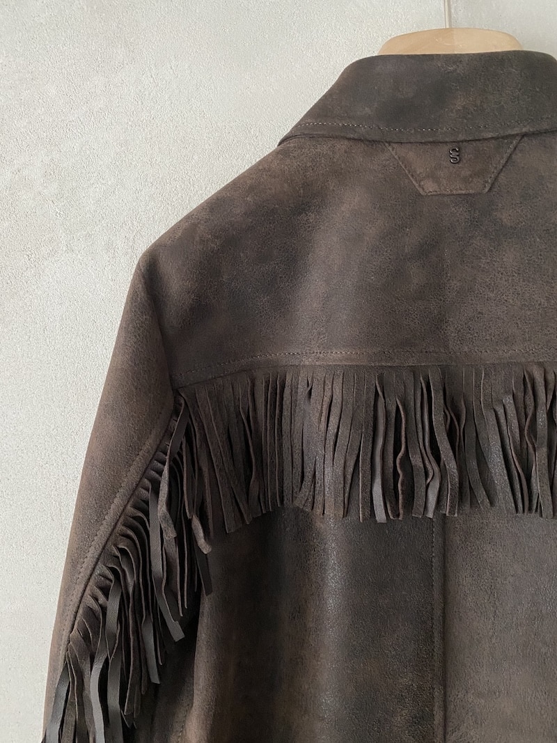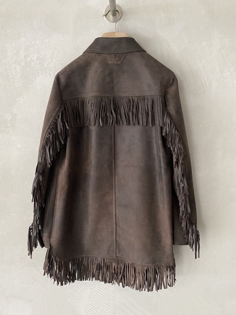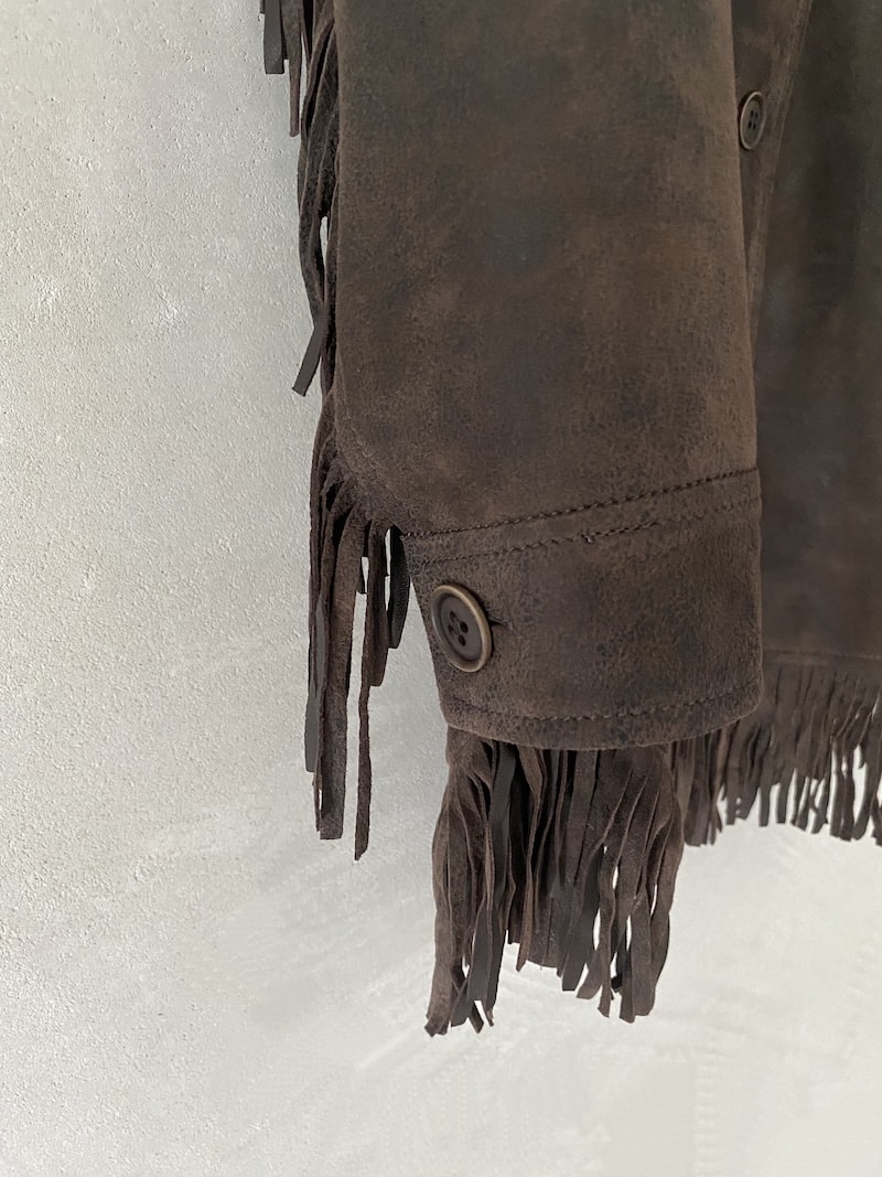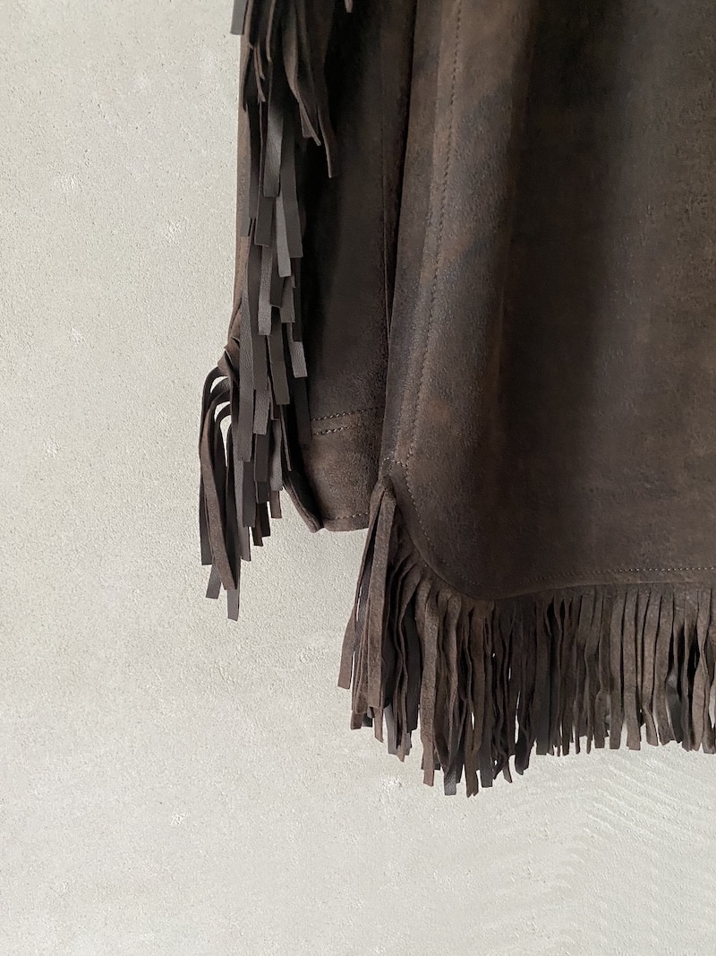Giacca 3/4 in camoscio invecchiato. Completamente sfoderata con frange decorative su spalle, maniche e orlo. Chiusura centrale frontale a quattro bottoni e asole. Dotata di due tasche alte a toppa con patta e due tasche oblique. Spalle, maniche e orlo rifiniti con frange. Maniche lunghe con polsino chiuso da un bottone. Vestibilità regolare.