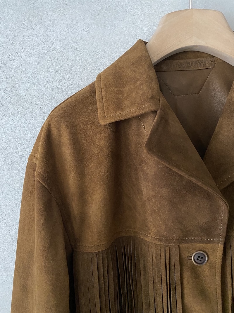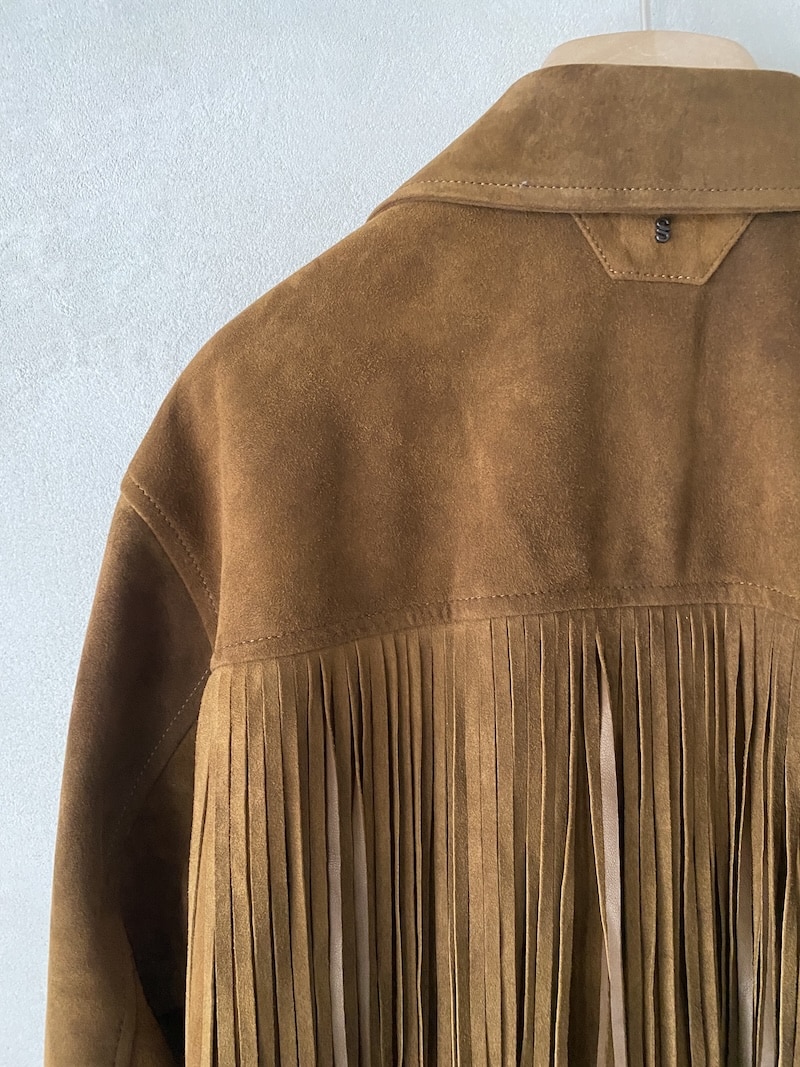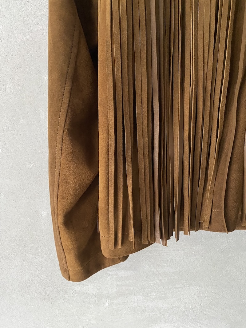 Giacca in camoscio naturale. Completamente sfoderata, con frange decorative sul davanti e sul retro. Chiusura centrale frontale a tre bottoni e asole. Dotata di due tasche laterali inserite in cucitura. Vestibilità regolare.