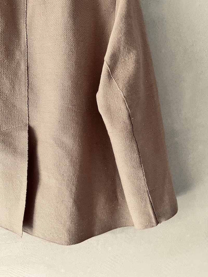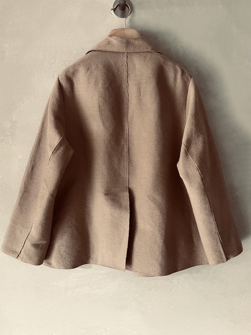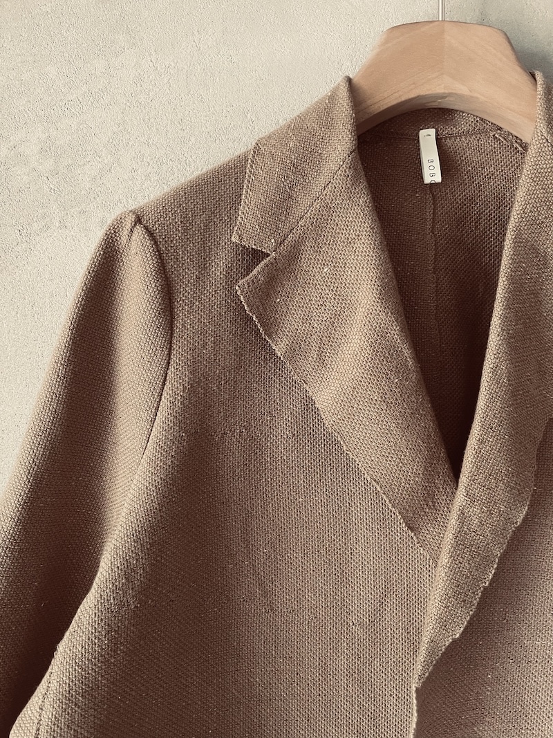 Giacca over in maglia di cotone, lino e seta con lavorazione effetto stuoia, realizzata su macchine da maglieria senza tagli né assemblaggi tradizionali. Ogni parte è costruita direttamente in lavorazione, attraverso tecniche di maglieria che modellano il volume in modo naturale e strutturato.